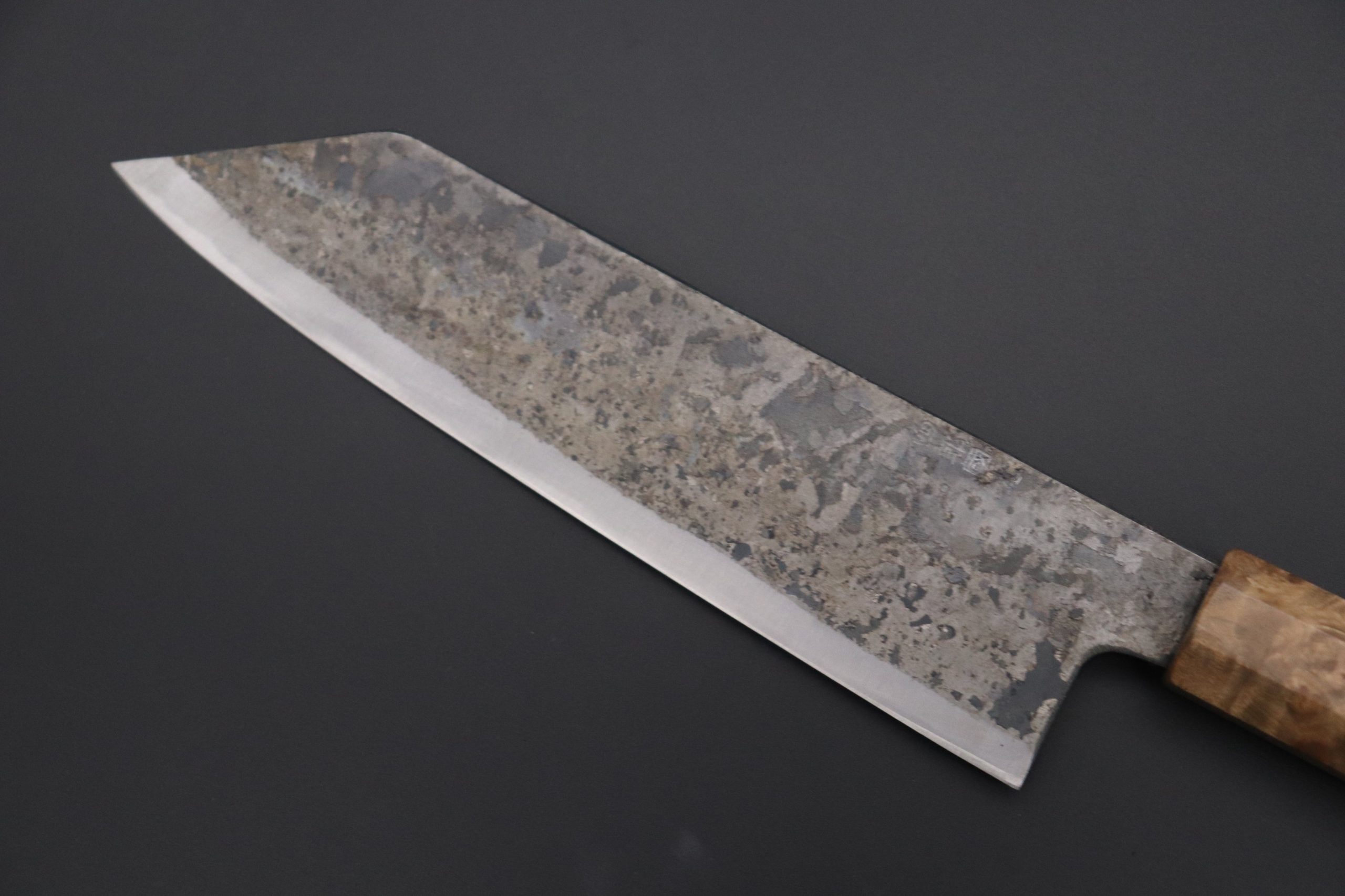 Each one of the unique Kurouchi (“Black forged”) finished blades has an uneven surface and a non-uniform finish. So, if you are looking for a very neat knife, with precise details and great ‘fit & finish’, these Shirou-Kunimitsu handmade traditional forged knives are not well suited to your preferences. However, at the same time, we really appreciate the originality and artisanal spirit of these knives and we think the traditional Kurouchi finish is something really special — We can feel the WABI-SABI aesthetics striking at our hearts and we hope our customers will feel the same way.