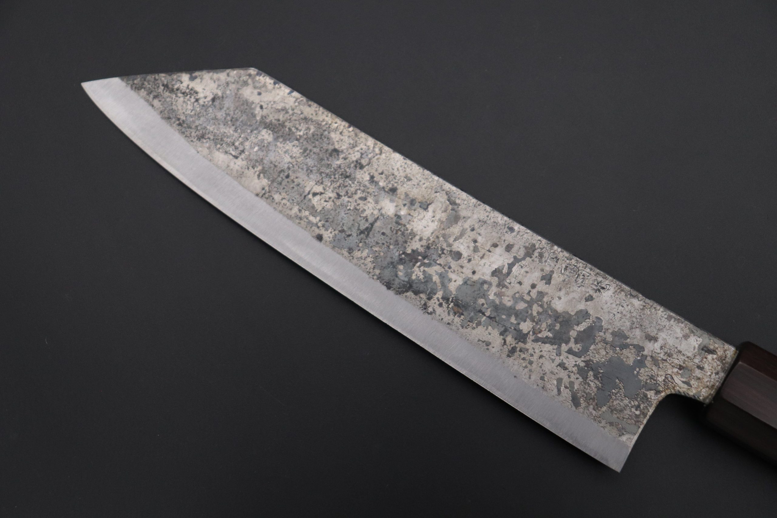 Each one of the unique Kurouchi (“Black forged”) finished blades has an uneven surface and a non-uniform finish. So, if you are looking for a very neat knife, with precise details and great ‘fit & finish’, these Shirou-Kunimitsu handmade traditional forged knives are not well suited to your preferences. However, at the same time, we really appreciate the originality and artisanal spirit of these knives and we think the traditional Kurouchi finish is something really special — We can feel the WABI-SABI aesthetics striking at our hearts and we hope our customers will feel the same way.