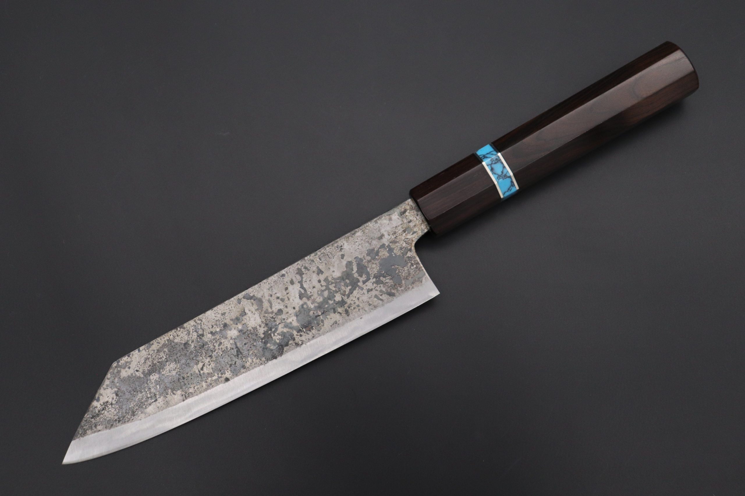 This Special Edition Bunka Knife with Contemporary, Stylish Wa Handle. The Innovative Octagonal Ebonywood Handle with Composite Turquoise Gemstone Ring and Nickel Silver Spacers.