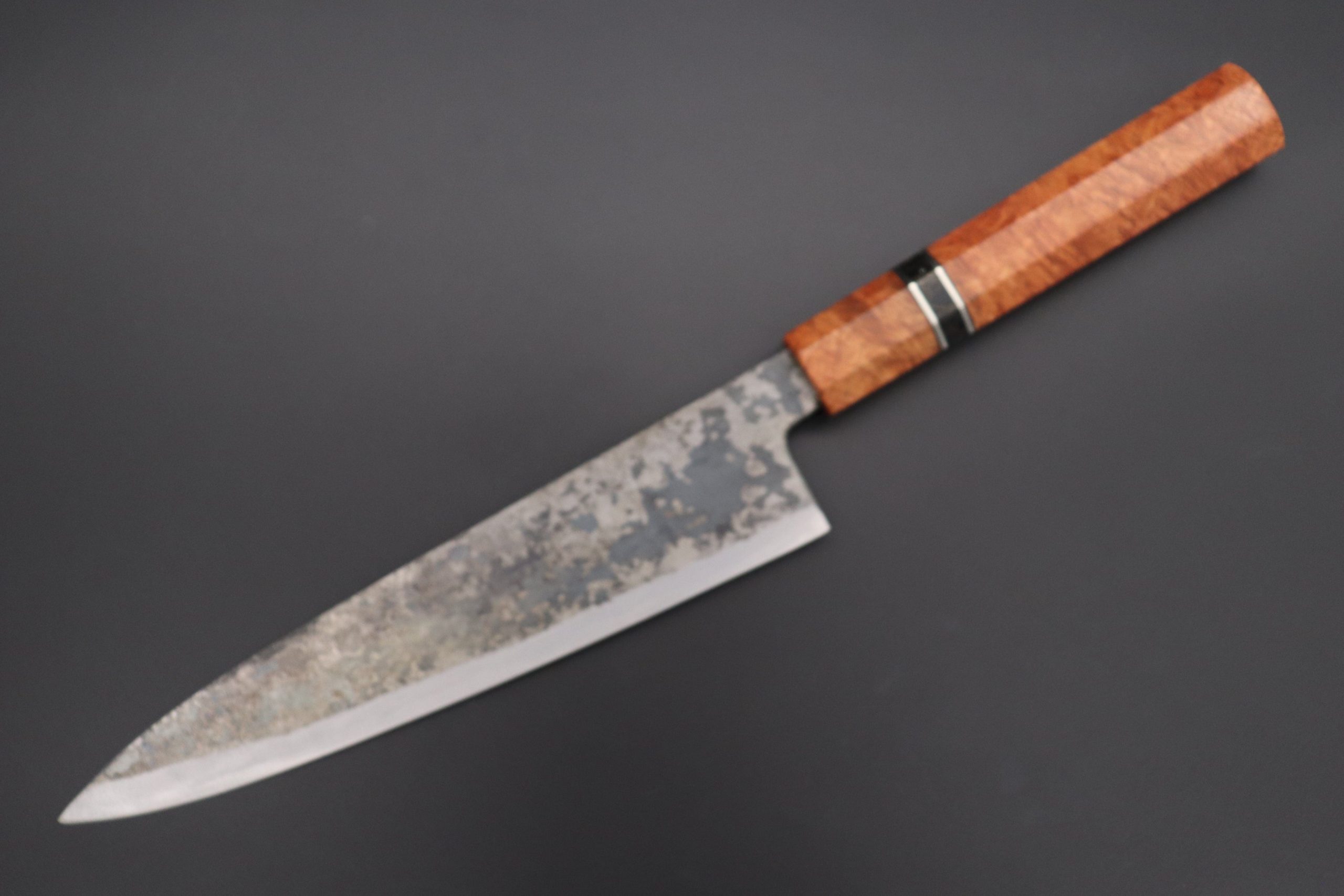 This Special Edition Wa Gyuto Knife with Contemporary, Stylish Wa Handle. The Innovative Octagonal Bubinga Burl Wood Handle with Composite Black Color Turquoise Gemstone Ring and Nickel Silver Spacers.