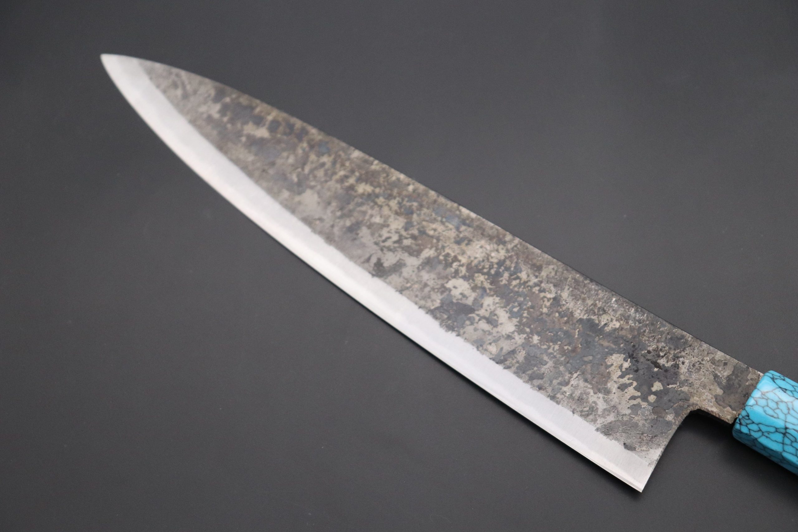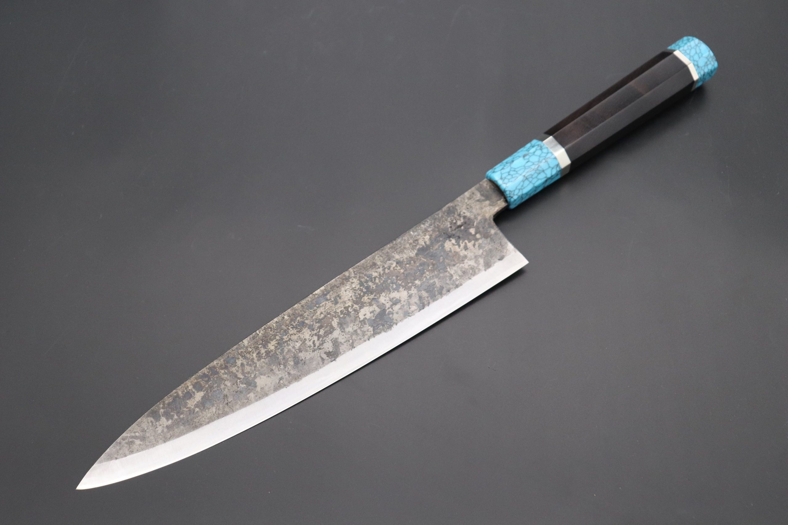 This Special Edition Wa Gyuto Knife with Contemporary, Stylish Wa Handle. The Innovative Octagonal Ebonywood handle with Turquoise Gem-Composite Stone Ferrule & Butt with Nickel Silver Spacers.