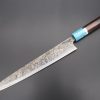 This Special Edition Wa Sujihiki Knife with Contemporary, Stylish Wa Handle. The Innovative Octagonal Ebonywood handle with a Tropical-Color-Turquoise Gem-Composite Stone Ferrule & Butt with Nickel Silver Spacers.