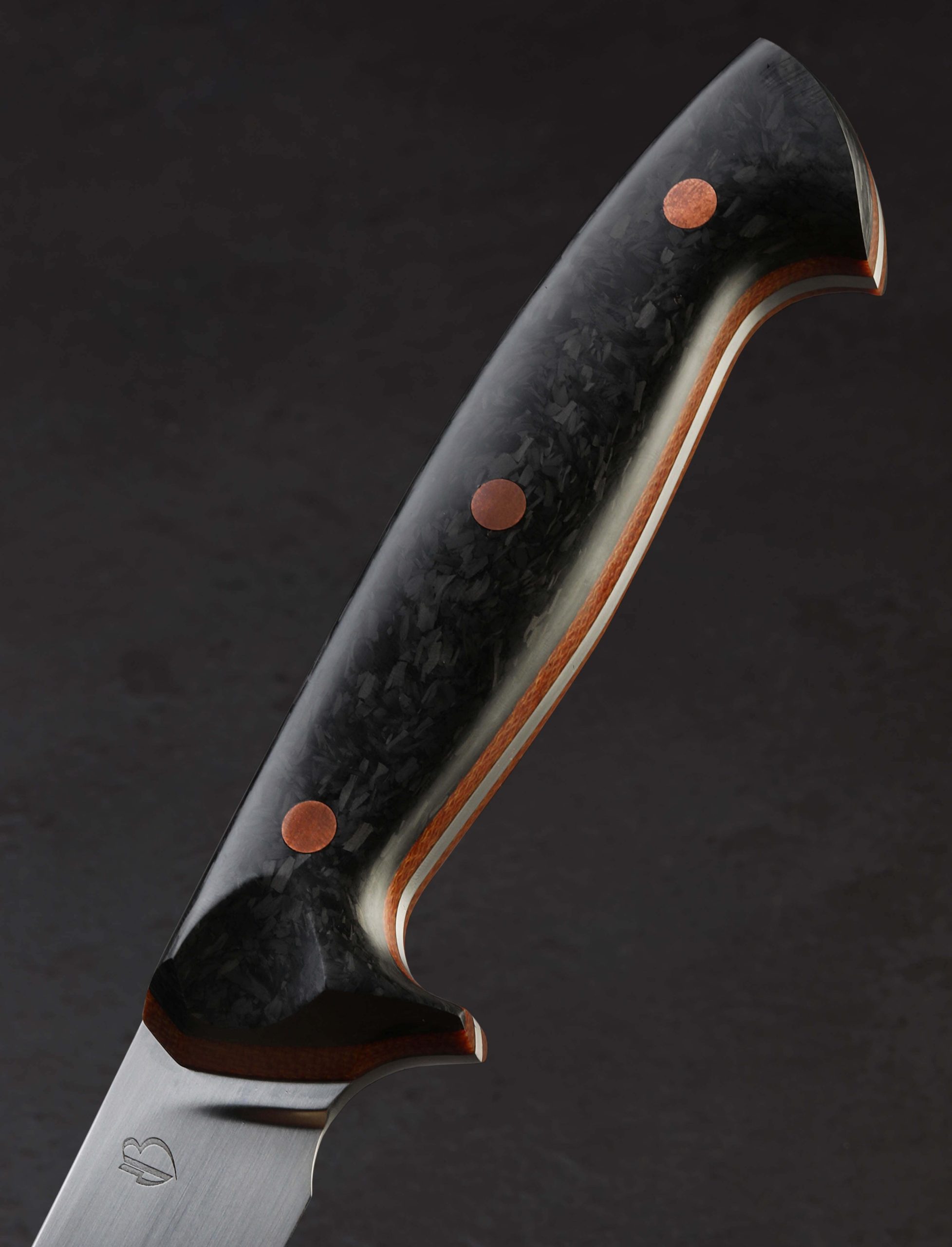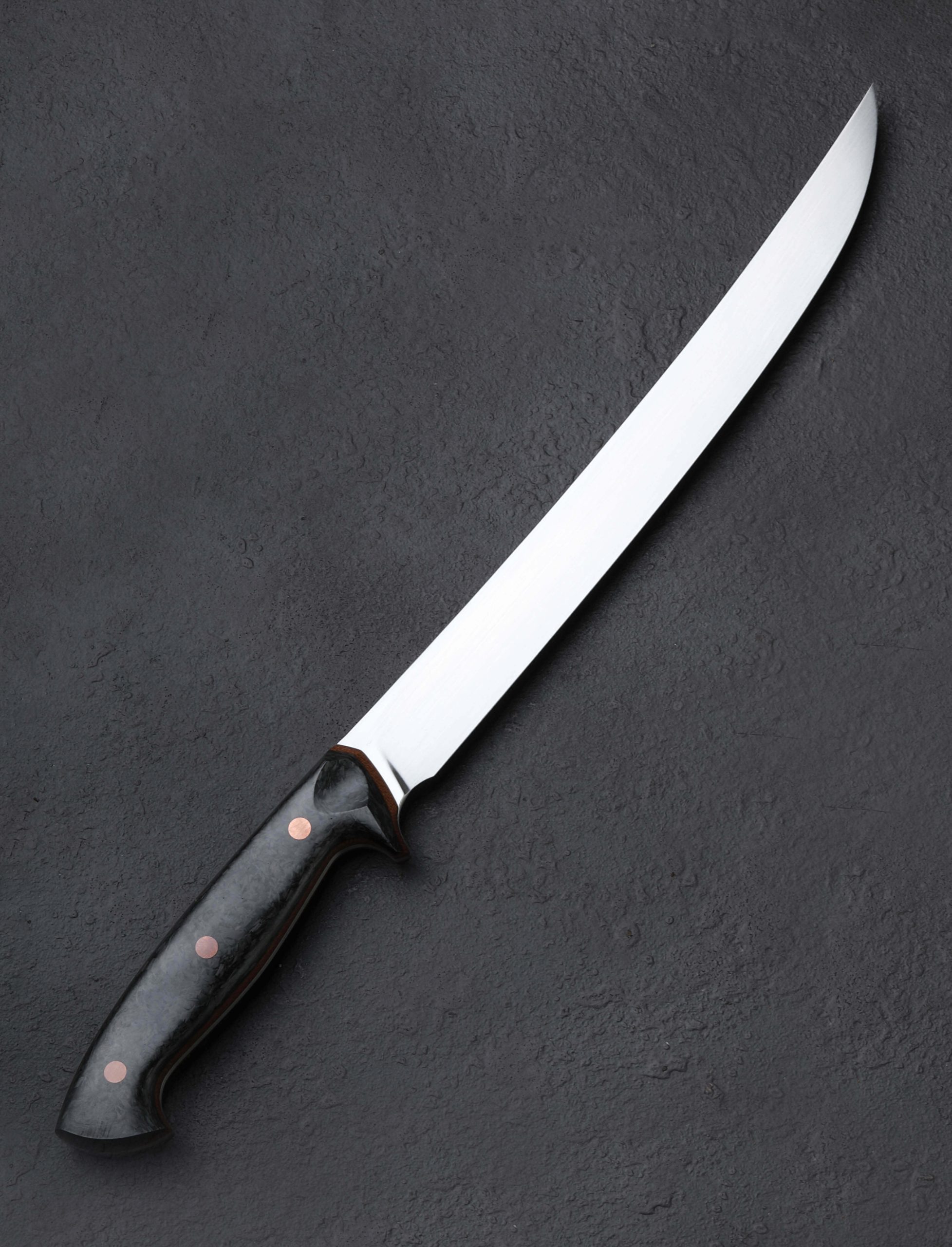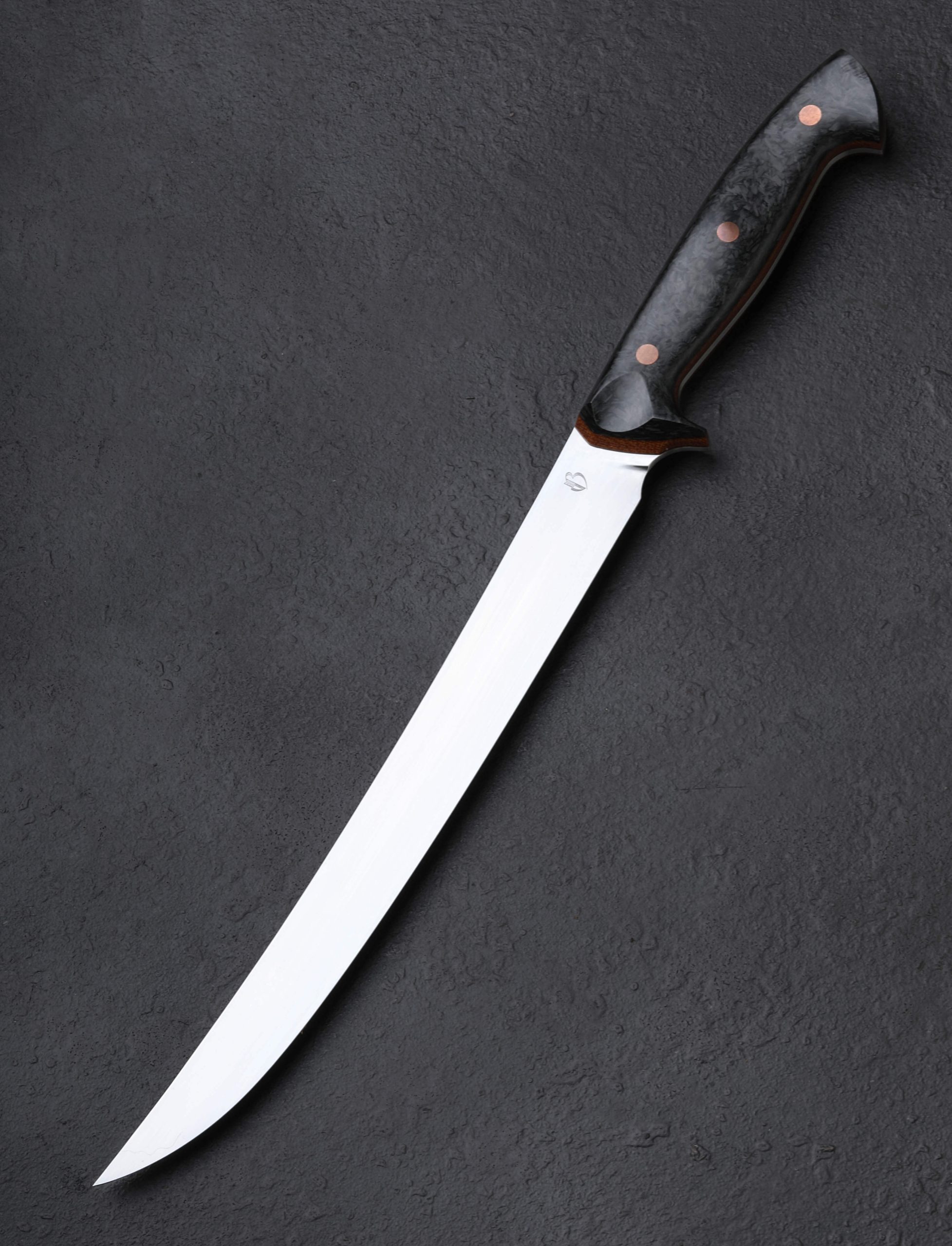With this strikingly handsome fillet knife, artist Dan Bidinger breaks briefly from his well-loved chef and gyuto blade profiles to craft a purpose-specific butcher’s tool. In AEB-L high-performance stainless steel, 249mm / 9.8″ of razor-sharp edge sit beneath superbly shaped bevels that feature Dan’s freehand convex geometry and a beautiful, silky satin finish. Gently rounded for a smooth touch and tapering forward, a taper most pronounced in the final inches before the slim, needle-like tip, the blade’s spine allows for only a touch of lateral flexibility, giving the tool a tough, hard-working, while still versatile feel. The corrosion-resistant steel is ideal for demanding work conditions and exposure to the elements while still maintaining a high hardness of 62 HRC at the edge. As elegant as the long, upswept blade may be, the handle gives it a run for its money in the ‘head-turning looks’ department. Sculpted for ergonomics, comfort, and control over a blade destined for big cuts is a handle sculpted from shredded carbon fiber layered atop liners of vintage micarta, all secured by three oversized, flush, copper bolts.