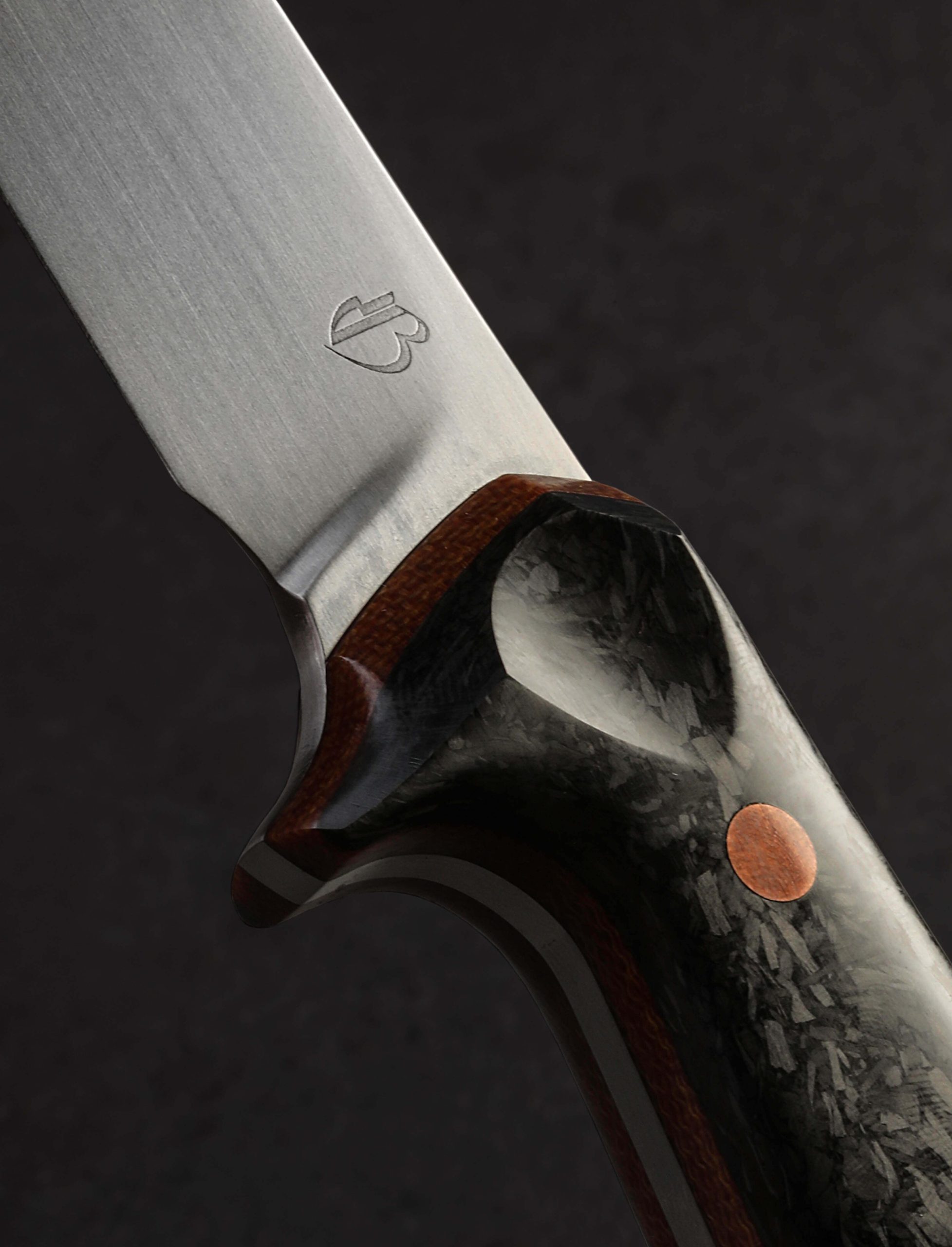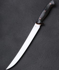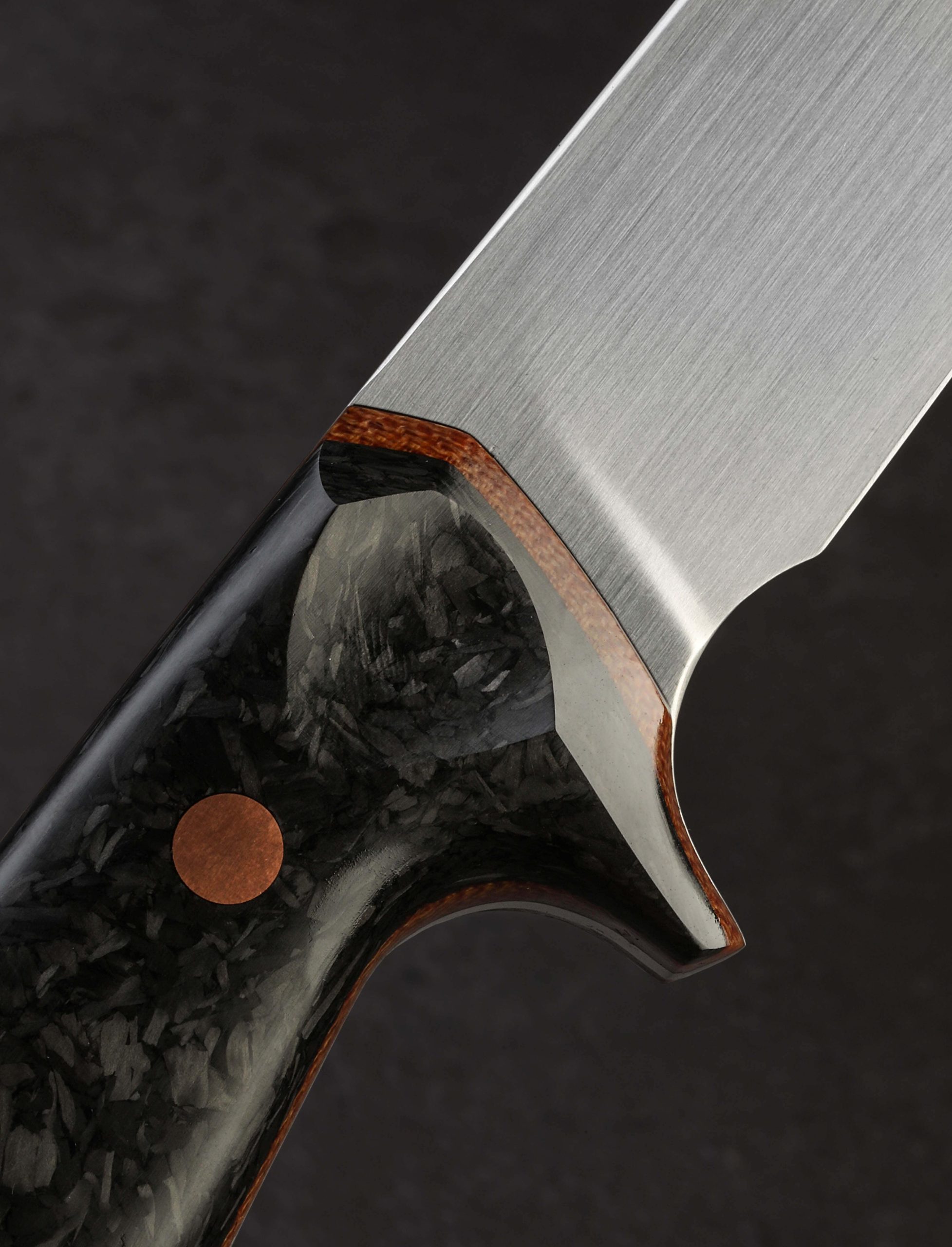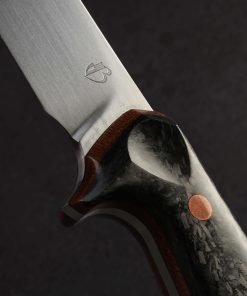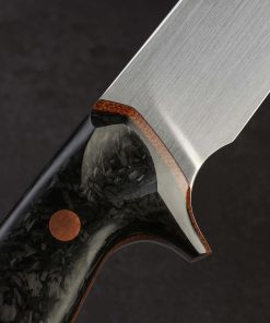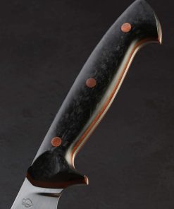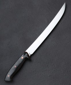 With this strikingly handsome fillet knife, artist Dan Bidinger breaks briefly from his well-loved chef and gyuto blade profiles to craft a purpose-specific butcher’s tool. In AEB-L high-performance stainless steel, 249mm / 9.8″ of razor-sharp edge sit beneath superbly shaped bevels that feature Dan’s freehand convex geometry and a beautiful, silky satin finish. Gently rounded for a smooth touch and tapering forward, a taper most pronounced in the final inches before the slim, needle-like tip, the blade’s spine allows for only a touch of lateral flexibility, giving the tool a tough, hard-working, while still versatile feel. The corrosion-resistant steel is ideal for demanding work conditions and exposure to the elements while still maintaining a high hardness of 62 HRC at the edge. As elegant as the long, upswept blade may be, the handle gives it a run for its money in the ‘head-turning looks’ department. Sculpted for ergonomics, comfort, and control over a blade destined for big cuts is a handle sculpted from shredded carbon fiber layered atop liners of vintage micarta, all secured by three oversized, flush, copper bolts.