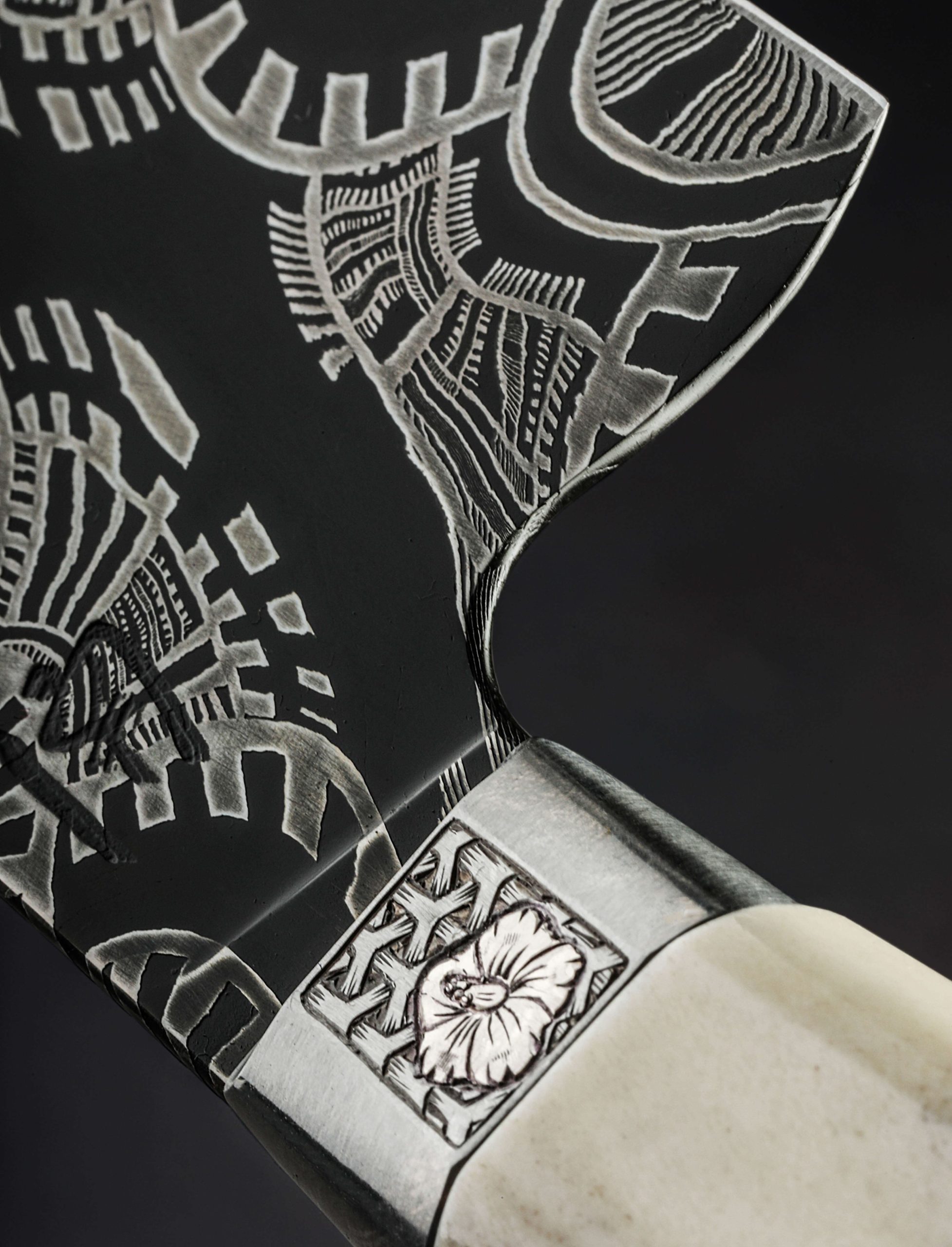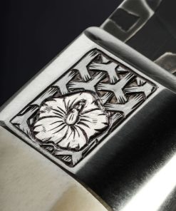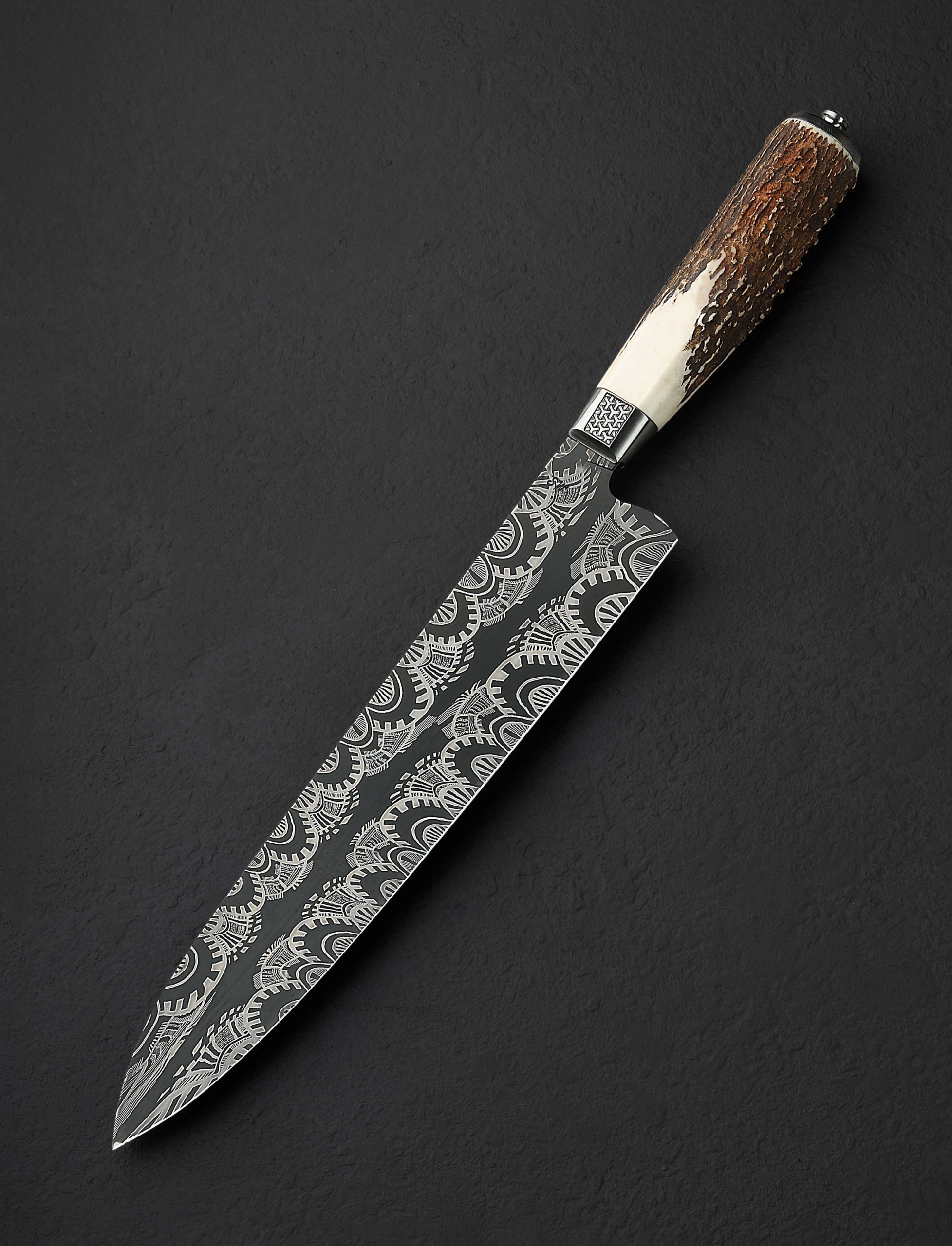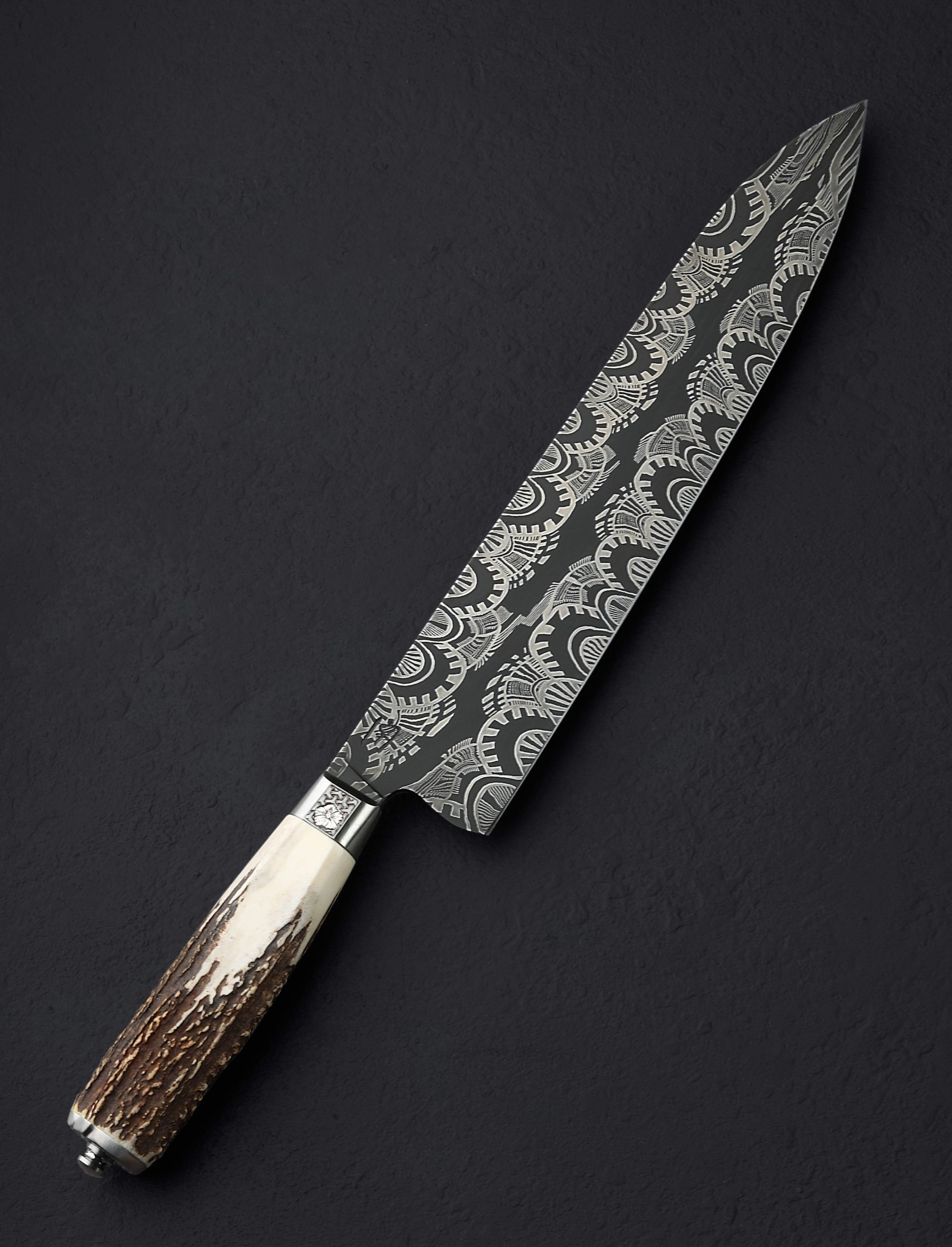 An extraordinary chef knife by Andrew Meers, this one-of-a-kind tool’s blade is forged from a mind-blowing mosaic damascus pattern created by artist Jason Morrissey. Thin, light, and quick in the hand, the 255mm cutting edge, 51mm heel height, and wonderfully honed convex bevels are not only stunning aesthetically, the blade is built for the rigors of daily cooking. To complement the futuristic, almost-alien style of the design realized by Jason’s damascus artistry, Andrew matches the blade to a remarkable handle sculpted from stainless steel, sterling silver, and deer antler. With heirloom fit-up and elegant details at every turn, a stainless bolster is engraved, and inlaid with carved sterling silver hibiscus flowers. Opposite, capping the beautiful, found antler at the handle’s rear is a butt cap of engraved steel with centered finial.