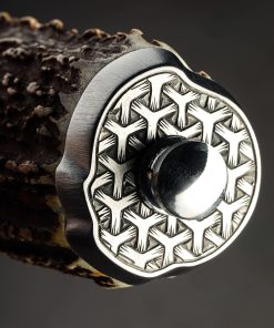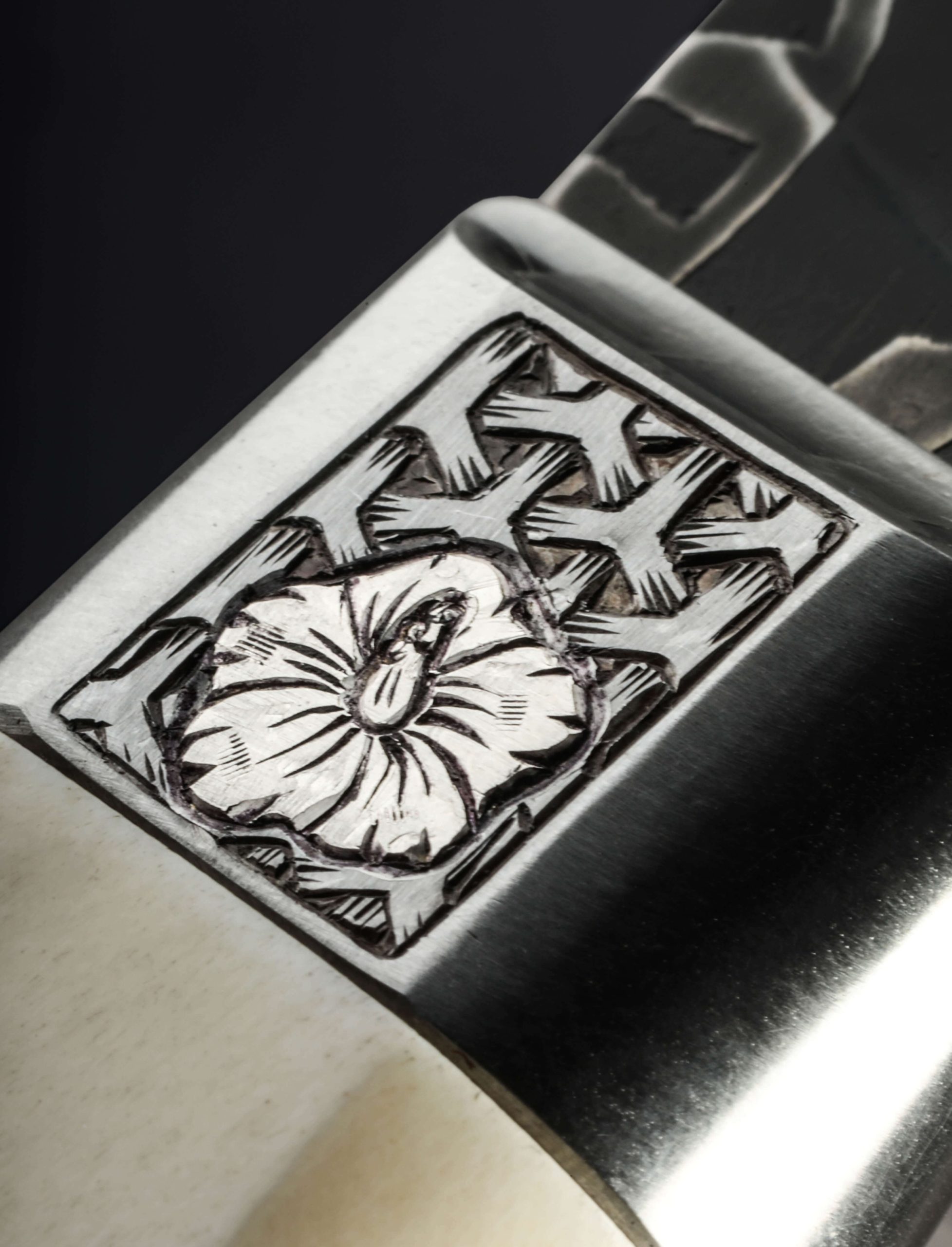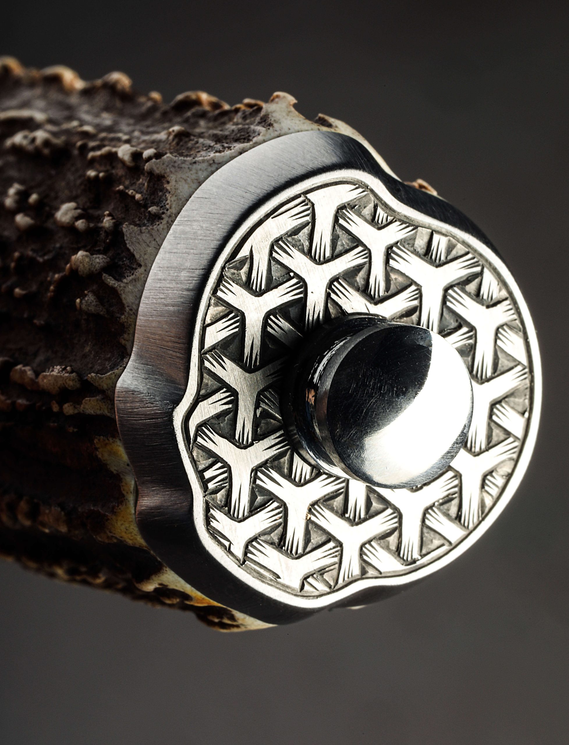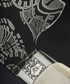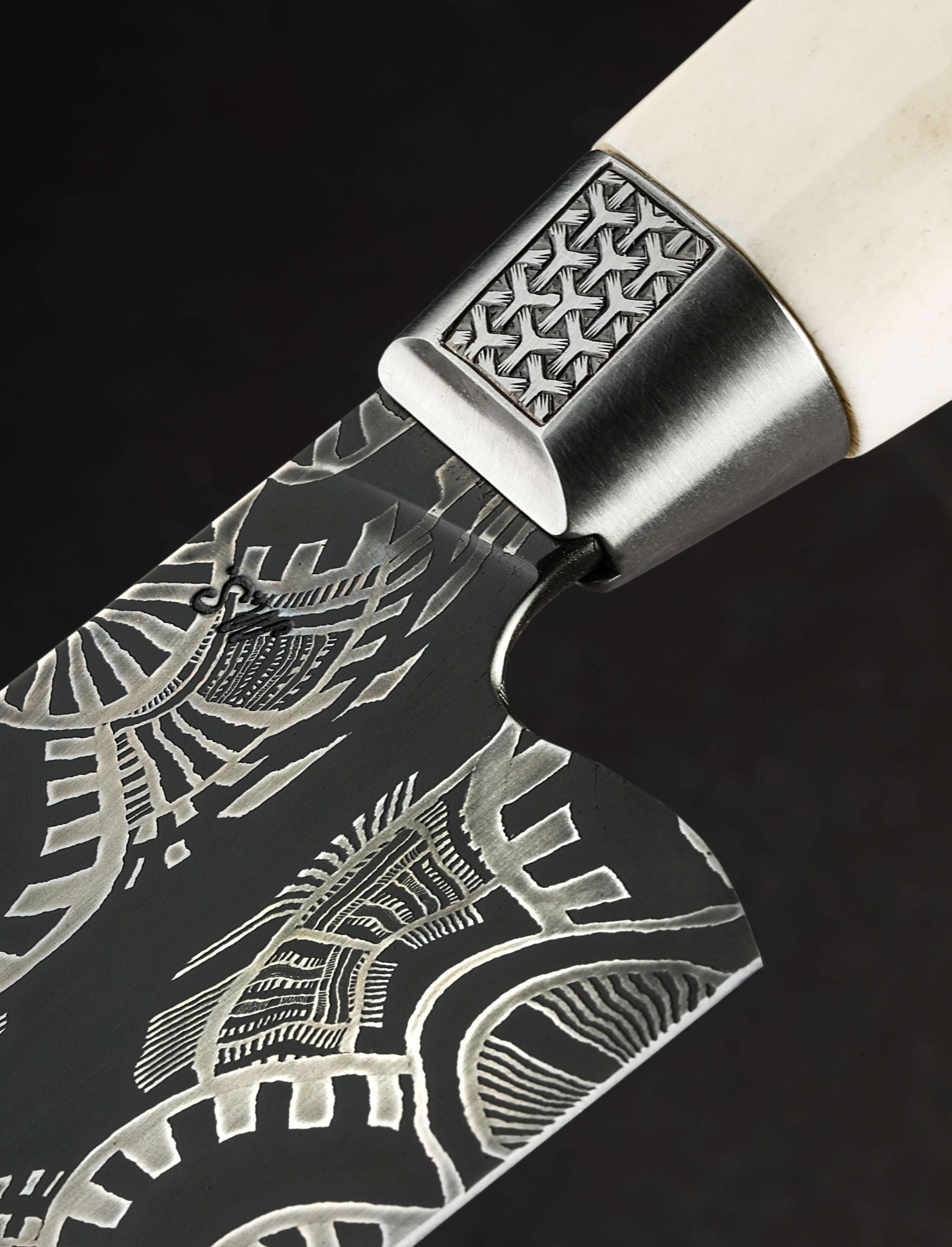 An extraordinary chef knife by Andrew Meers, this one-of-a-kind tool’s blade is forged from a mind-blowing mosaic damascus pattern created by artist Jason Morrissey. Thin, light, and quick in the hand, the 255mm cutting edge, 51mm heel height, and wonderfully honed convex bevels are not only stunning aesthetically, the blade is built for the rigors of daily cooking. To complement the futuristic, almost-alien style of the design realized by Jason’s damascus artistry, Andrew matches the blade to a remarkable handle sculpted from stainless steel, sterling silver, and deer antler. With heirloom fit-up and elegant details at every turn, a stainless bolster is engraved, and inlaid with carved sterling silver hibiscus flowers. Opposite, capping the beautiful, found antler at the handle’s rear is a butt cap of engraved steel with centered finial.