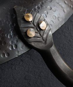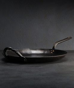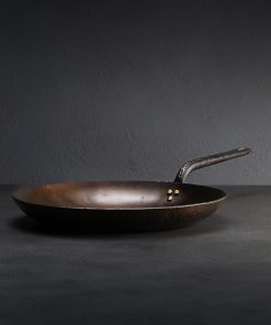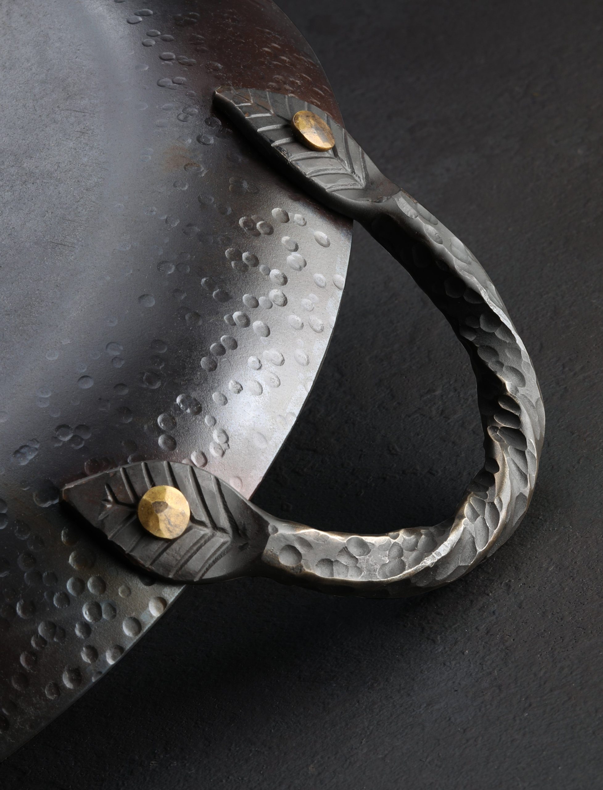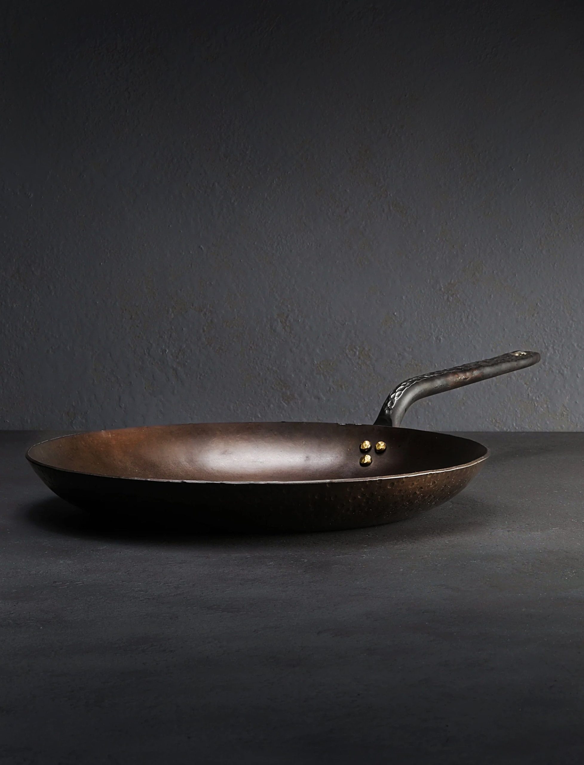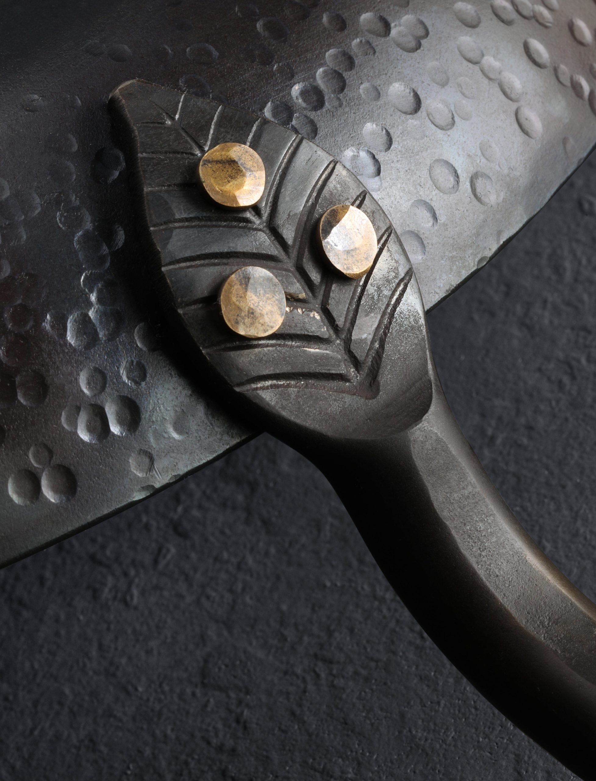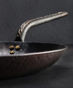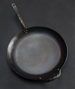 Superb function and a wonderfully styled rustic aesthetic go hand-in-hand when cooking with a Stage Coach Forge carbon steel skillet, available in three sizes: 9″, 11″, or 13″, forged and shaped at the hands of artist blacksmith Ryan Sanden. In weighted, solid, 12-gauge carbon steel, the pan comes pre-seasoned and ready to cook with, perfect for use in the oven, on glass cooktops, and over the open flame, both indoors and out. Forged one at a time from thick stainless steel, the silver polished handle is lower in heat-conductivity than other materials, and offers wonderful grip and control while moving the pan around the workspace. Solid brass rivets secure the handle to the pan and the pan features a hand-hammered texture around the exterior.