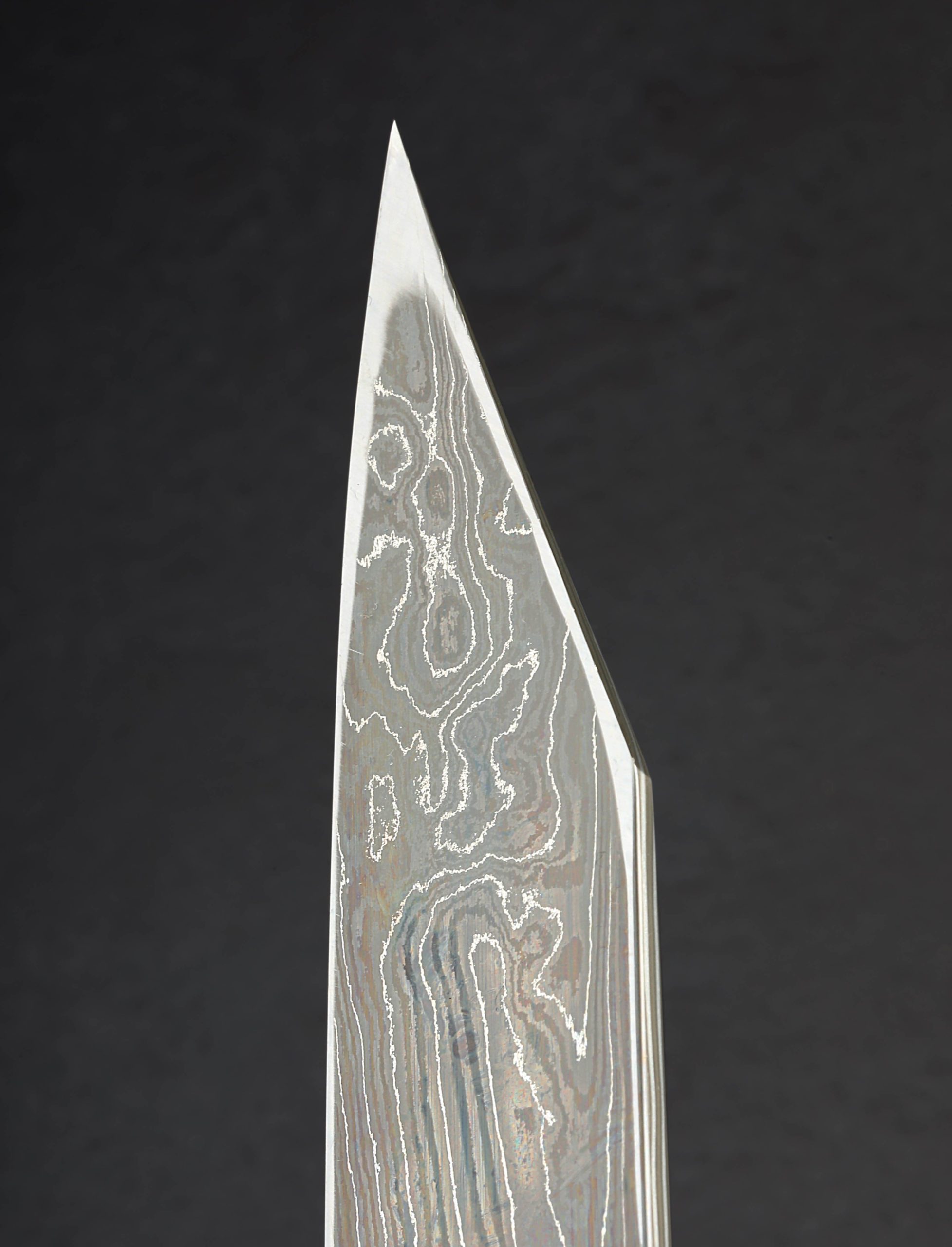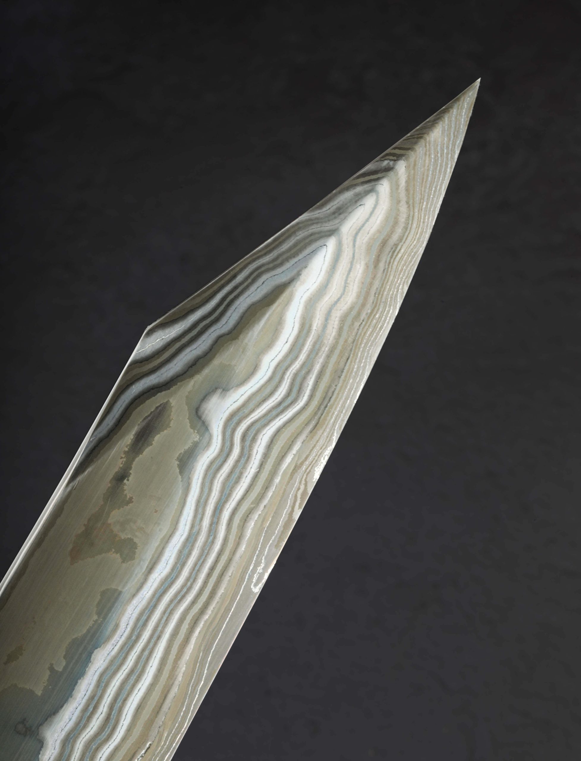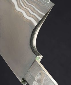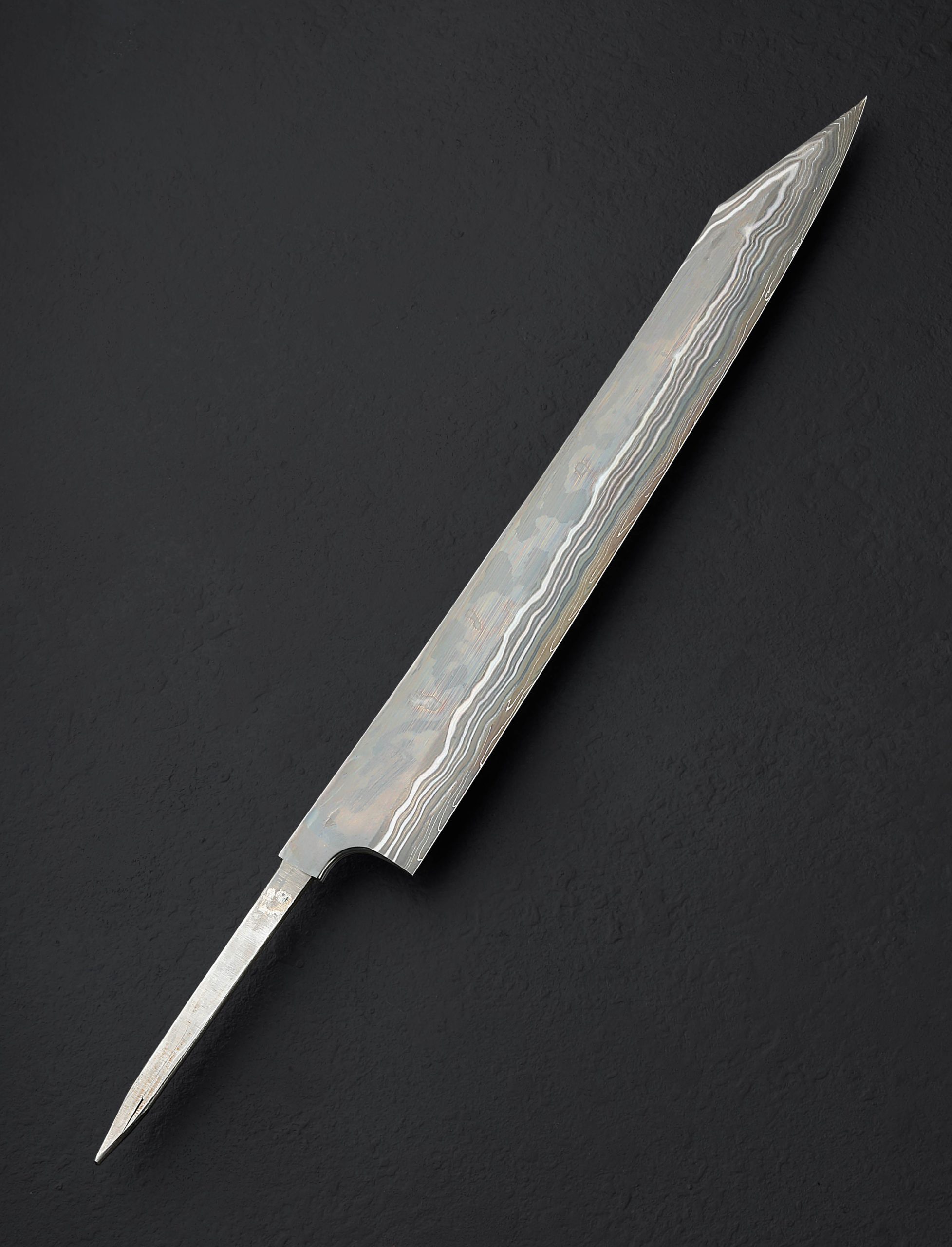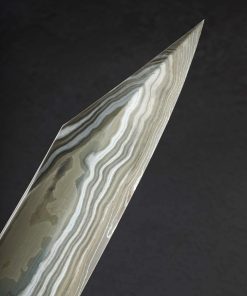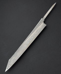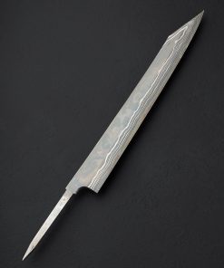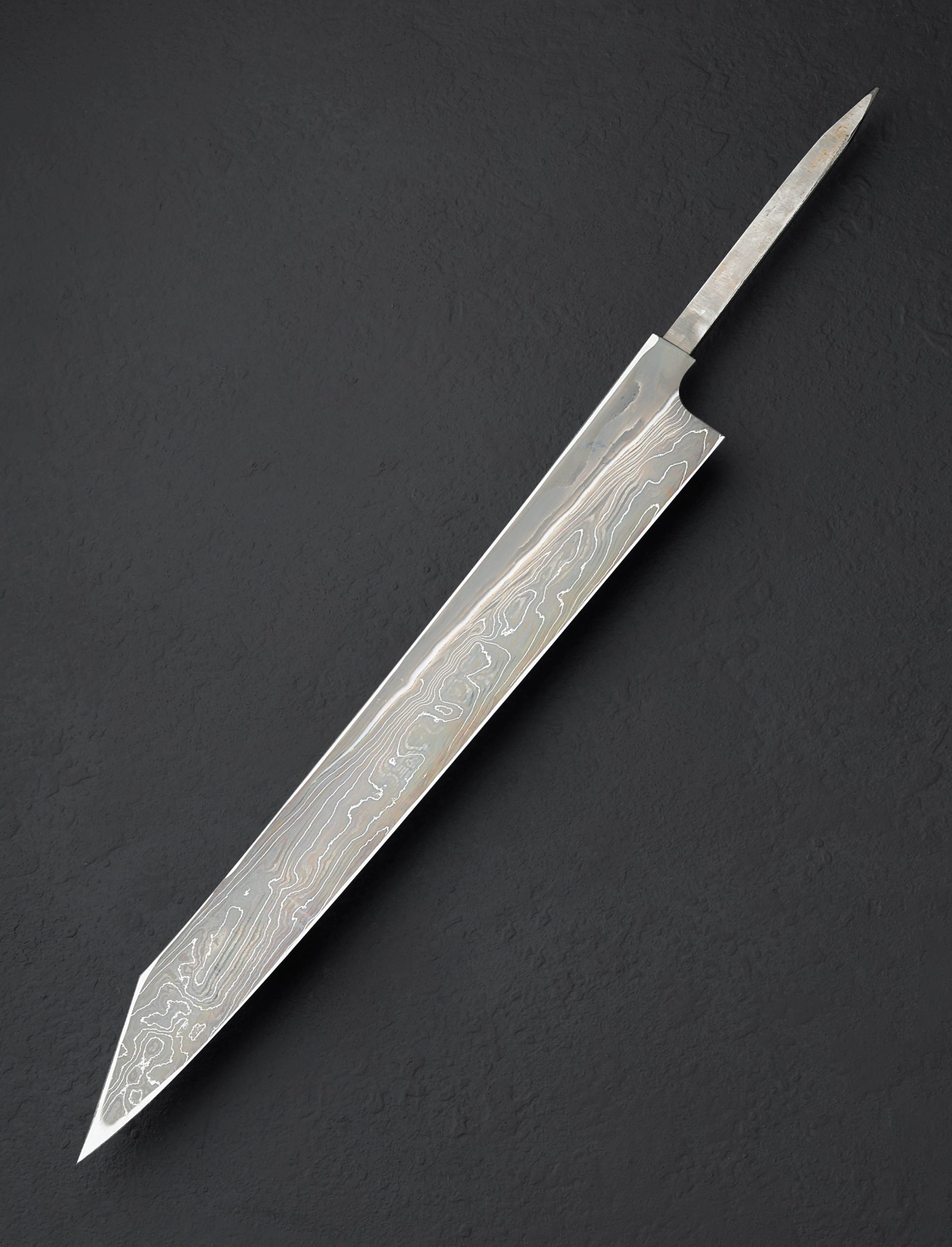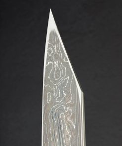 Crafted from a variety of carbon alloys by the hands of the Nigara Hamono bladesmiths who carry on a legacy which stretches back over 350 years, we present the Silver Tides Kiritsuke Yanagiba. From the Kagetora Collection, crafted in Japan’s Aomori Prefecture at the shop run today by 8th generation lead blacksmith Go Yoshizawa, this single-bevel, 312mm / 12.3″ yanagiba blade features a pointed kiritsuke-style tip and a thin, razor-sharp edge. Forged by hand, the san mai constructions delivers a core of White No.2 and Blue No.2 carbon damascus with damascus cladding. A concave urasuki on the blade’s left side (designed for the right-handed chef) and chisel-ground right side, present the damascus patterns in different lights, giving every inch of this work of functional art a story of its own. Offered in traditional form without a handle installed, the new owner is able to select, or have made, a handle to suit their exact preferences. For long, precise and delicate slices of fish and other proteins, the yanagiba is a purpose-built tool with a long history, and this rendition is as fine as they come.
