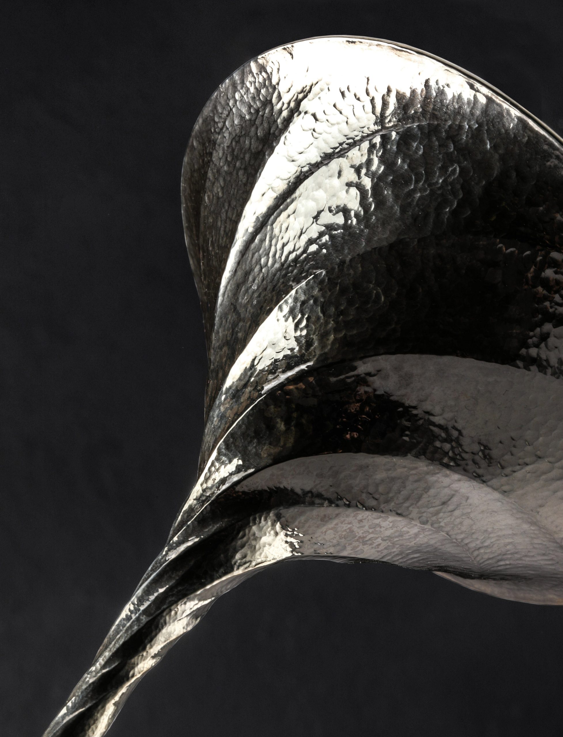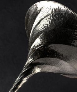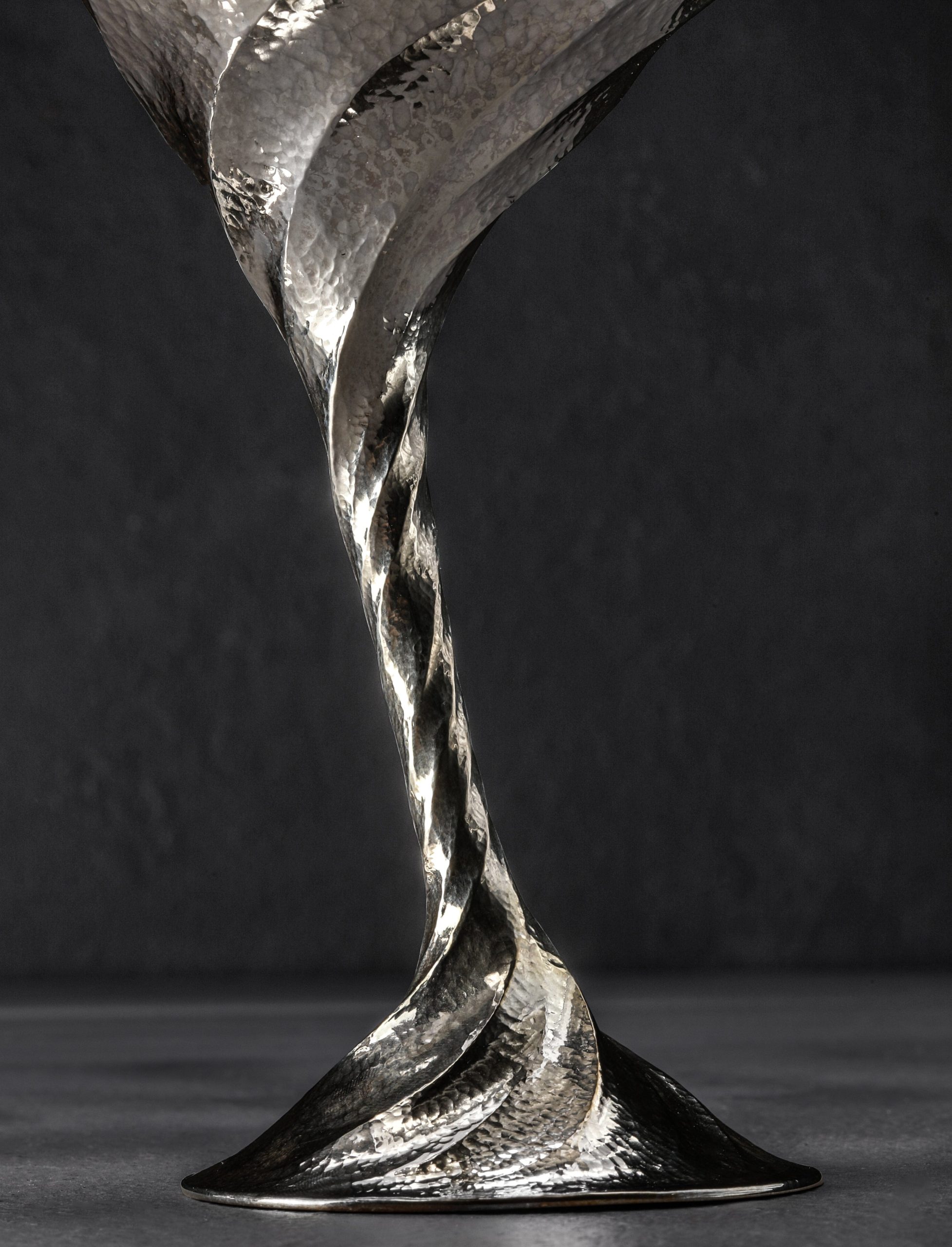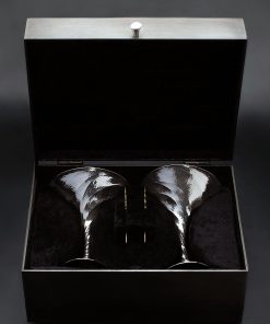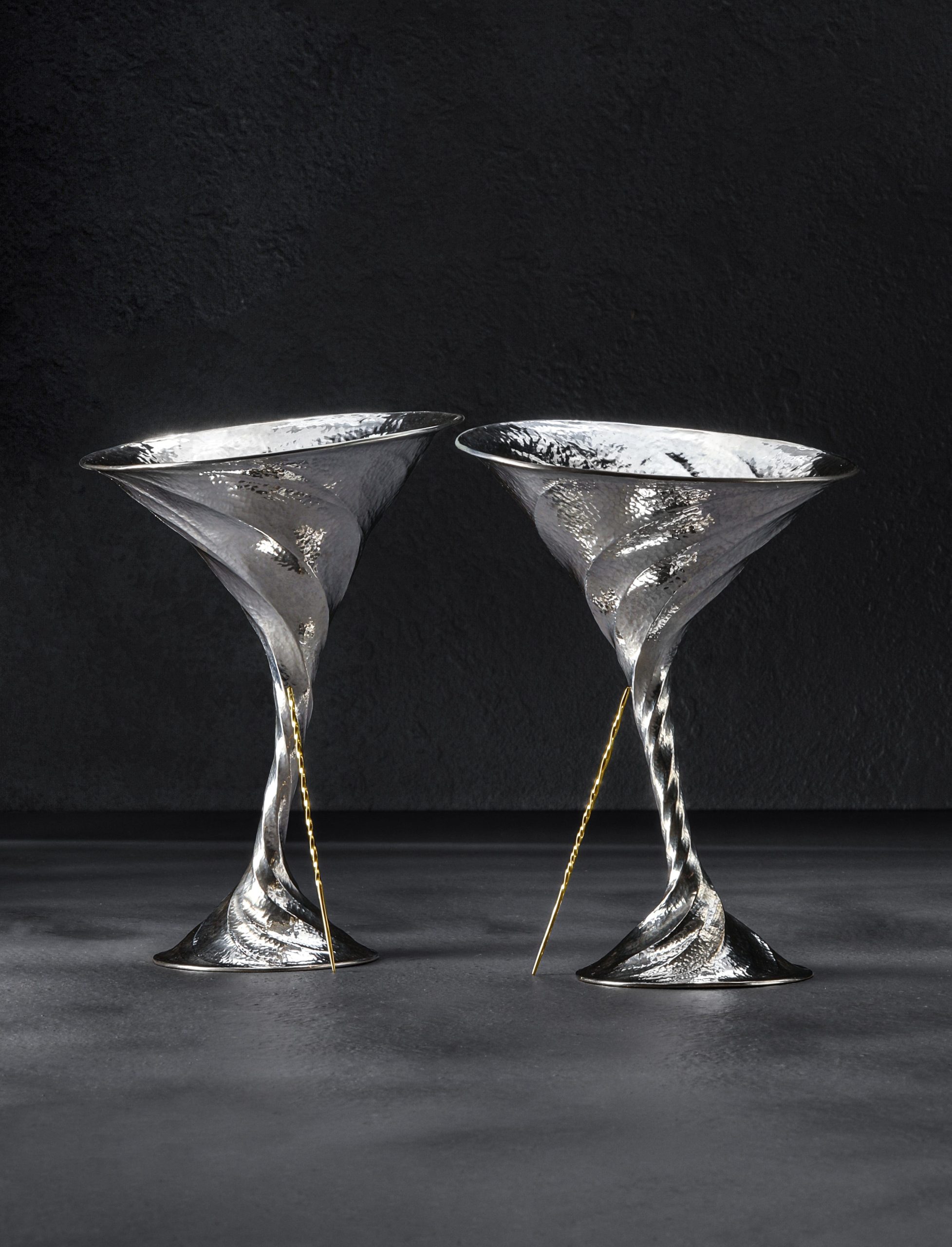 For this breathtaking, one-of-a-kind sterling silver martini set made by artist Saign Charlestein, the idea that on occasion words cannot express the true beauty and qualities of art and objects is as true as ever. Raised by hand from solid 925 sterling, the twists, curves, texture, and unique form of the vessels offer a uniquely inspired experience to the martini afficionado. Saign, a world-class metalsmith with studio in Washington State, combines art, function, and form in a design of his creation, brought to life in collaboration with our founder, Abe, including 24k gold cocktail picks, and custom-made box of solid steel. The pair of dynamic, lively, and textured glasses feature a tornado-inspired twist that starts at the base and flows gracefully with pronounced distinction upward to the rim. Elegant and complementary, the picks made of solid gold are as detailed as the glasses they pair with, featuring a continuous twist throughout which transitions through a smooth, polished stretch, to the sharp points. Take your guests’ breath away, and your own, each time you unveil these works of art from their carbon steel encasing. Lined with dark fabric on the inside, the box is both protective and handsome, further highlighting the luminescence of the exquisite objects within when used for display.