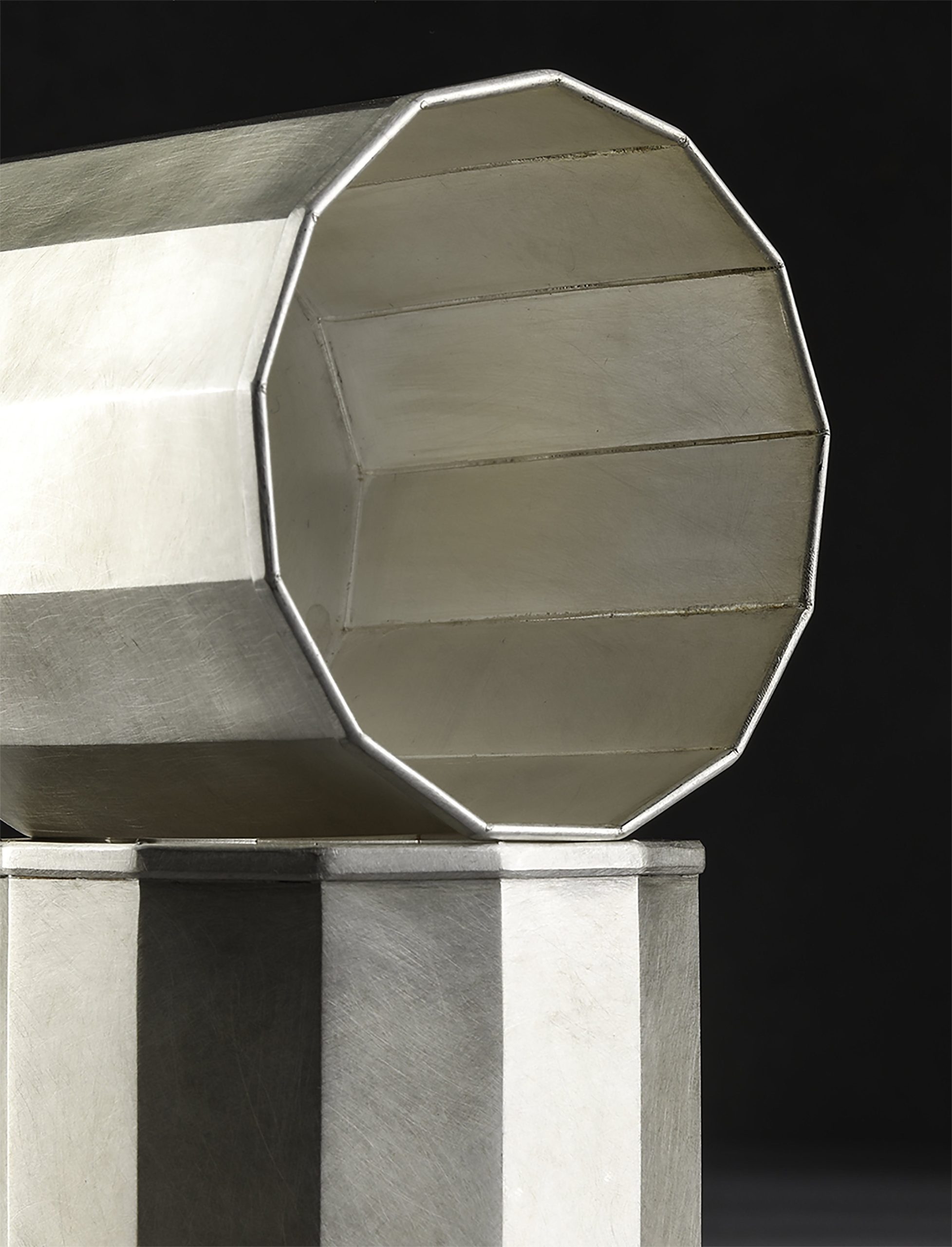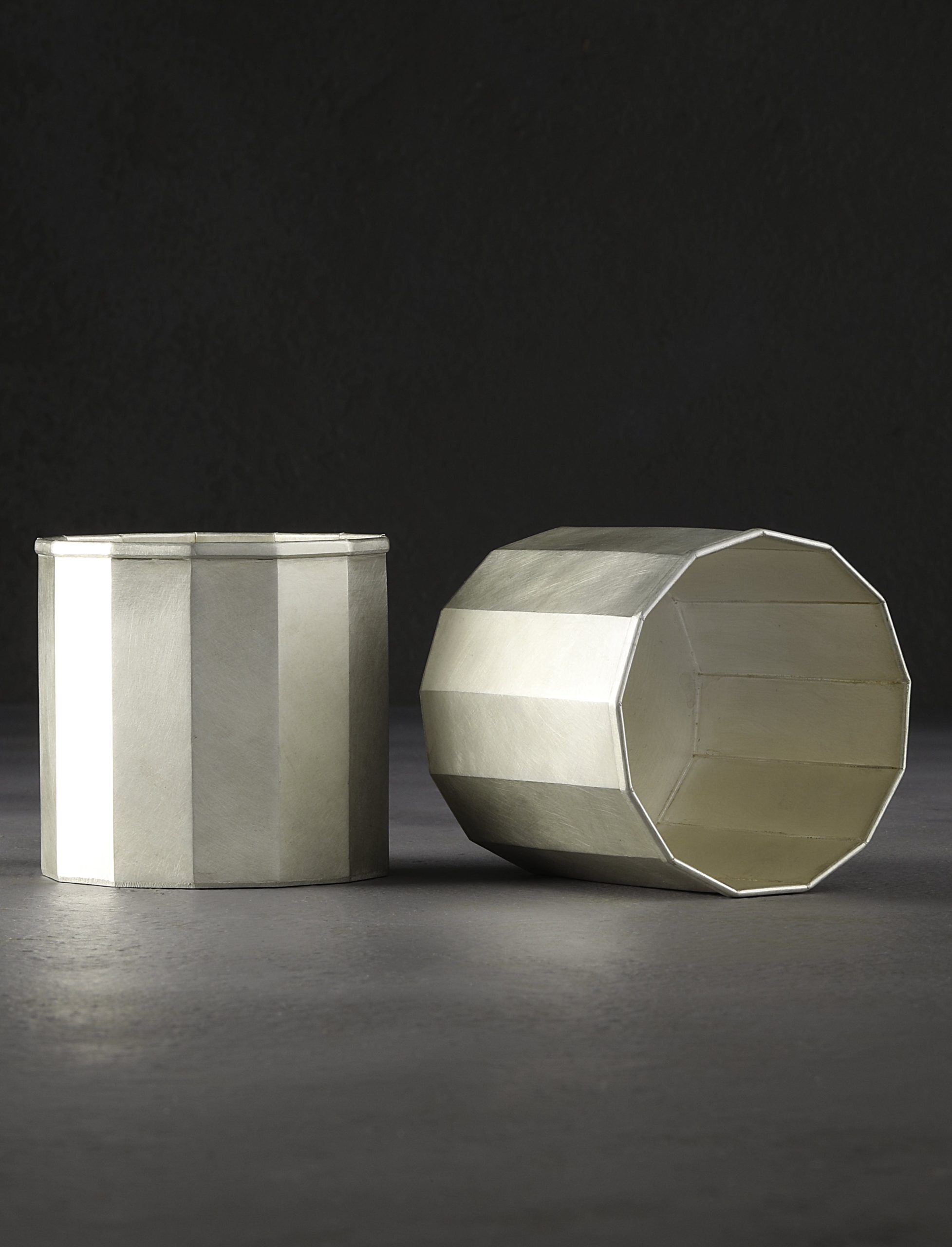Hand crafted by designer Kenny Son in his iconic tridecagonal (thirteen-sided) whiskey tumbler form, the exquisite set available here has been formed, one section at a time, from solid sterling silver. A lustrous finish inside and out, and the sensation in the hand, embody the sensation of a night cap shared with a friend; soothing, warm, and familiar. Made with care and precision at his studio in Sydney, Australia, Kenny’s eye for simple, sophisticated functional objects has a way of connecting the user with the contents of the vessel, and the origins of the vessel itself. Deliberate details and subtle signs of the hand-made process assure a one-of-a-kind experience, both in use, and in visual encounter.