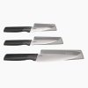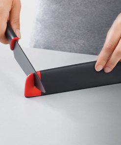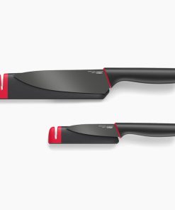 The knives in this 2-piece set have integrated ceramic sharpeners built into the protective sheath so you can sharpen them just before using.