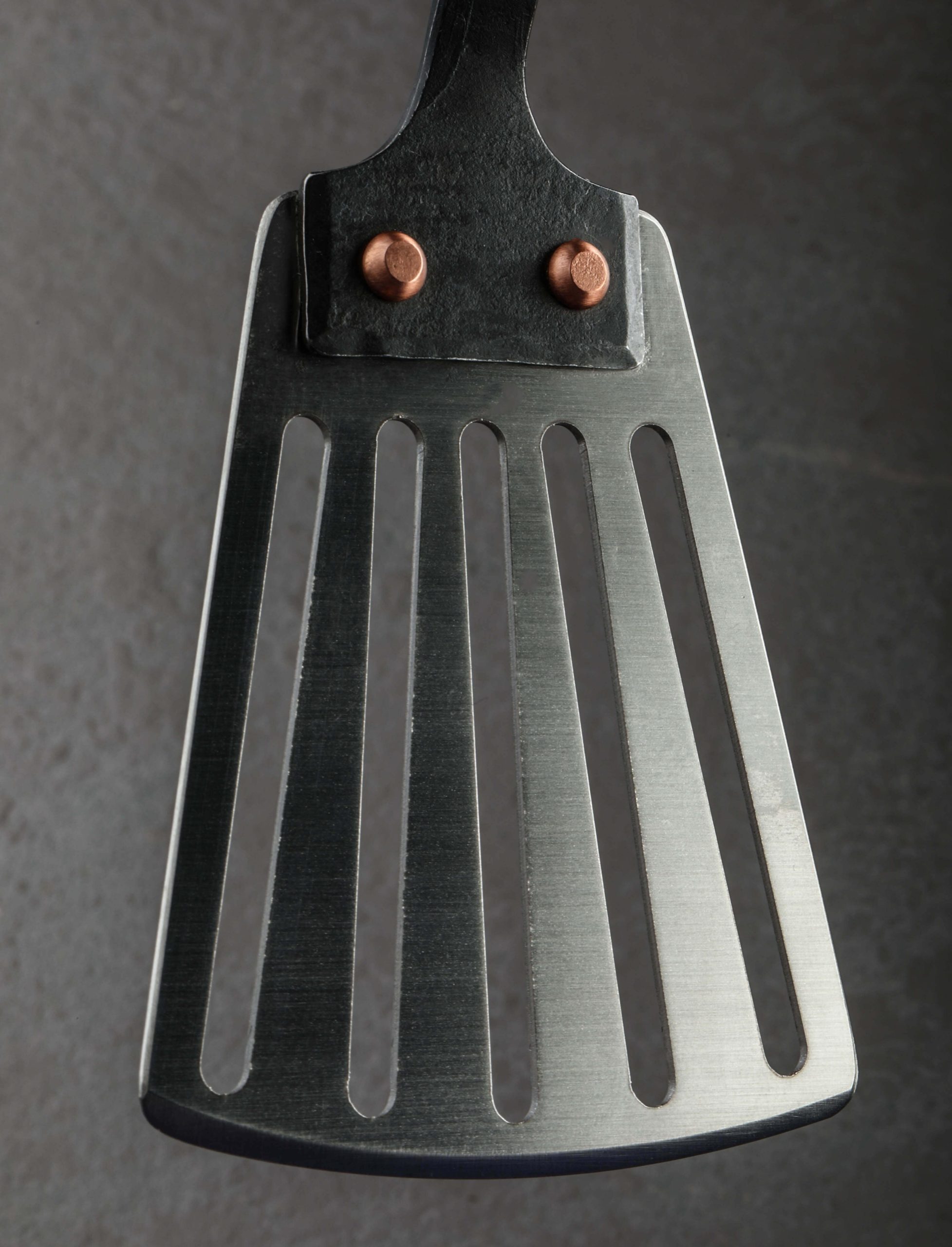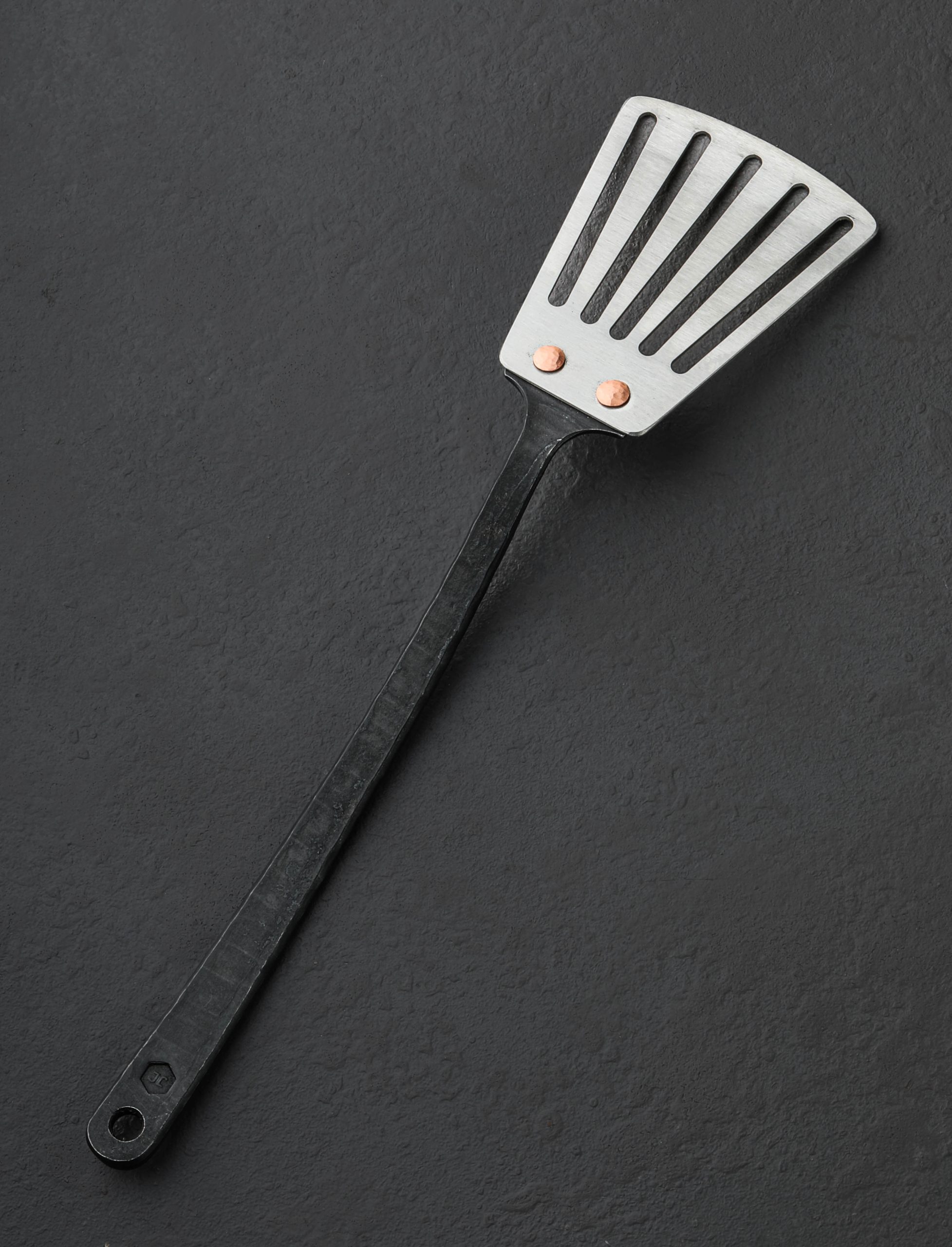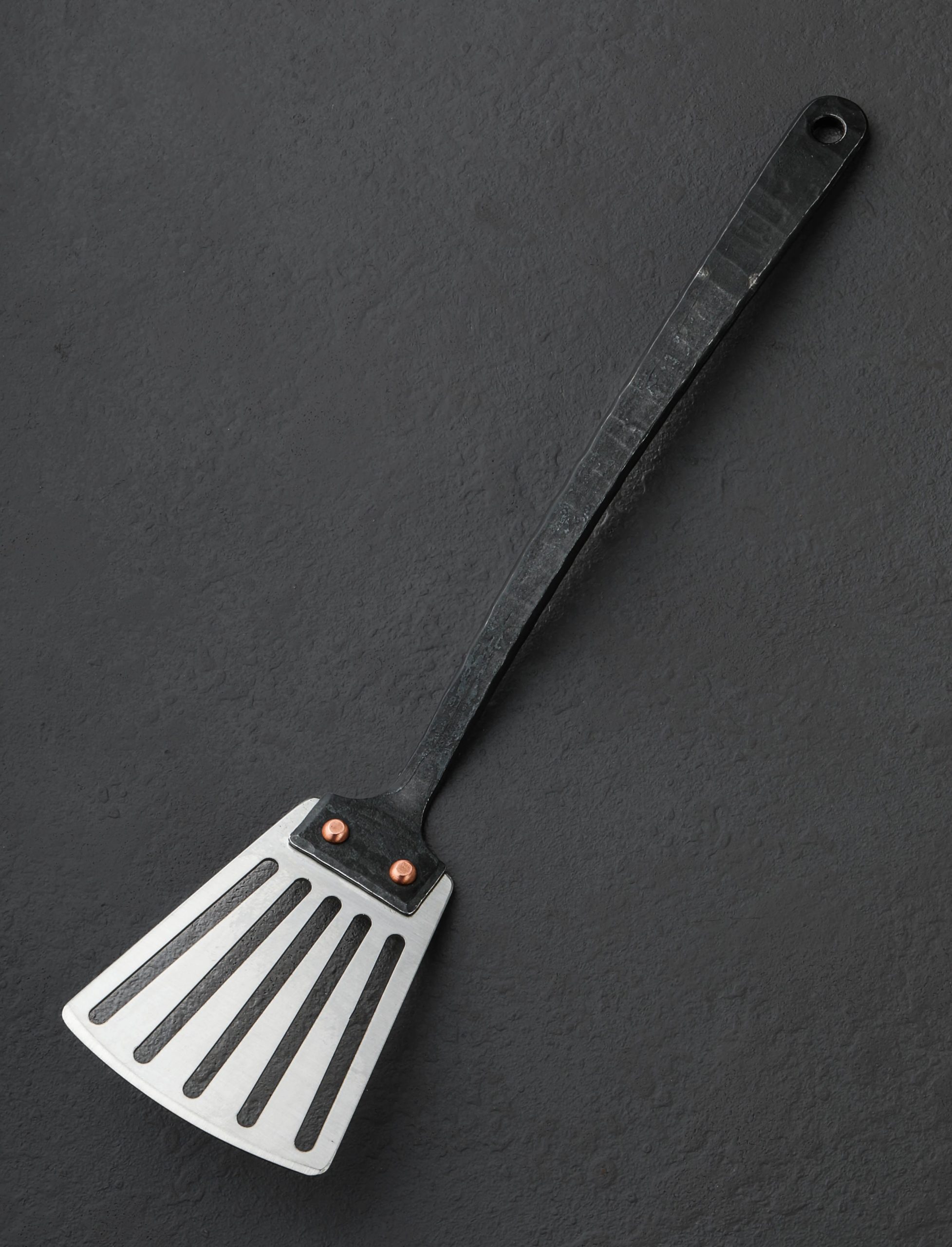 Beautifully styled, crafted by hand, and built to use, the Slotted Steel Serving Spatula is elegant enough for the dining room and tough enough for the kitchen. Handmade in Somerset, UK by Alex Pole Ironwork, each handle is forged to shape from iron and fastened to the brushed steel head using two oversized copper rivets. Ergonomic and balanced in the hand for comfortable work indoors and out, good looks and superb craftsmanship go hand-in-hand. From potatoes to fish, the spatula’s head with a tapered front edge and and series of cut-outs is ideal for nearly any dish that requires the juices stay where they are. A hole at the handle’s end gives the ability to store and display this handcrafted object on the kitchen or dining room wall.