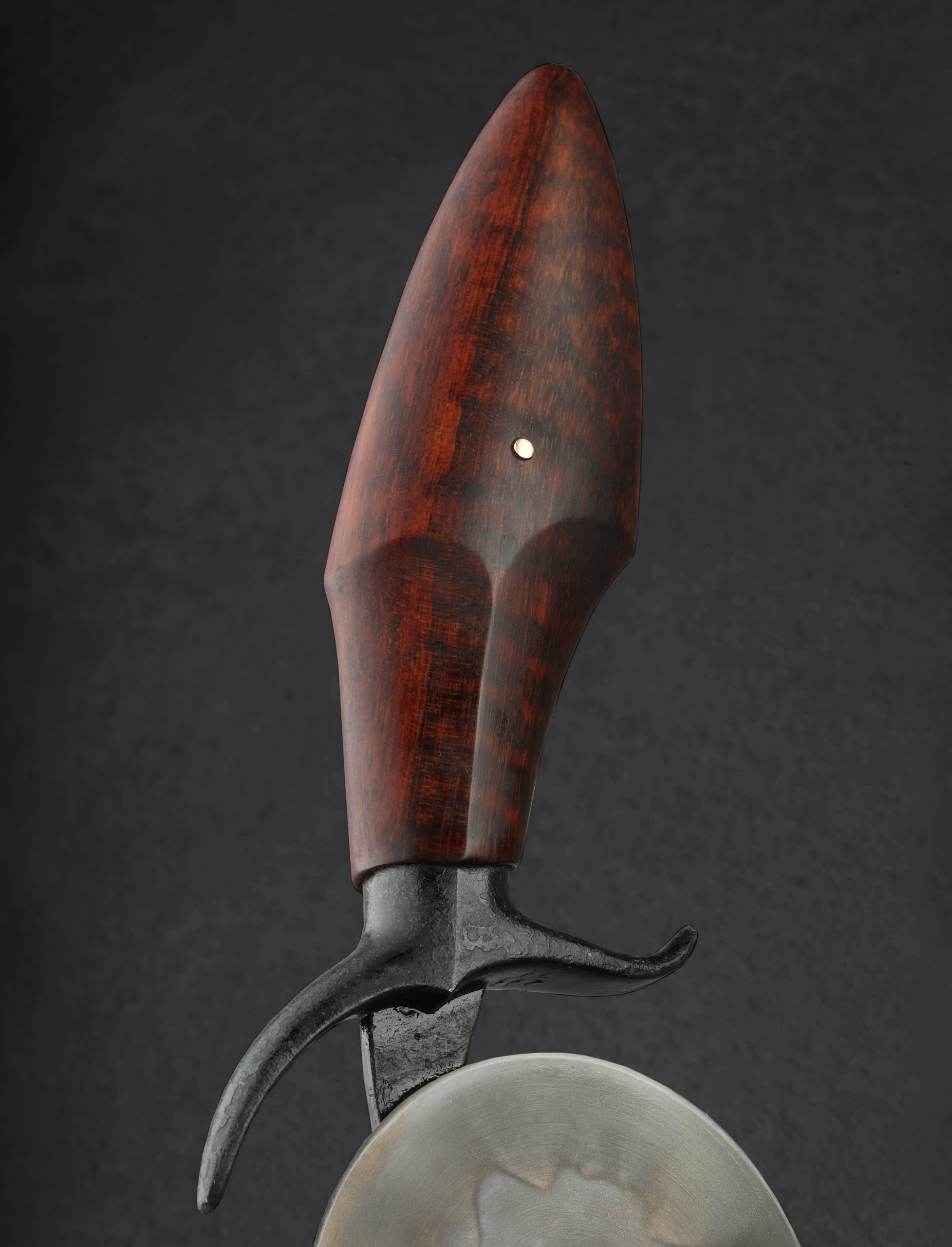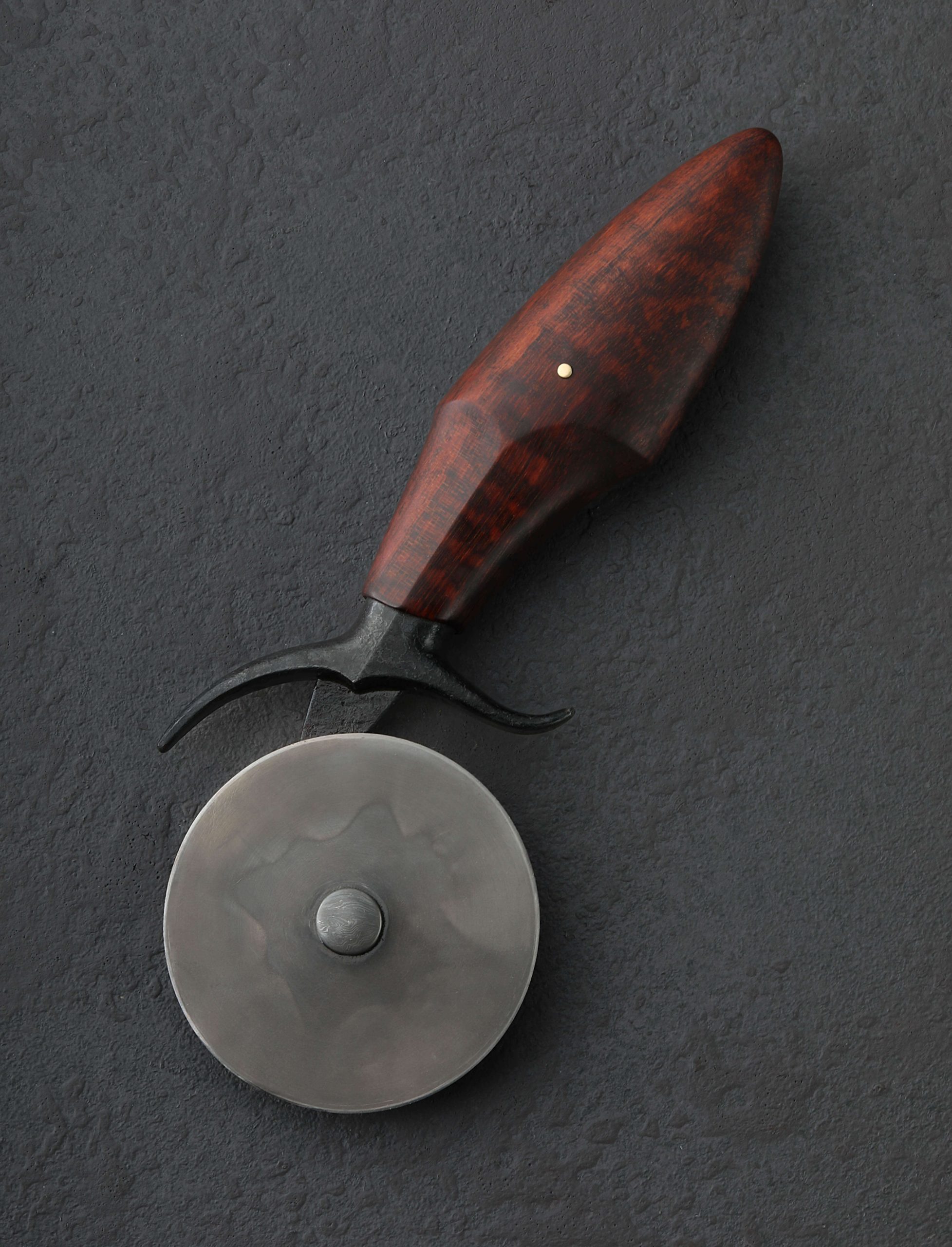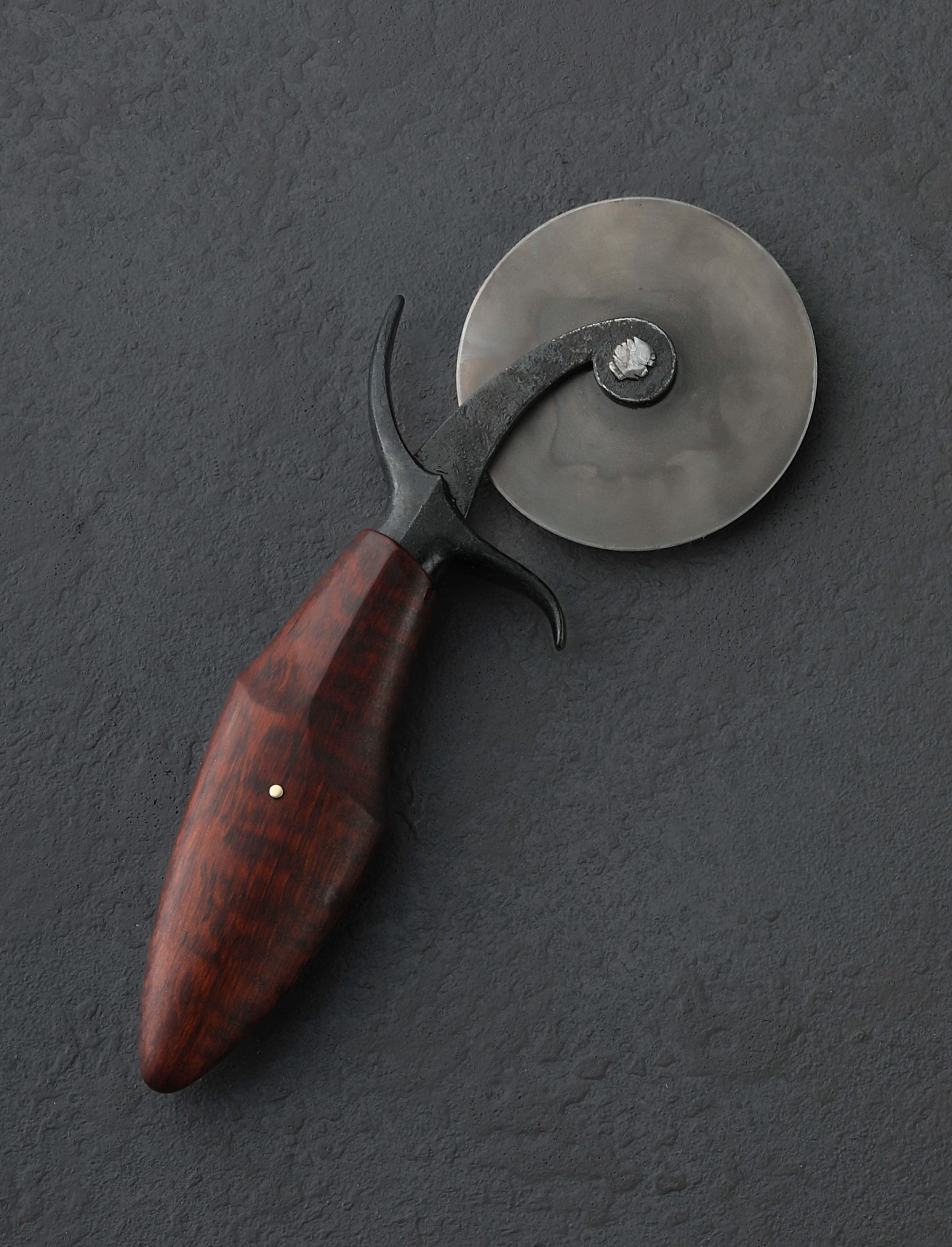 Proximity to pizza has been known to enhance the allure of a range of objects. In the case of this one-of-a-kind Toma Fenes pizza cutter, it’s the tool that enhances the food. Crafted at his studio in the northern Romanian countryside, Toma delivers a strikingly designed object inspired by his love of the cuisine and its making; an accomplished chef, Toma has been known to make not only pizza itself, but cheese and other foods from their raw ingredients as well. The carefully selected ingredients found in this pizza wheel include the 26c3 ‘Spicy White’ carbon steel wheel, damascus wheel pin, forged iron frame and guard, sculpted snakewood handle, and domed brass pin. Designed for a tight fit, with the cutter new and unused the wheel requires a small amount of force to turn: not only do we expect the wheel continue to loosen slightly with use, but with the pressure required to part a pizza even out of the box the wheel will excel at doing its job well and with style. A more handsome and unique pizza tool is not easily found.