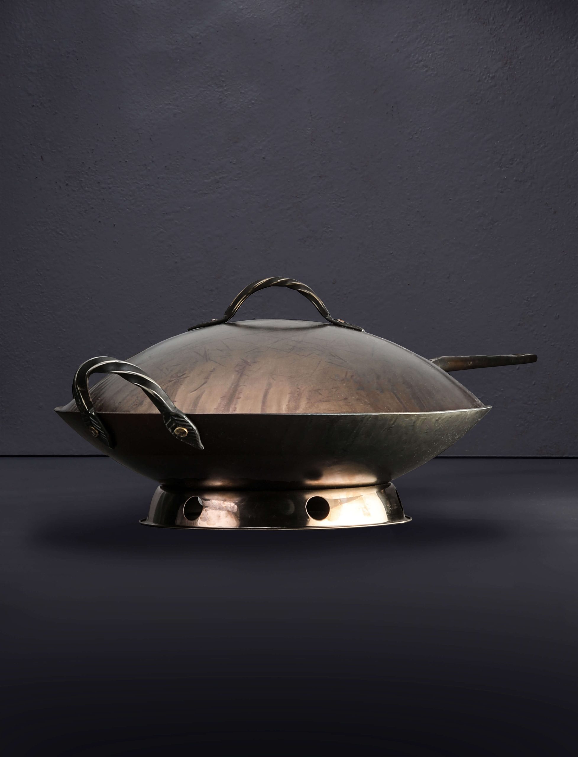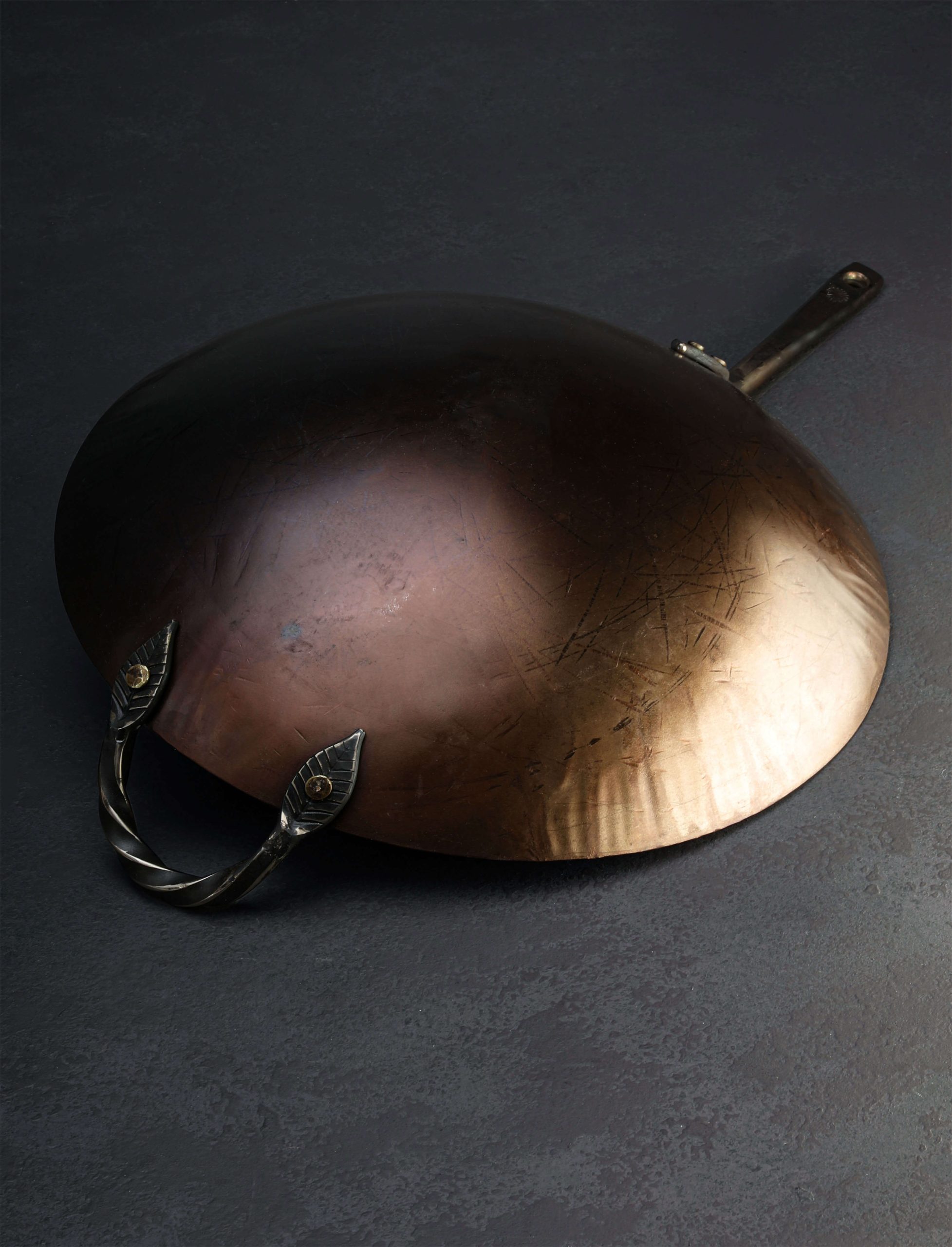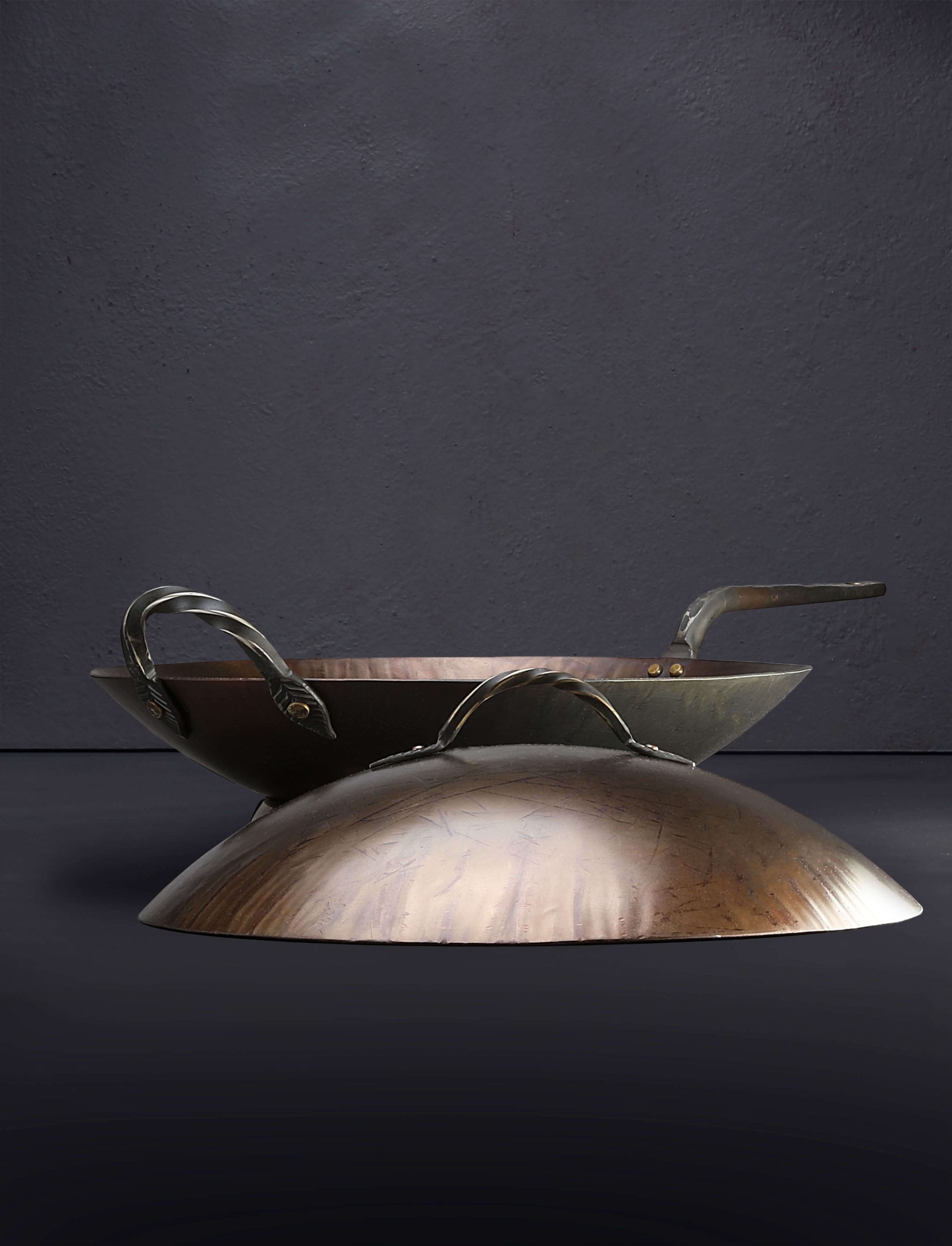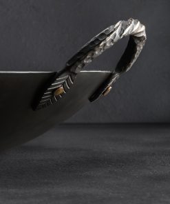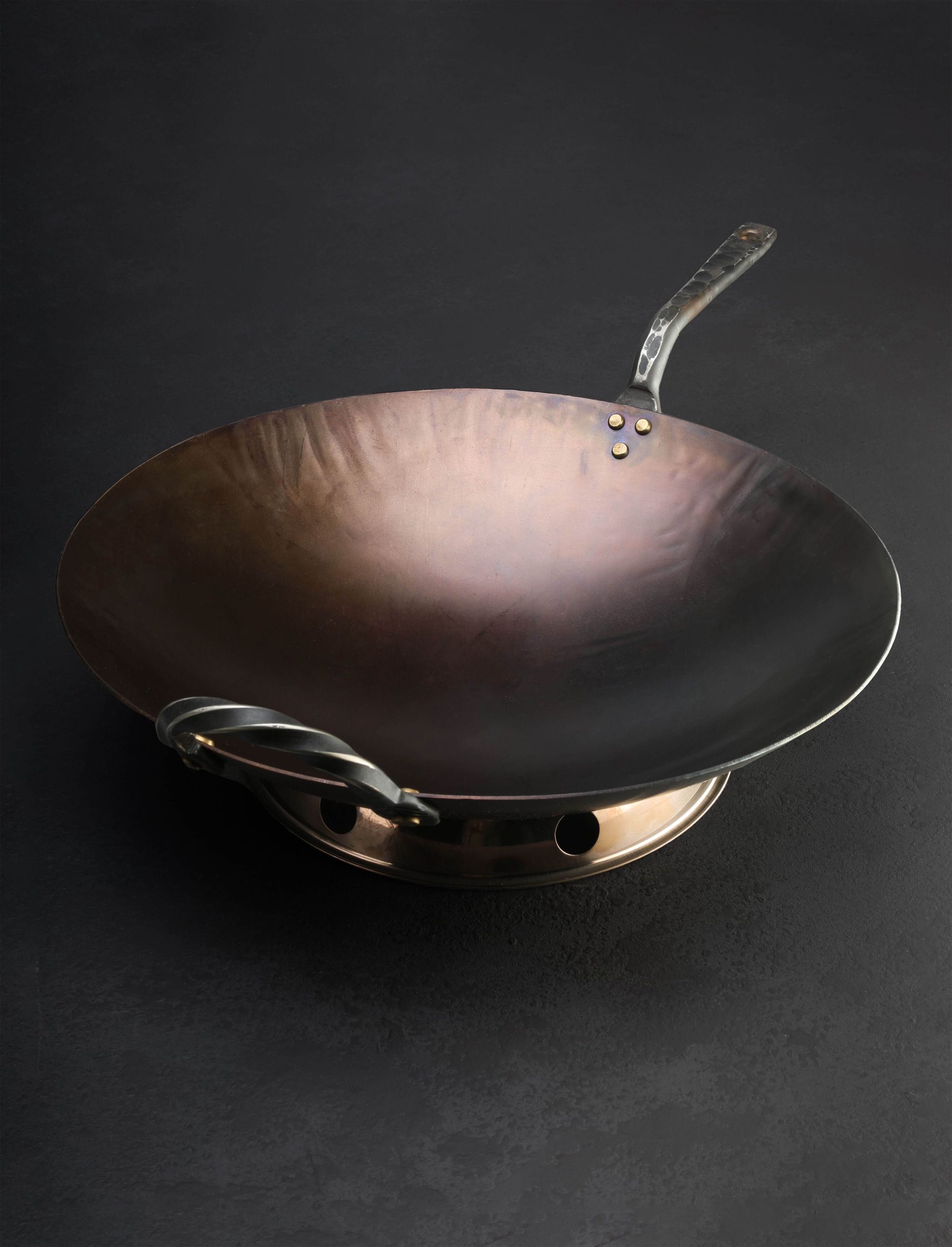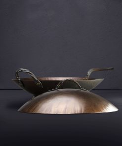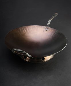 The extraordinary, hard-working Stage Coach carbon cookware collection expands with the addition of the new, classic Round Bottom Wok. Shaped by hand at his Oregon workshop, Ryan Sanden of Stage Coach Farm Forge grows his wok offerings with this traditionally shaped model, rounded throughout, to complement the well-loved flat bottom wok we have stocked for some time. For the ultimate stir-fry cooking and deep frying experience, available with and without lid, the round bottom wok is crafted from solid 12-gauge carbon steel, measuring 15″ across from lip to lip, 3.5″ tall at its deepest point, and fitted with one long and one loop handle, each decoratively forged and secured by solid, hand-peened brass rivets. For added versatility, each round bottom wok includes a separate steel base to enable round-bottom cooking even on flat, gas-stove cooktops. Large enough for a feast, and crafted with care, this heirloom quality cooking tool will feed mouths and hearts for generations to come.