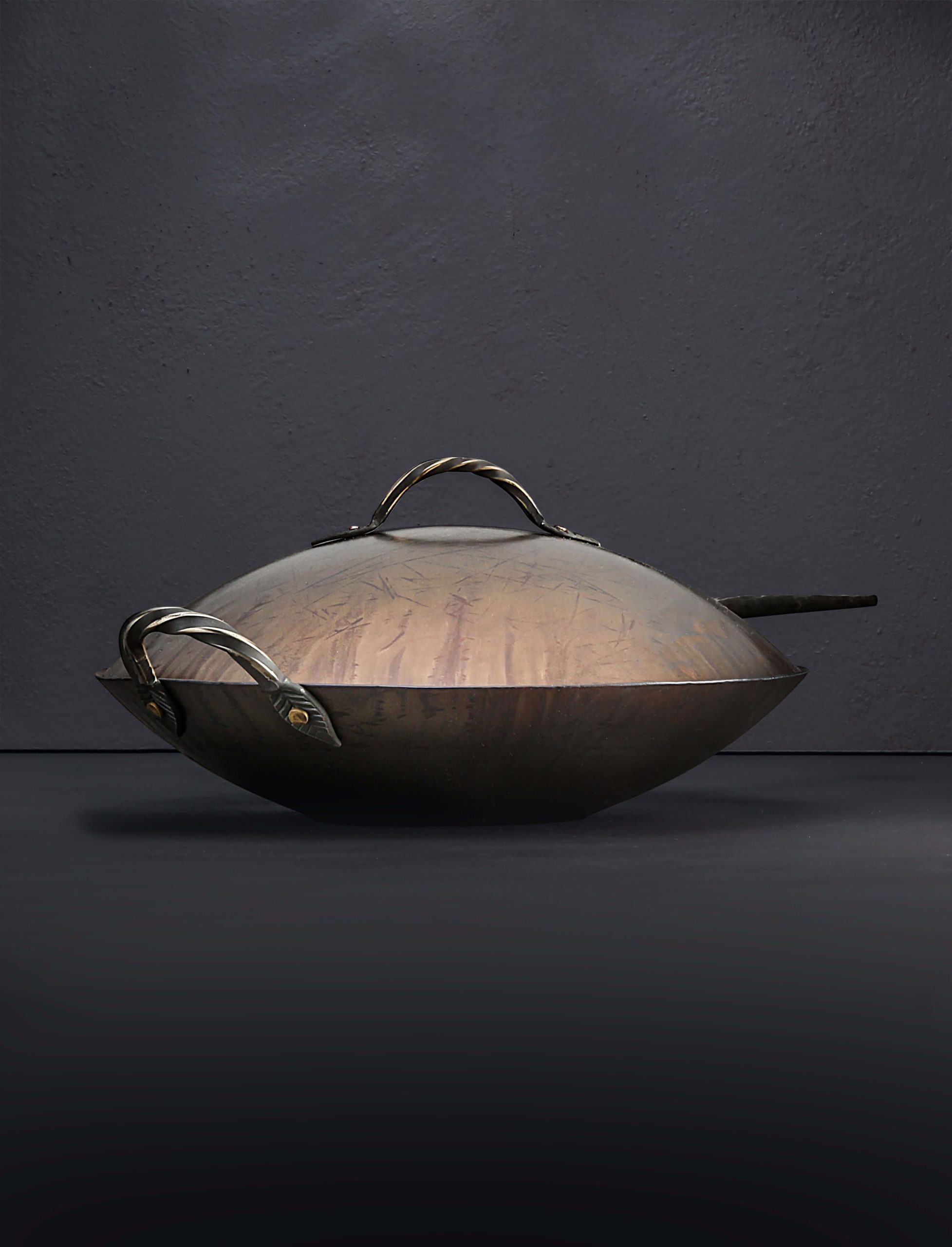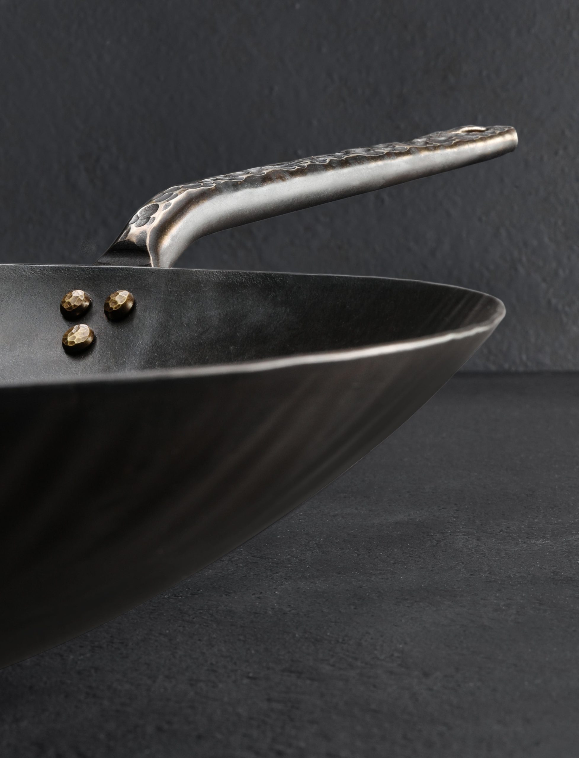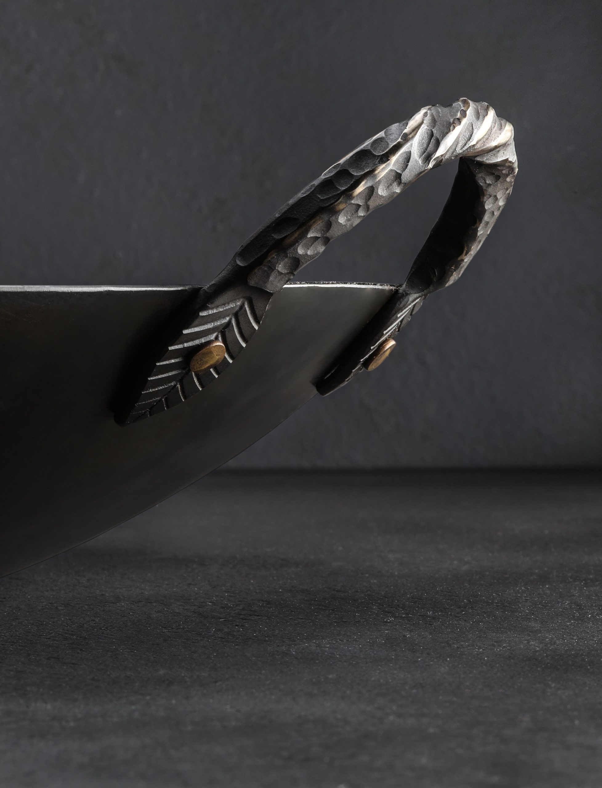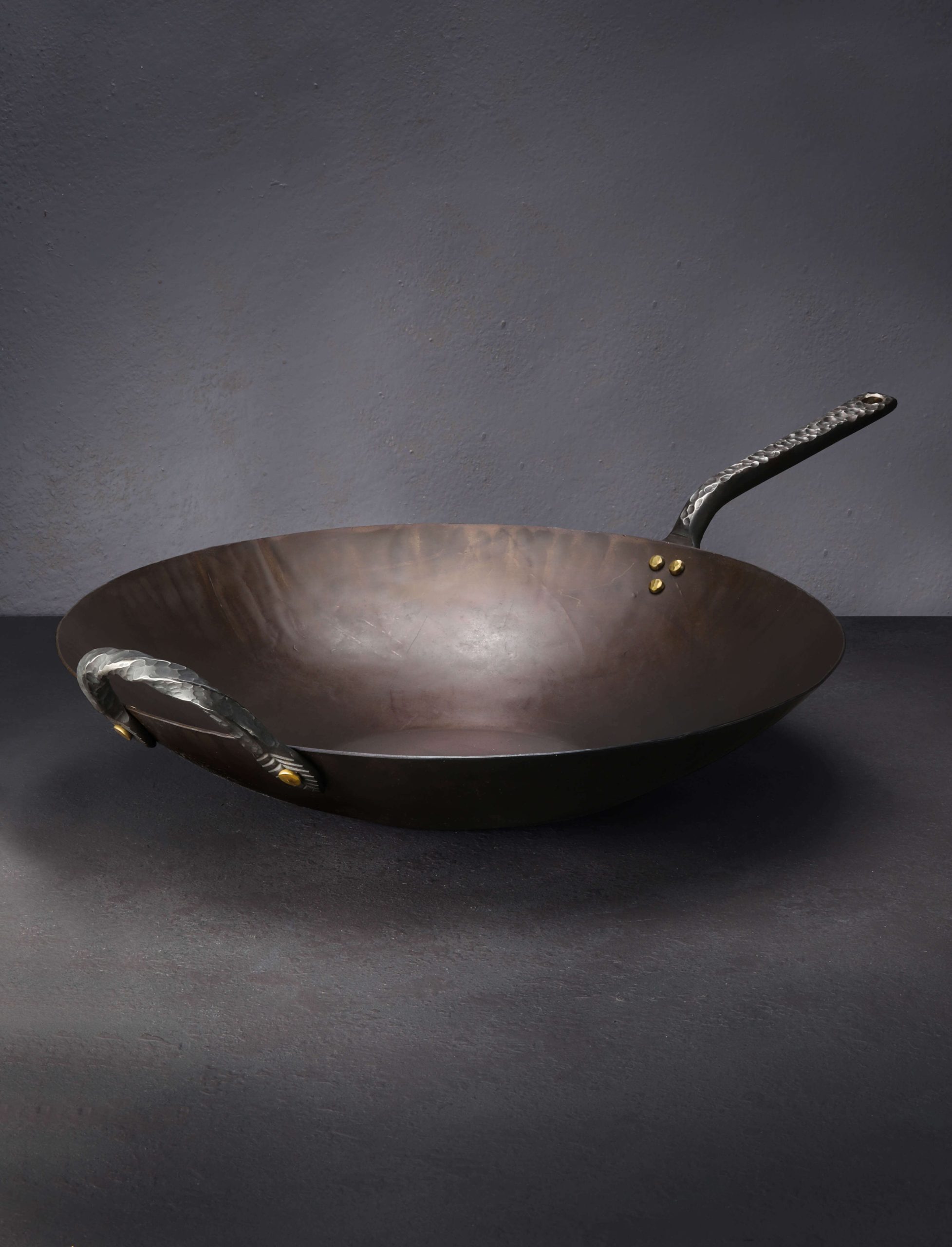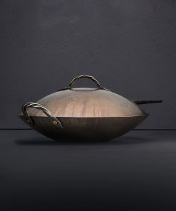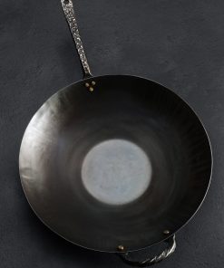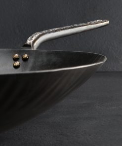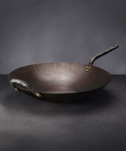 Impressive in every way, this gorgeous Western-style wok is forged and shaped by hand from carbon steel for a one-of-a-kind cooking experience. Designed and crafted by Ryan Sanden of Stage Coach Forge in Oregon, this is the largest pan in his repertoire, measuring 15″ across and three inches tall, requiring a large amount of hand-hammering and finesse to produce a tool as functional as it is beautiful. With its flat bottom this wok is ideal for stir fries and deep frying over a standard range, whether glass top or open flame, as well as in the oven. A beautifully forged long handle plus helper handle, each with hammered solid brass rivets, show the abilities of this experienced artist blacksmith and offer comfort and control during use. Seasoned at the Stage Coach shop, each one-of-a-kind pan is ready to cook with, and should be used and enjoyed often to build additional non-stick properties.
