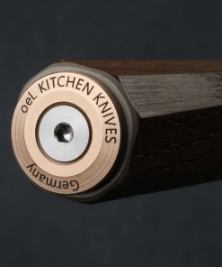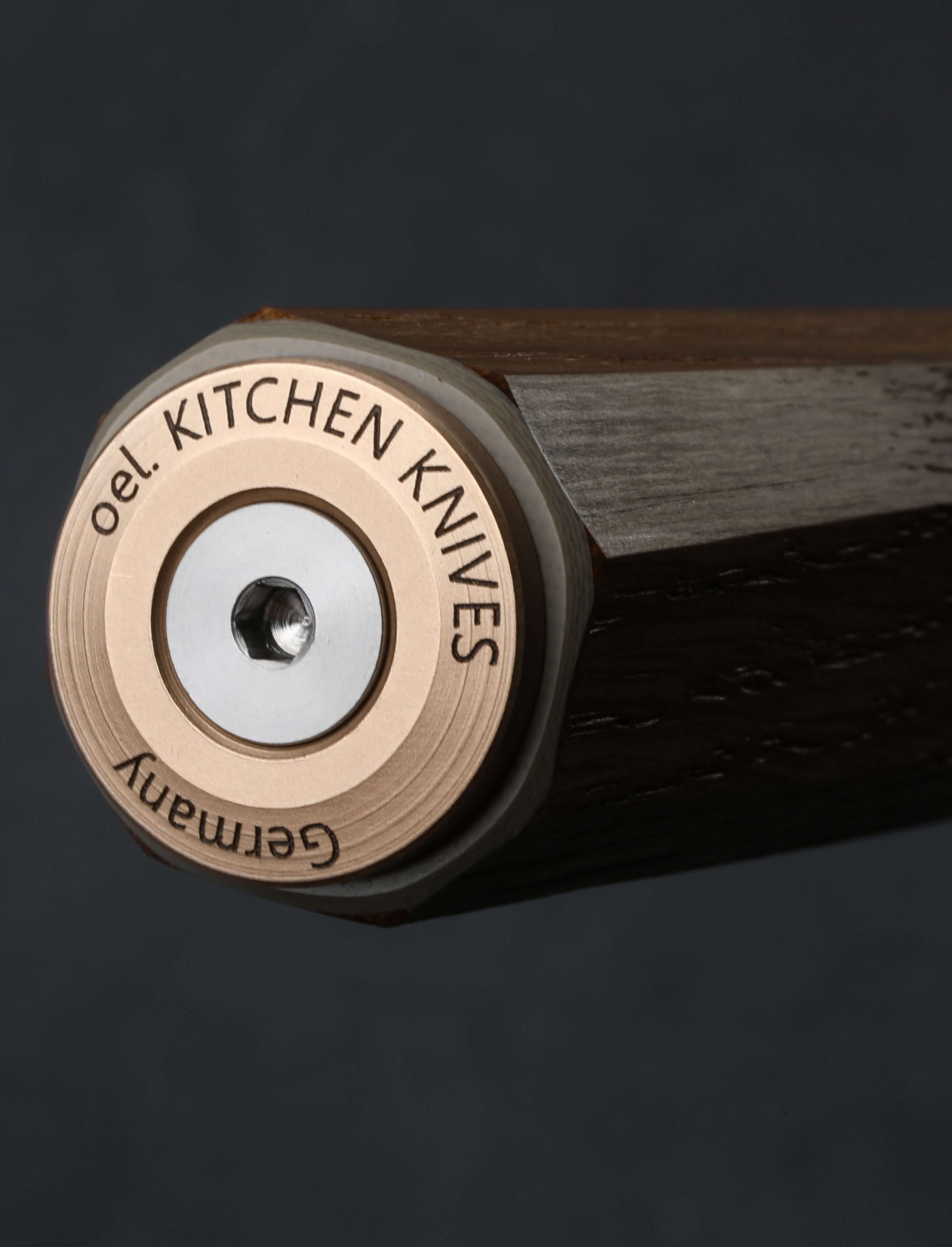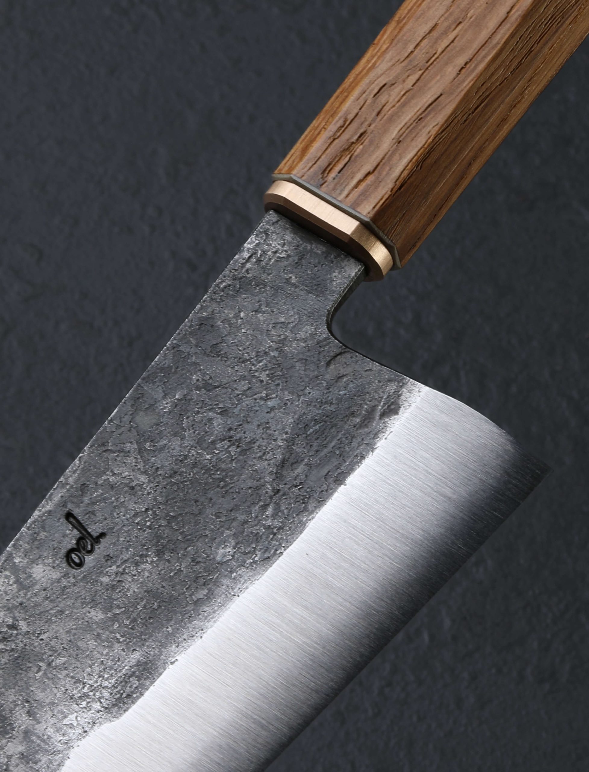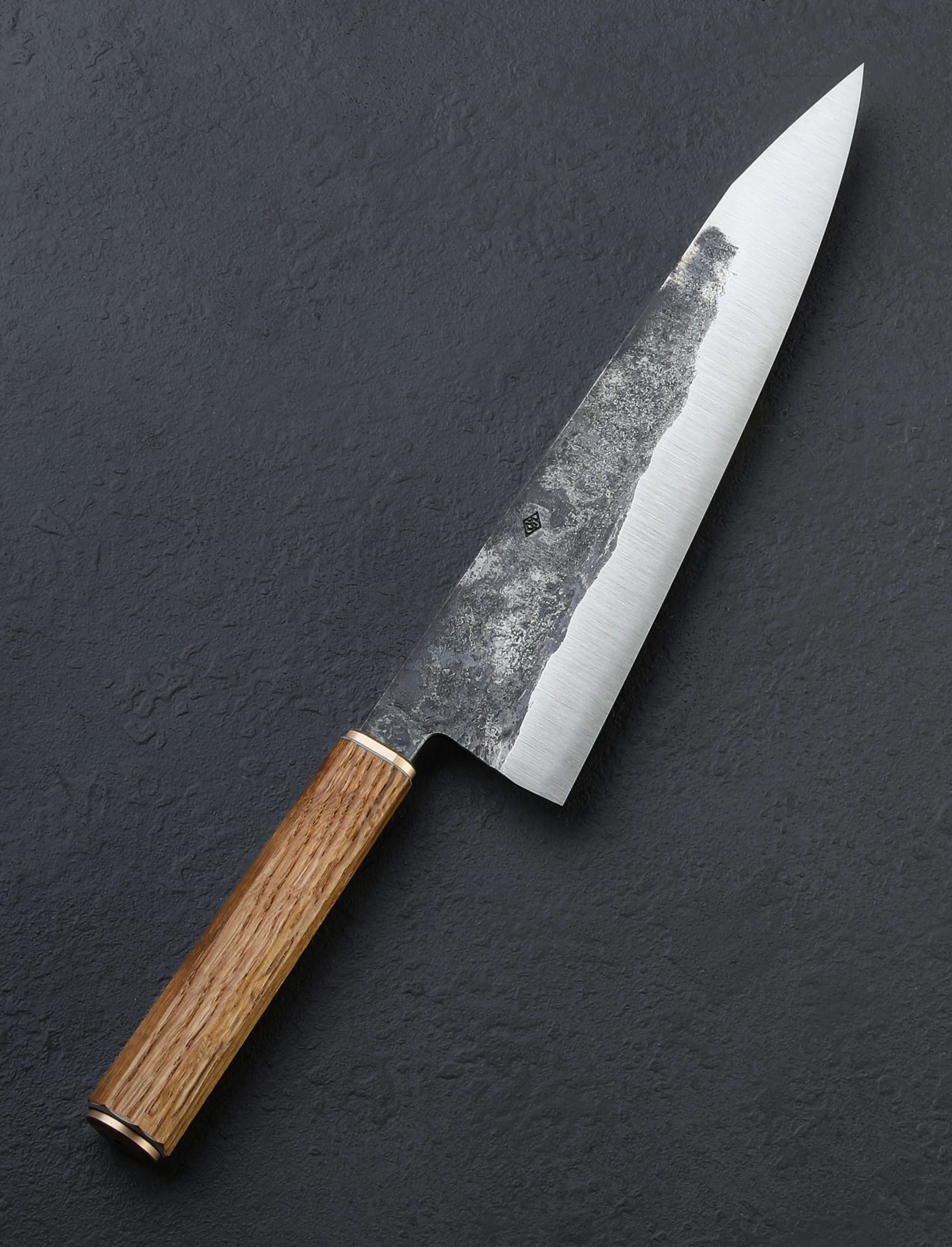 German bladesmith Oliver Märtens creates a technical, high-performance gyuto designed for precision on the cutting board. Light, thin, and quick in the hand, Oliver has hand-forged with care and purpose the hollow portion of the blade’s compound bevels and left that area with a dark, forge finish. From there down to the edge, and forward to the incredibly slim, pointed tip, the 14C28N stainless steel then receives an all-business belt finish. Beneath the darker hollow stretch, the bevels are convex to the razor-sharp, thin edge for added food release. Balancing around one centimeter in front of the 57mm-tall heel, the knife could not feel better in the hand, the blade profile designed for any and every cut, and the handle for any hand size and grip style. That handle, in octagonal wa-form, is carved from oiled oak sourced locally to Oliver’s Kassel, Germany studio. Capped with bronze in the front and back with black G10 liners and a titanium locking screw, Oliver has made the handle easy to remove in case care and maintenance are needed. An hard-working tool created for the discerning chef.