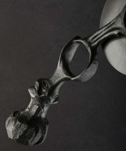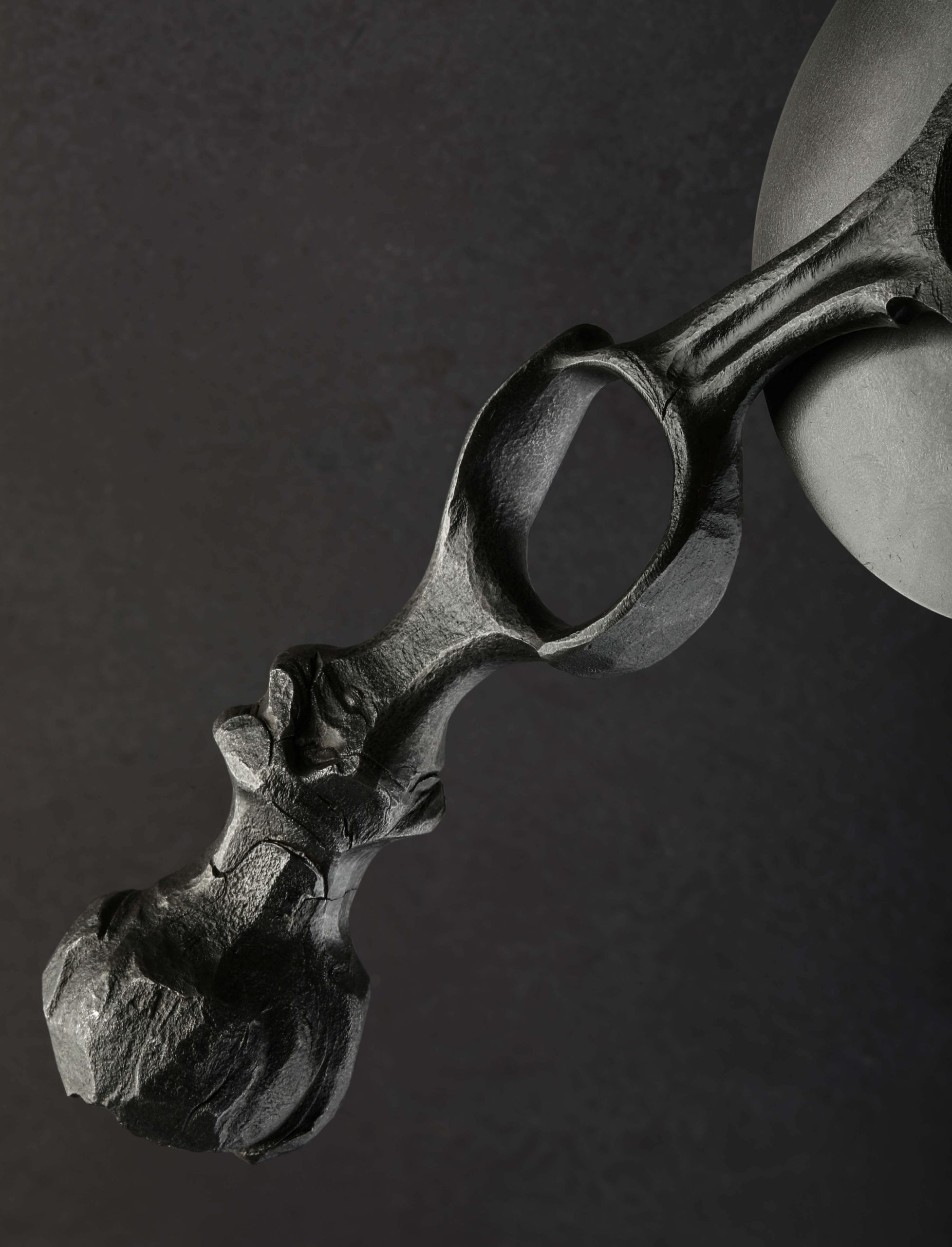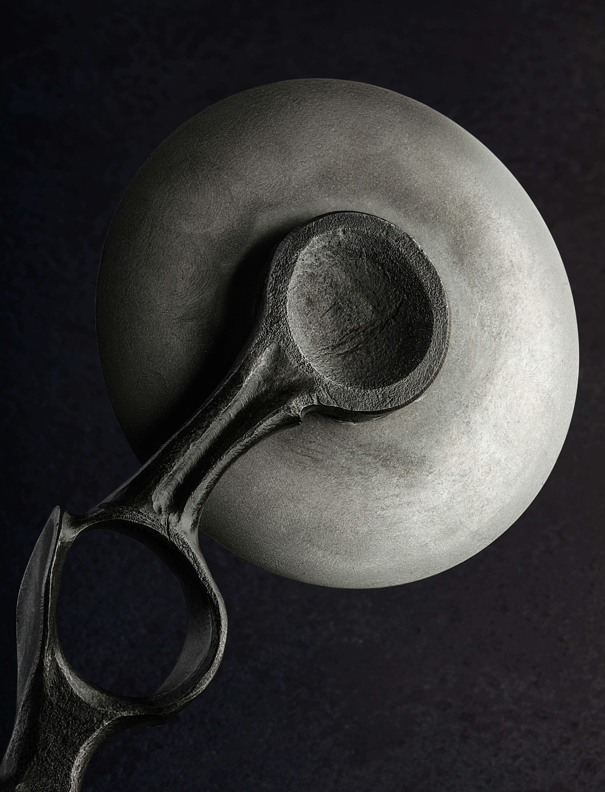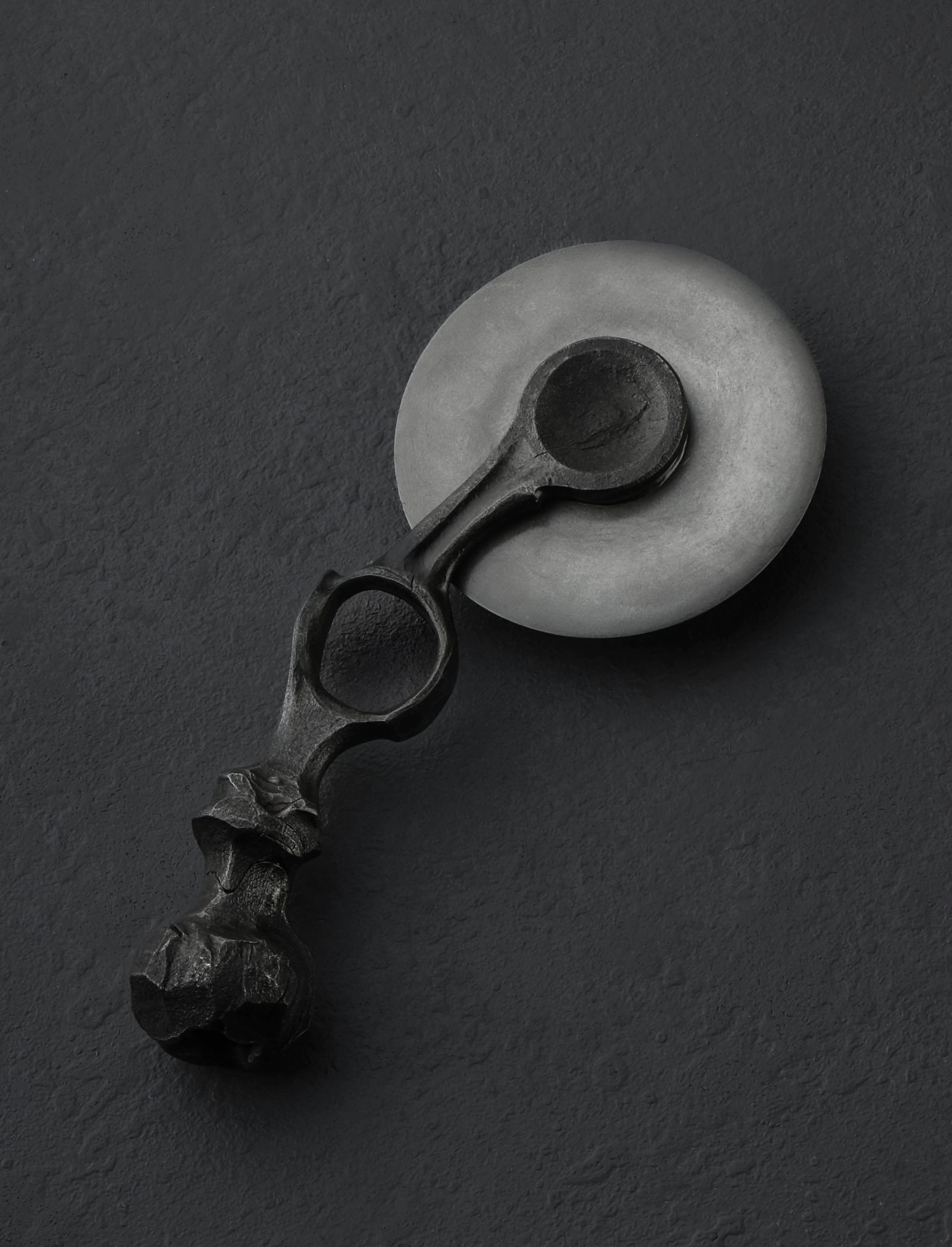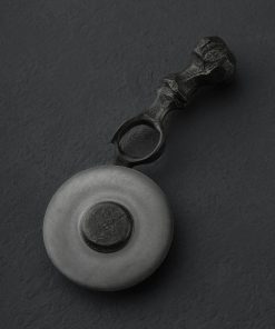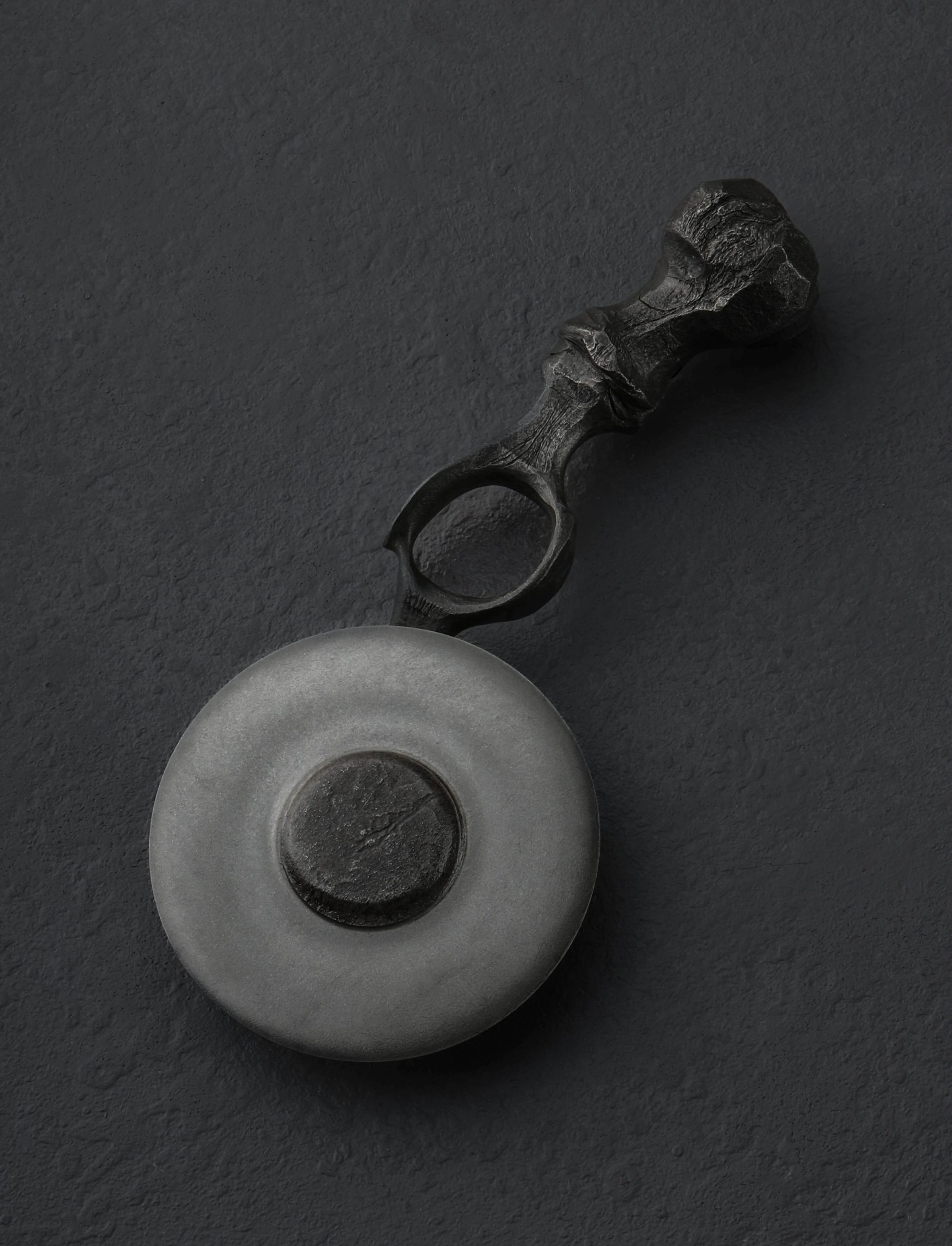 Multiple disciplines with which we associate Rhode Island artist Joshua Prince are on display throughout the construction of this one-of-a-kind handcrafted pizza wheel. The raw material itself that forms both handle and circular blade is of Joshua’s creation: stainless wootz steel able to be worked, shaped, and, hardened, began its journey in liquified form in a crucible in his one-man shop. That homemade, traditionally concocted wootz then receives a brute-de-forge treatment through hammer and fire to make a handle that is as beautiful and sculptural as it is comfortable and ergonomic, in spite of, or perhaps because of, its rustic appearance (a duality we see often in Joshua’s work). Finally, mounted at the end of the arm, riding on steel ring ball bearings, is a wheel forged, ground, and finished from the same stainless wootz steel as the handle. For the sake of pizza, for the sake of art, for the sake of the modern culinary experience, an heirloom tool of exceptional character.