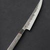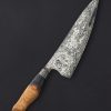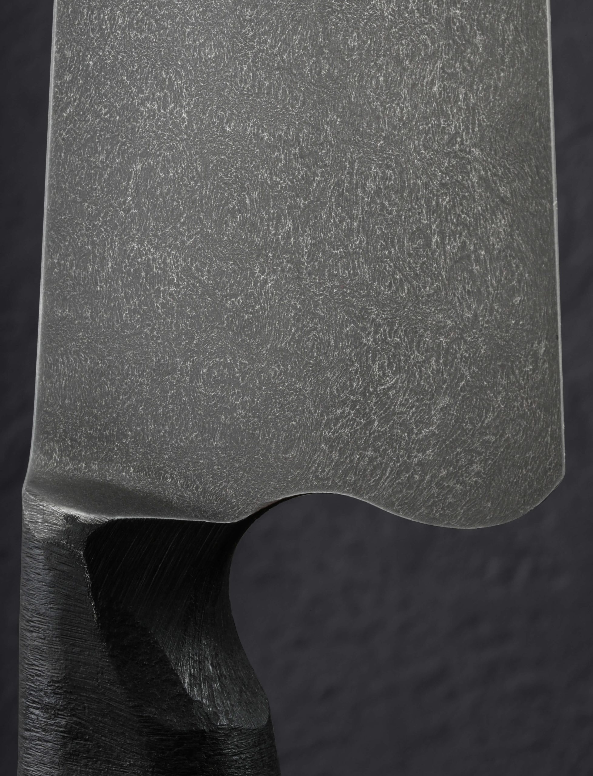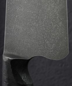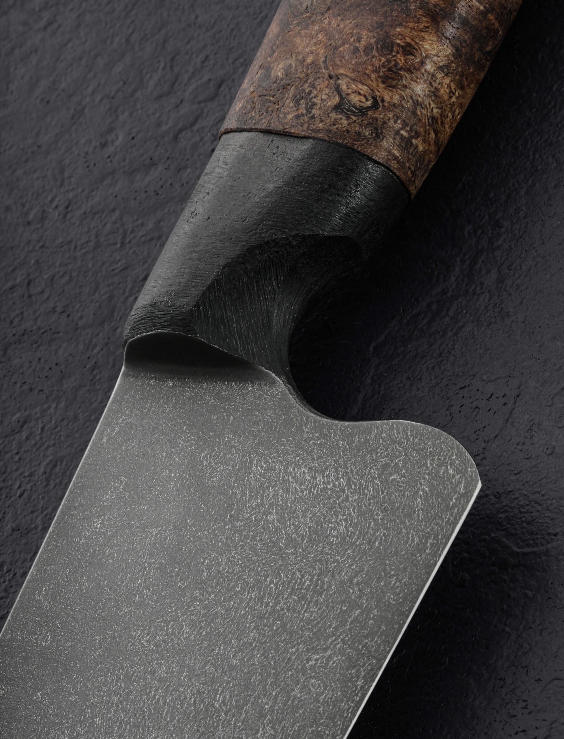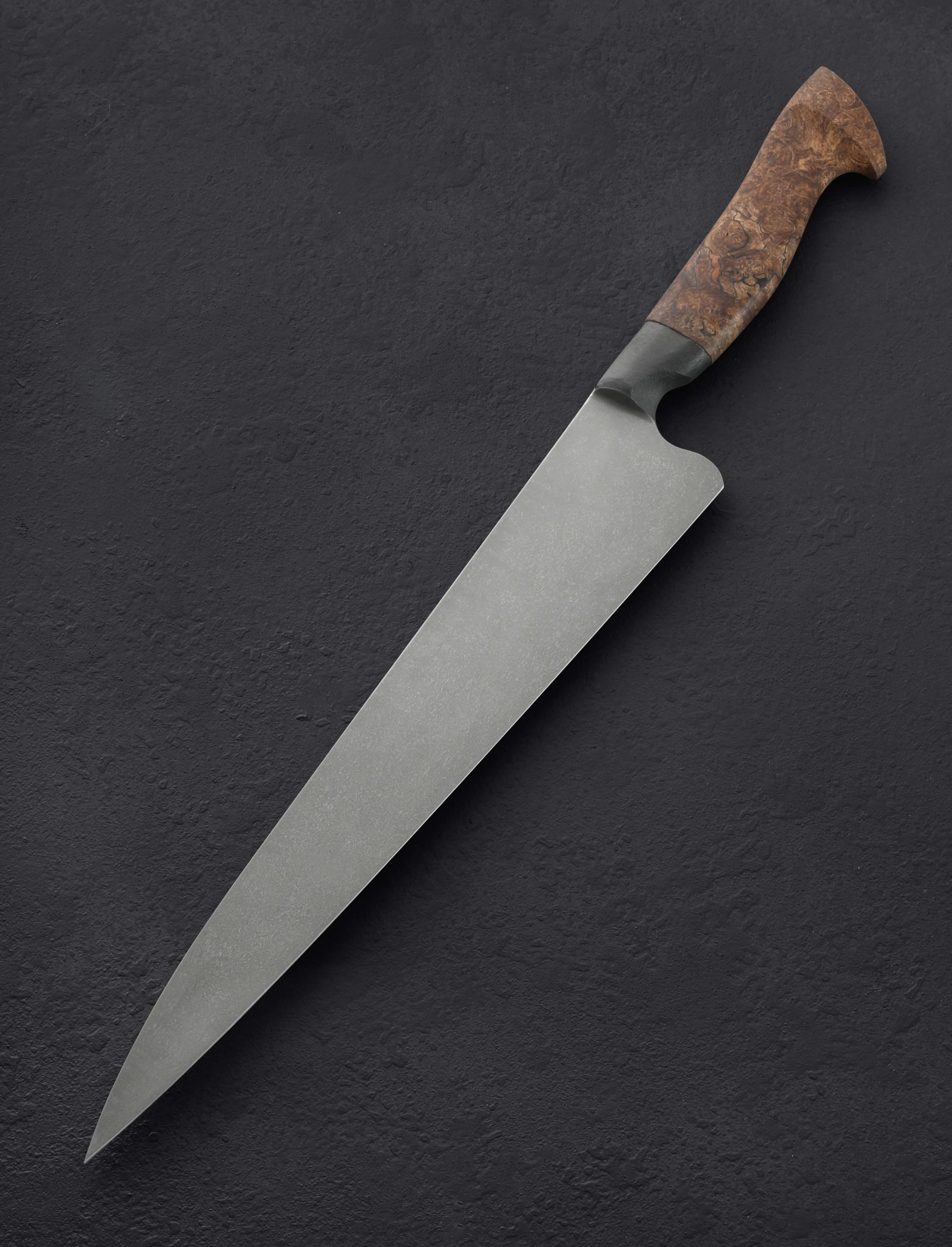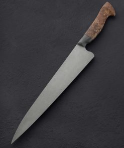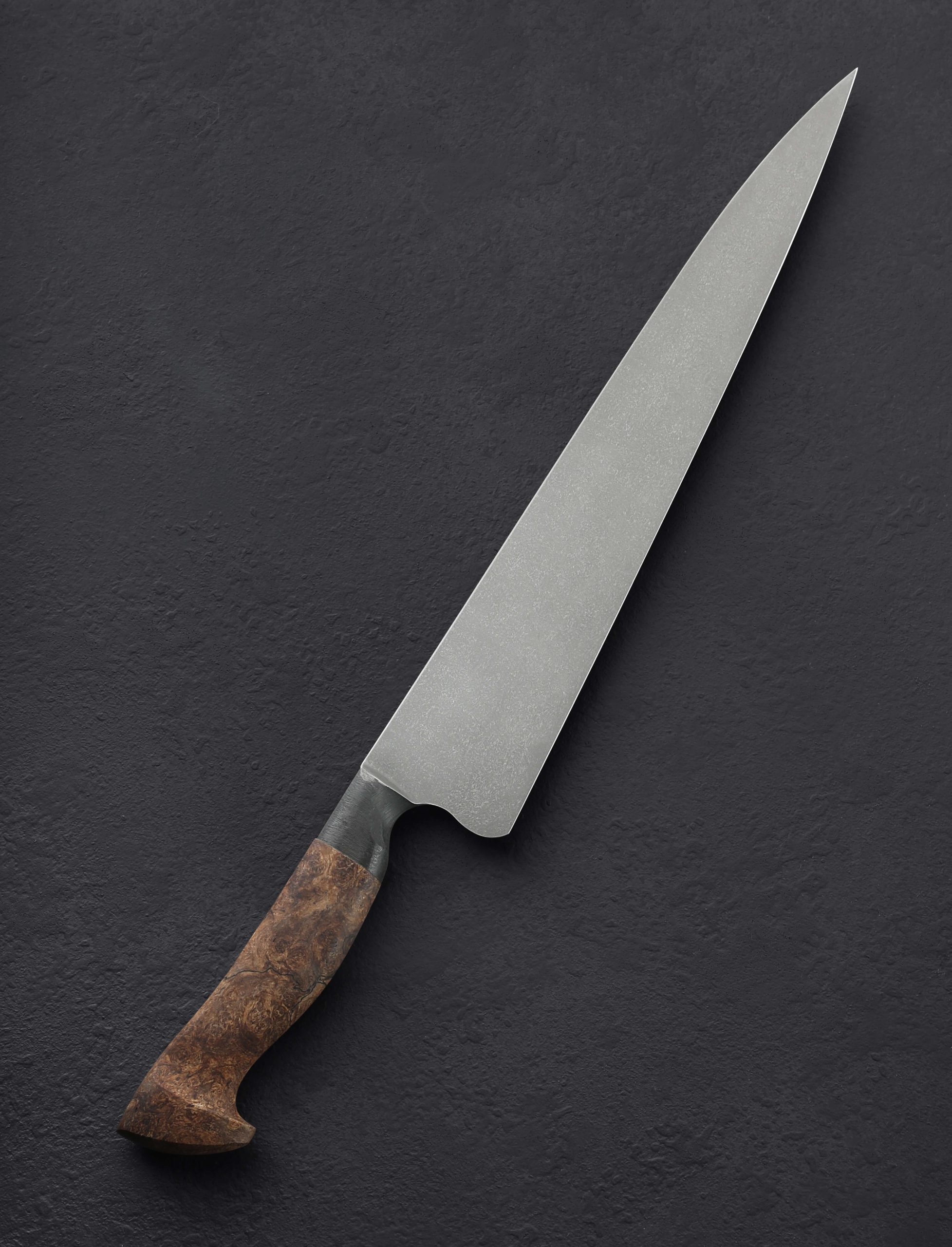 If this makes your jaw drop, you are not alone. In another first from bladesmith and metal artists Joshua Prince, the massive, 354mm / 13.9″ blade of this slicer is forged by hand from homemade stainless wootz steel. Liquified in a small crucible at his Rhode Island studio and then forged by hand into the handsome, larger-than-life blade witnessed here, the finished material displays the same beautiful damascus-like pattern expected of wootz, with the easy care and maintenance of a stainless steel chef knife. Thin at the edge with subtly convex bevel geometry below a tapering blade spine with facets along each edge for comfort and good looks, this is a tool with which to prepare and serve the largest cuts of protein, or nearly anything else requiring an oversized amount of sharp steel. Paired to the brute-de-forge style integral bolster, sculpted and comfortable with heirloom fit-up is a striking piece of buckeye burl carved into a Western form to complete the handle.
