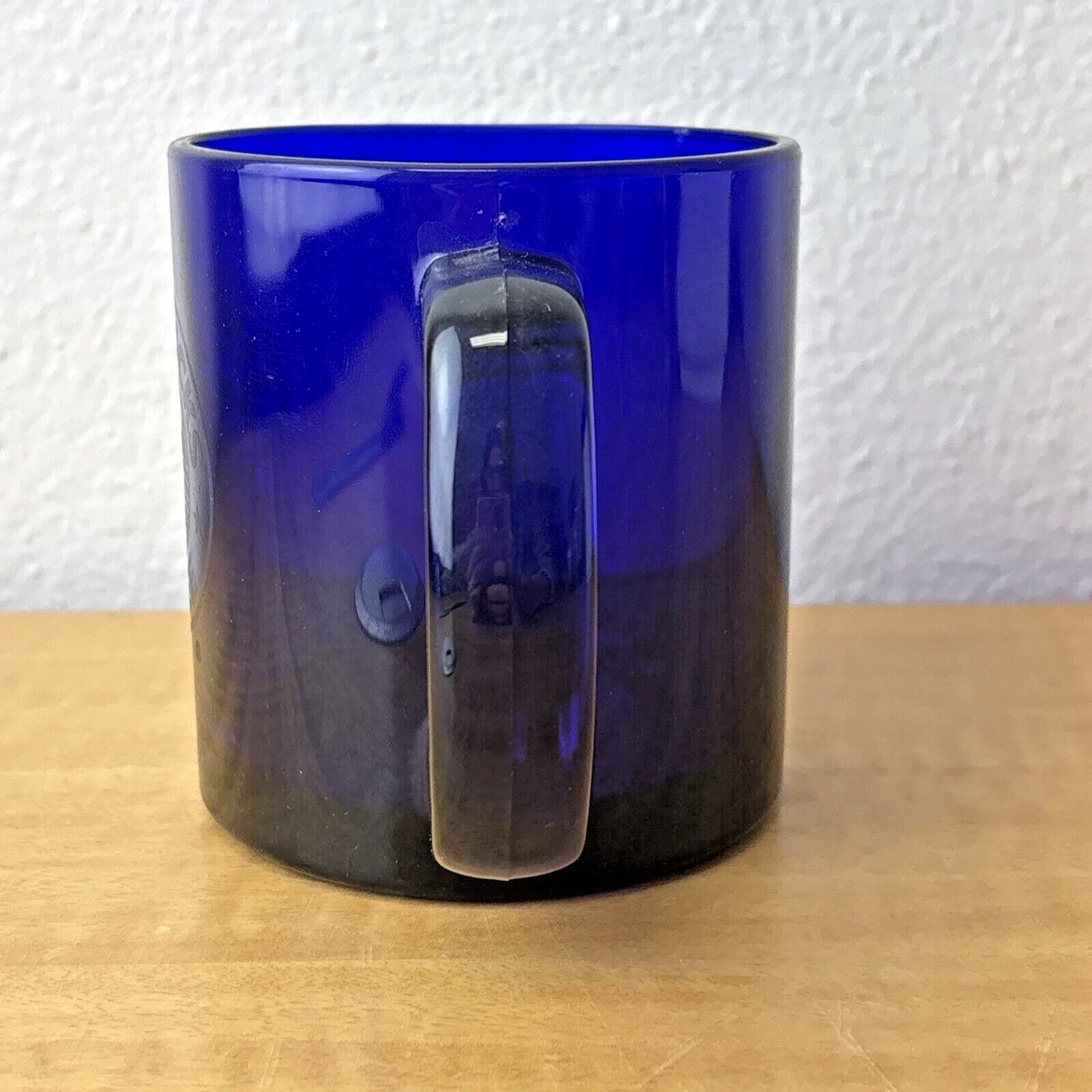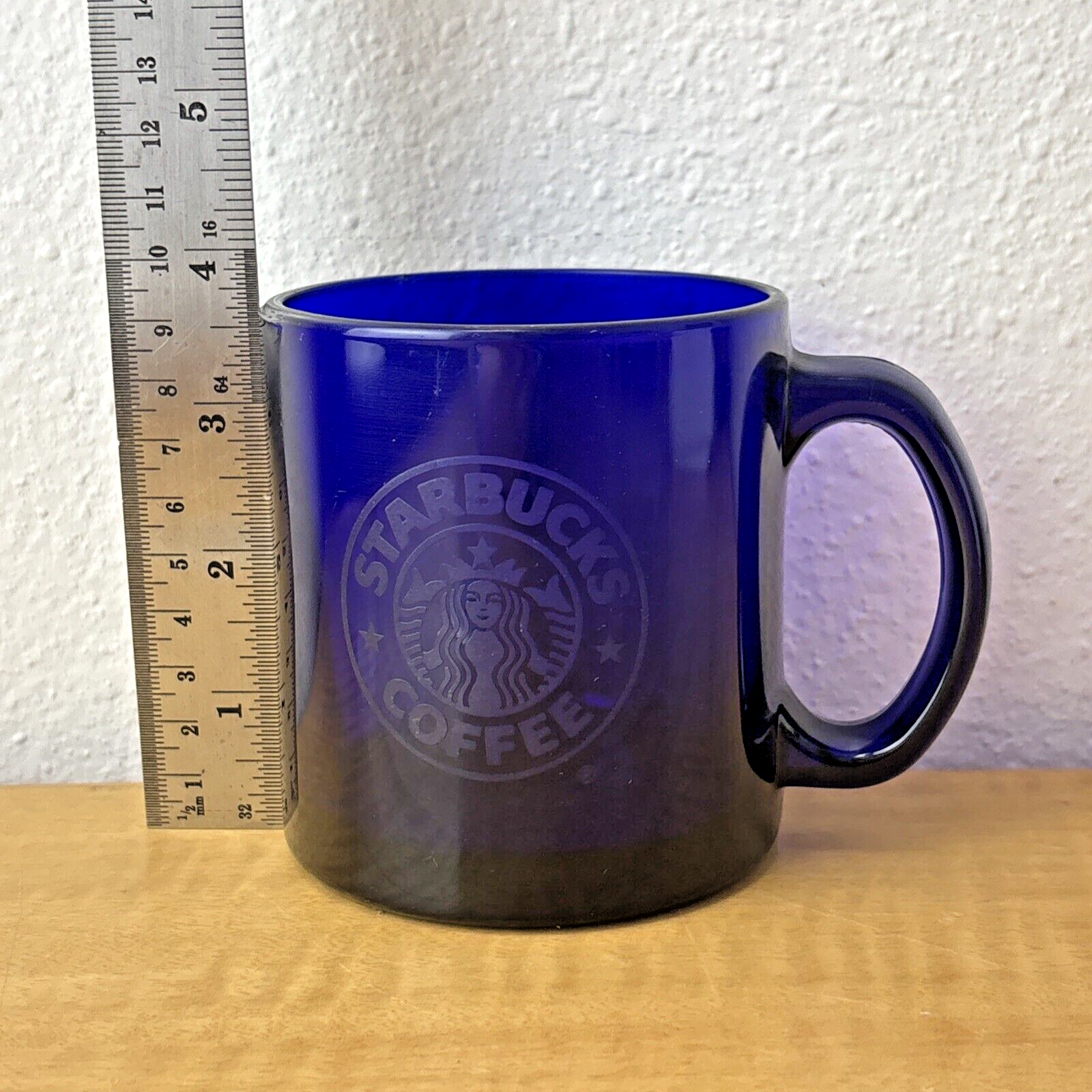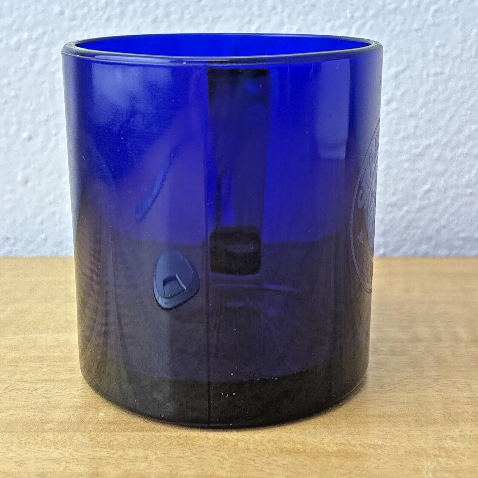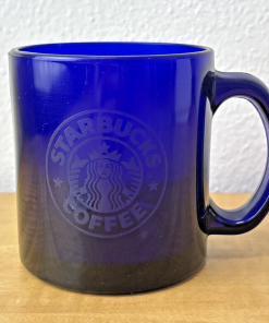 Starbucks Coffee Cobalt Blue Mug 3 3/4″ Tall Glass 12 oz Etched Mermaid Logo EC