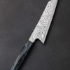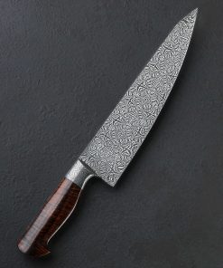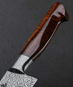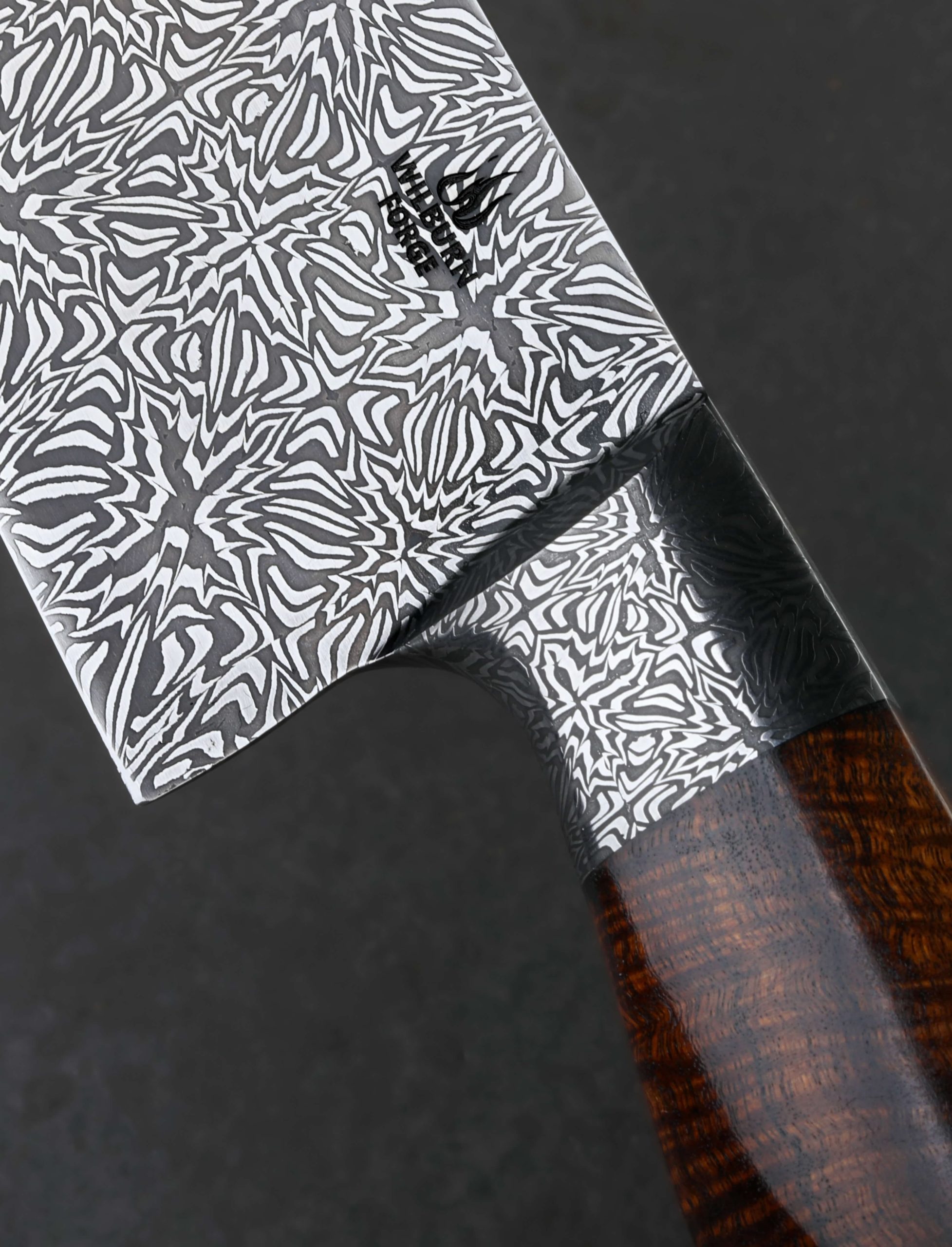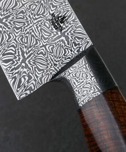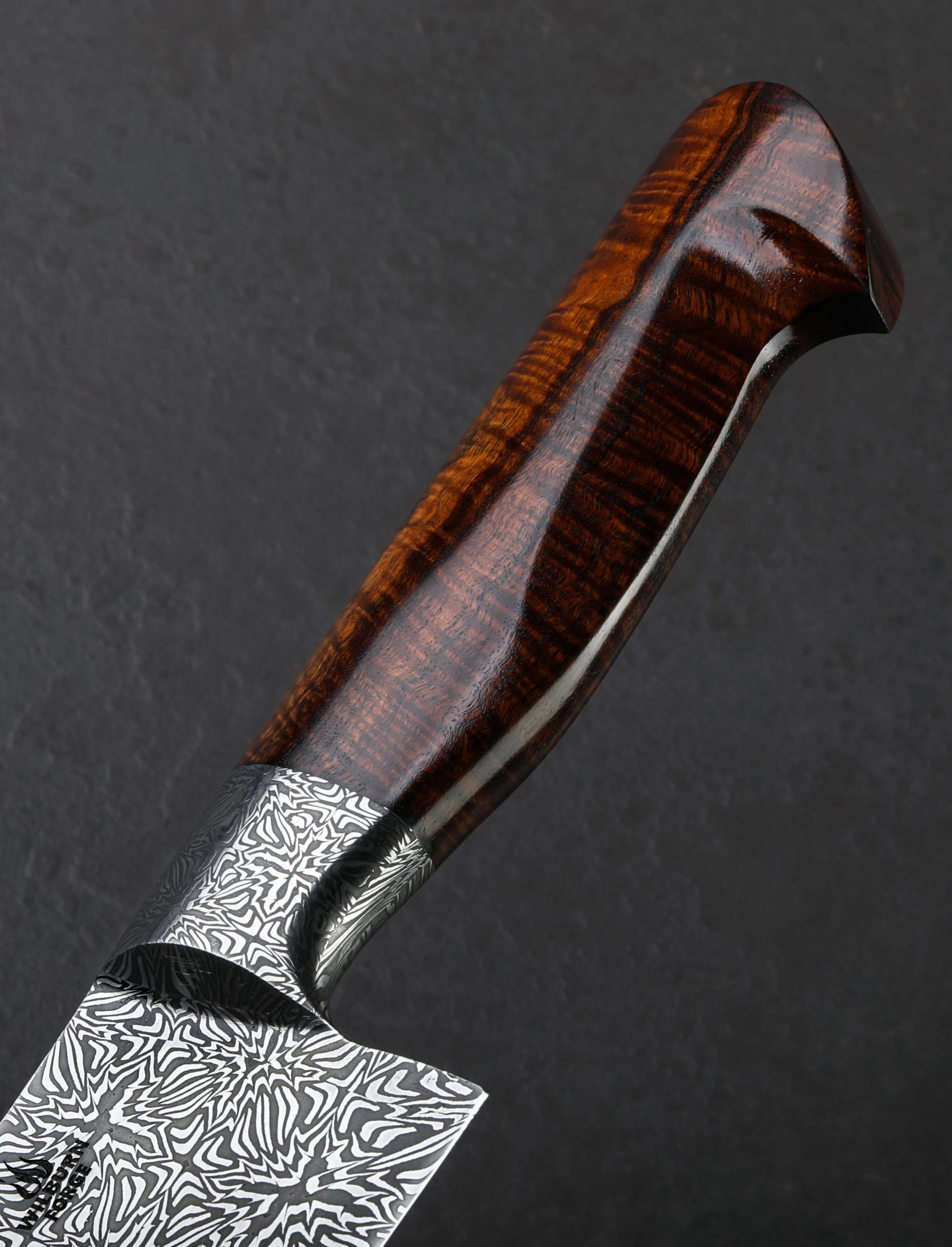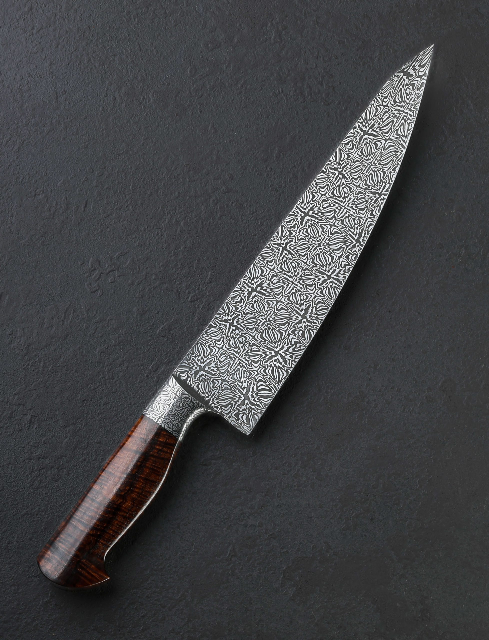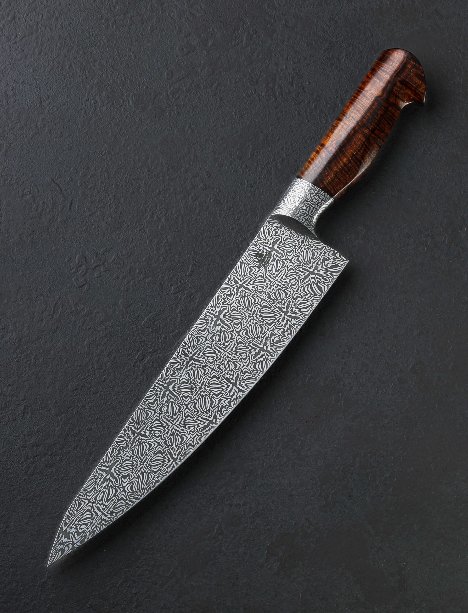 A metallic starburst by ABS Master Bladesmith Aaron Wilburn in carbon damascus alloys is tiled along the length of this 264mm chef’s blade to produce a mosaic that shines as brightly as its namesake. If you’re unable to avert your eyes, not to worry; unlike the celestial phenomenon, looking straight into this magnificent object will do no damage. To the contrary, the latest one-of-a-kind culinary tool by this talented Idaho-based artist is designed for everyday use in kitchens large and small, poised to become any chef’s workhorse for every cut from the largest to the most delicate. Beneath the integral forged starburst damascus bolster and just forward, where the blade stands 57mm tall at the heel, toughness and rigidity for chopping tasks are balanced by lateral flexibility and an especially thin tip in the forward half. These thoughtful and versatile attributes are further enhanced by an edge profile that sees a high tip and deep belly to produce a pronounced, up-swept curve to the edge designed for slicing and carving work. Throughout the blade’s bevels which present Aaron’s striking artwork of layered steel with a high-contrast, etched, and polished finish, the geometry is tall and convex, slimming downward from the tapering spine to a very thin, hard, and razor-sharp edge. While the first fingers wrap around the sculpted handle bolster shaped from the same steel as the blade, the rest hug an ergonomic, carved piece of beautiful Hawaiian Koa with natural grain and color to match the unique-yet-classic aesthetic of the knife as a whole.