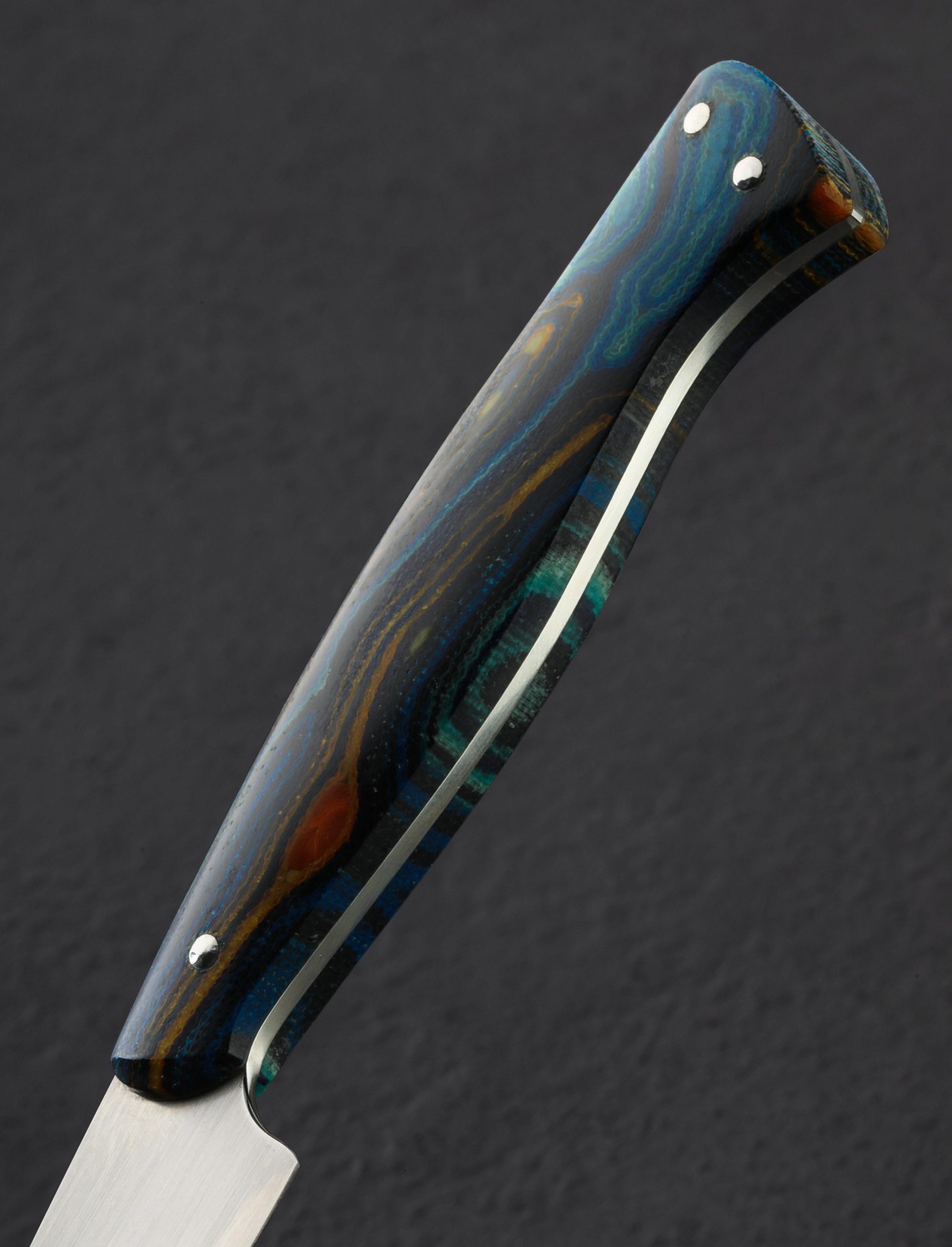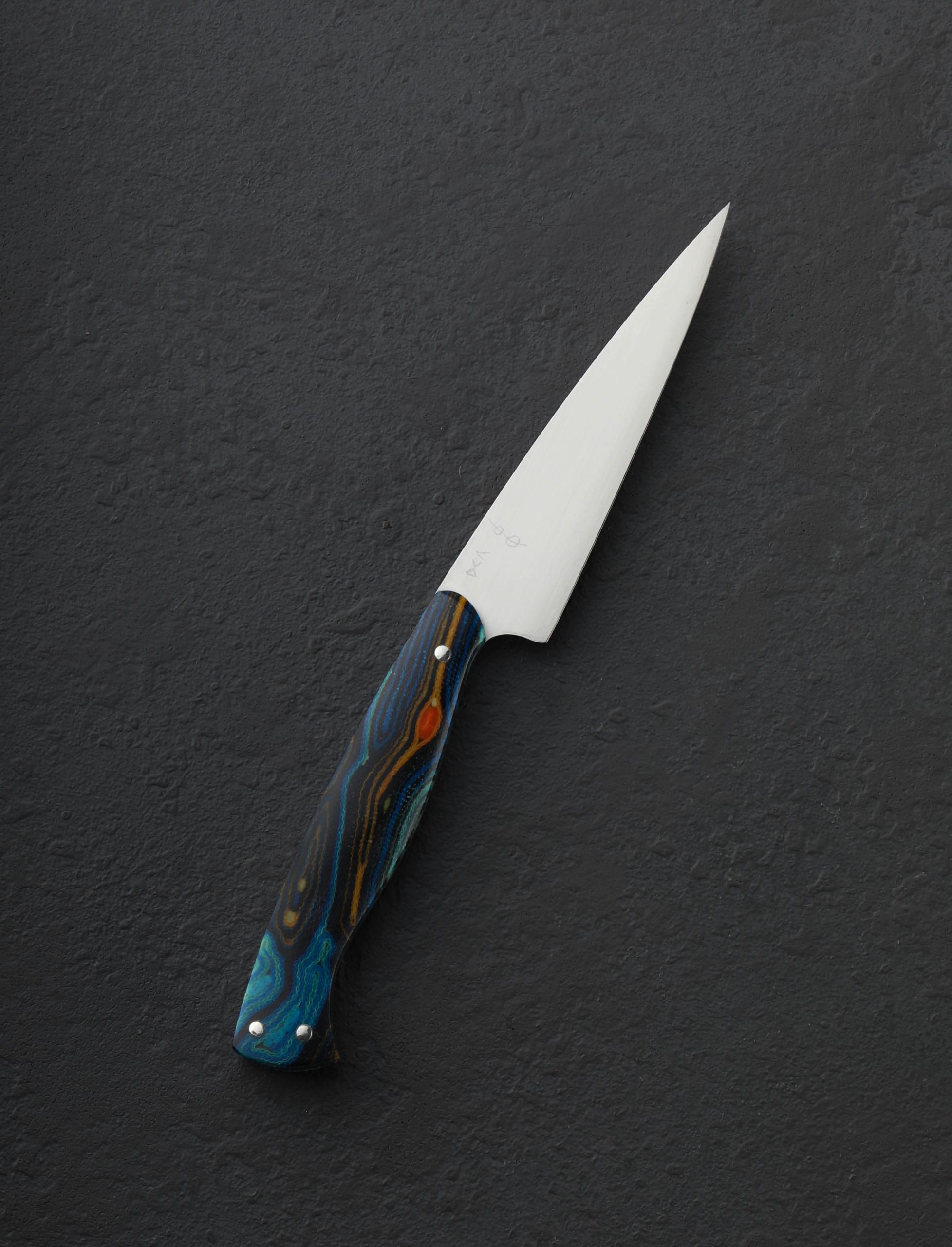 In an elegant and unique paring knife profile that Don Carlos Andrade produces only rarely comes a tool designed for versatility and suited especially well to handheld work above the board as well as detailed slicing work with its slim, aggressive tip. Inspired by Vincent Van Gogh’s iconic work, this one-of-a-kind parer boasts a sculpted, Western style, full-tang handle in G.L. Hansen & Son’s handmade Starry Night G-Carta. Layers of carefully laid fabrics are compressed under high pressure with resin to form the stunning material which Don secures with three domed, hand-peened stainless steel pins. At the business end of the knife is 100mm of razor-sharp, satin-finished RWL 34 stainless steel, a high-performance alloy produced in small batches by specialty Swedish steel maker Damasteel. Tapering along the rounded, polished spine to an especially fine, pointed tip, the hard-working blade enjoys Don’s superb convex geometry above a sharp, thin edge.