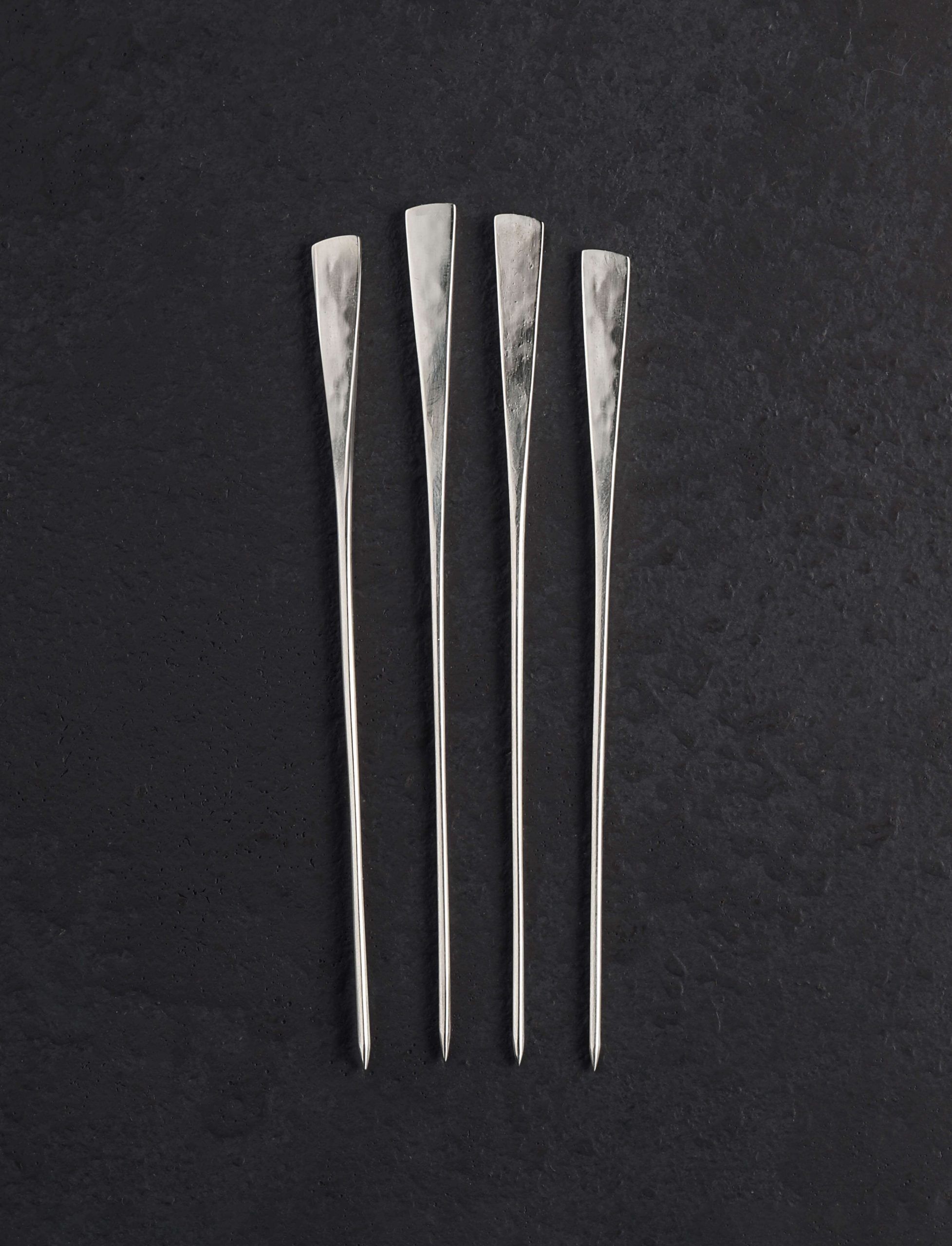 Elegant and unique, sterling silver cocktails picks hand-forged one at a time make an exceptional gift for the host or mixologist. To create these four-pick sets Metalsmith Corey Ackelmire begins with solid 925 silver, carefully shaping each one by one to form the simple, beautiful form seen here. Slim and nicely tapered from a wide, flat top that bears the marks of their hand-hammered origins, each will complement any glassware with style and grace.