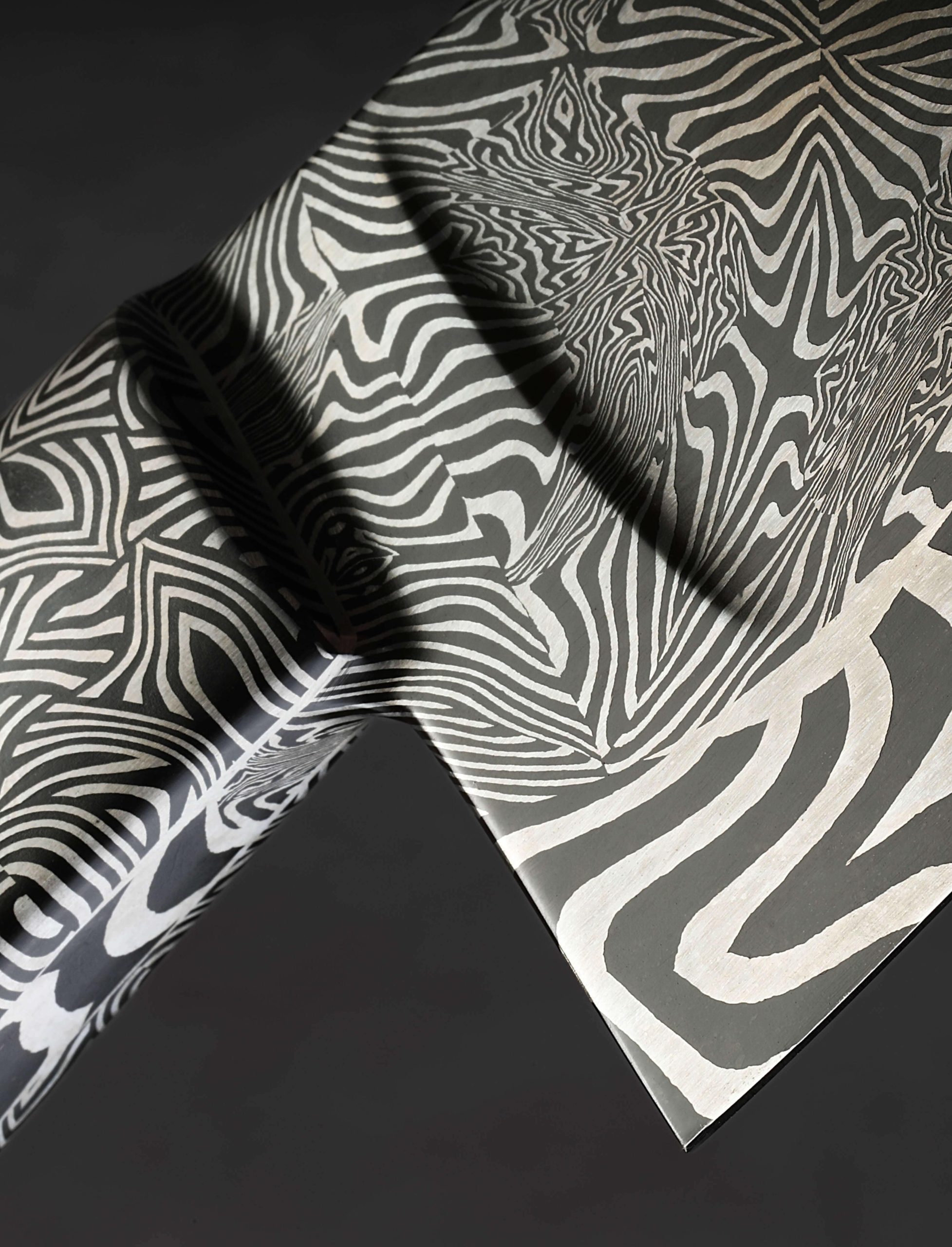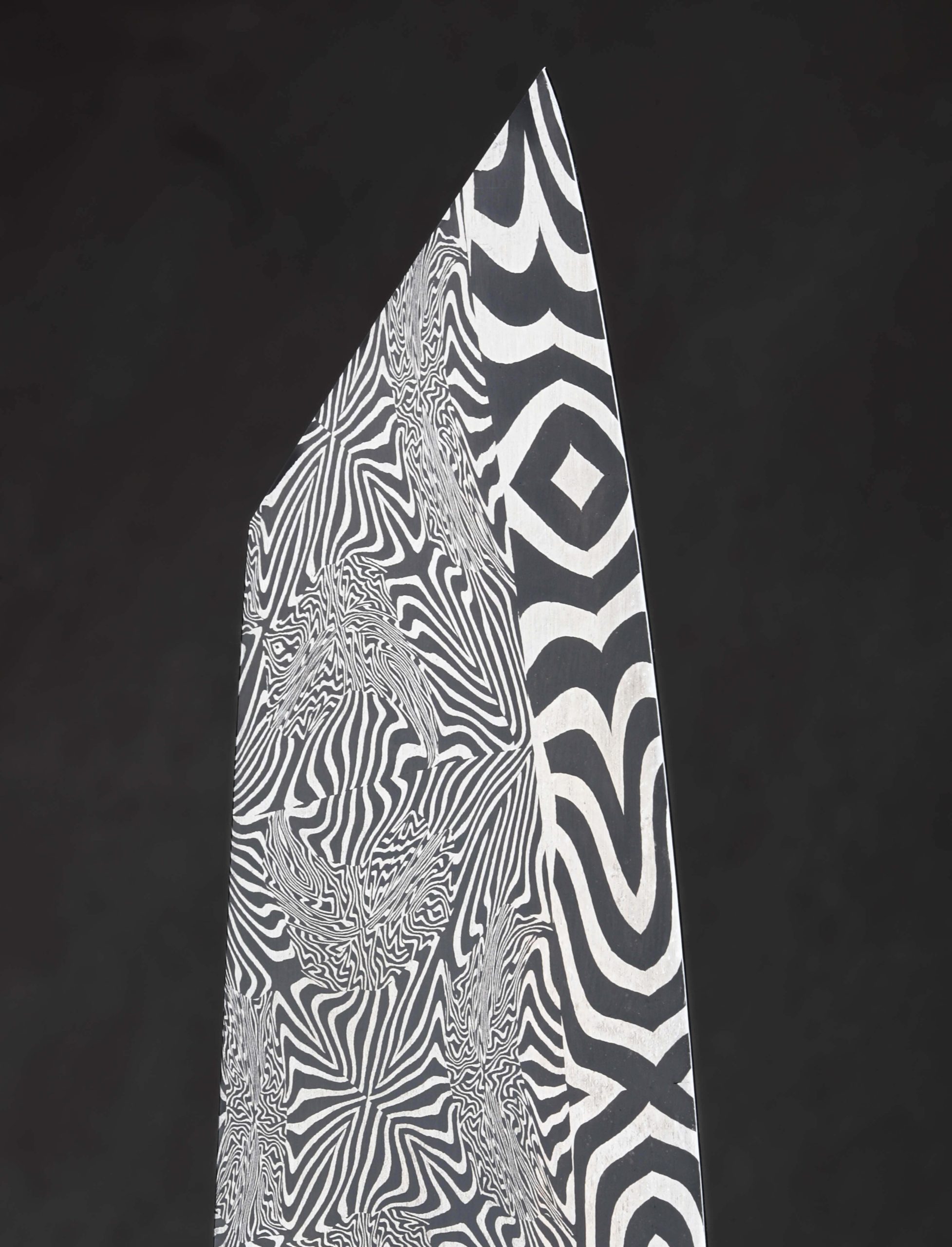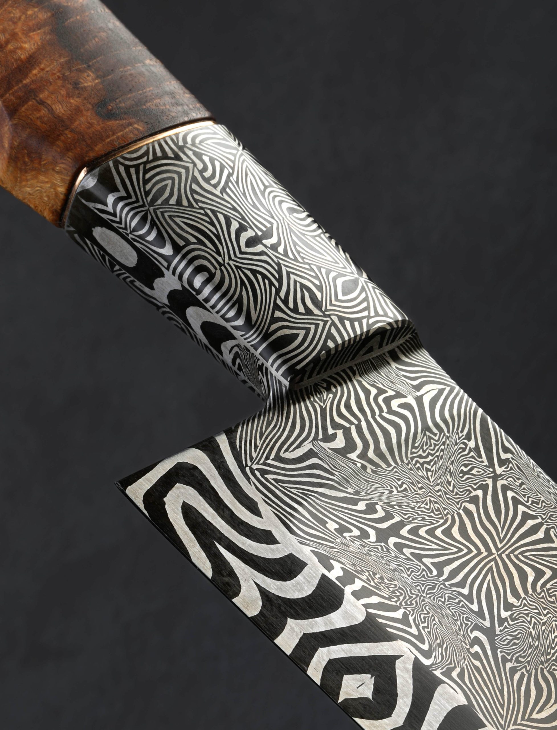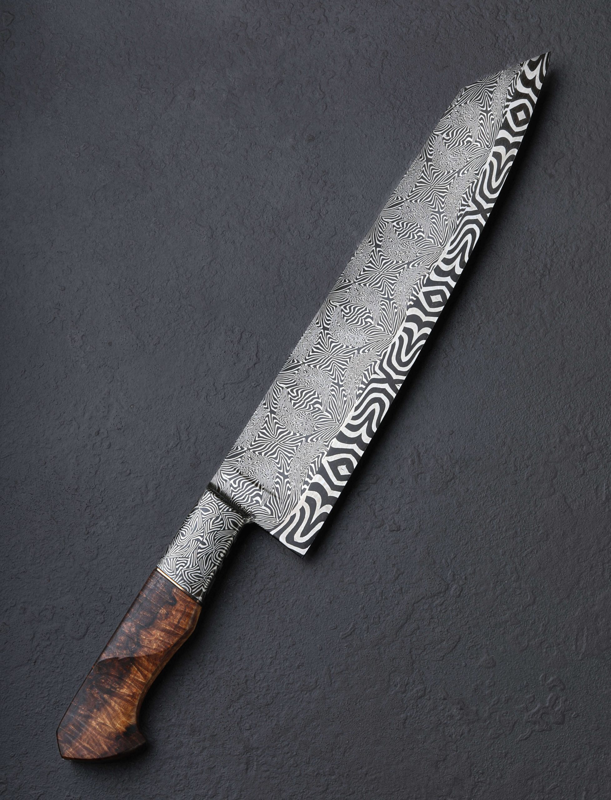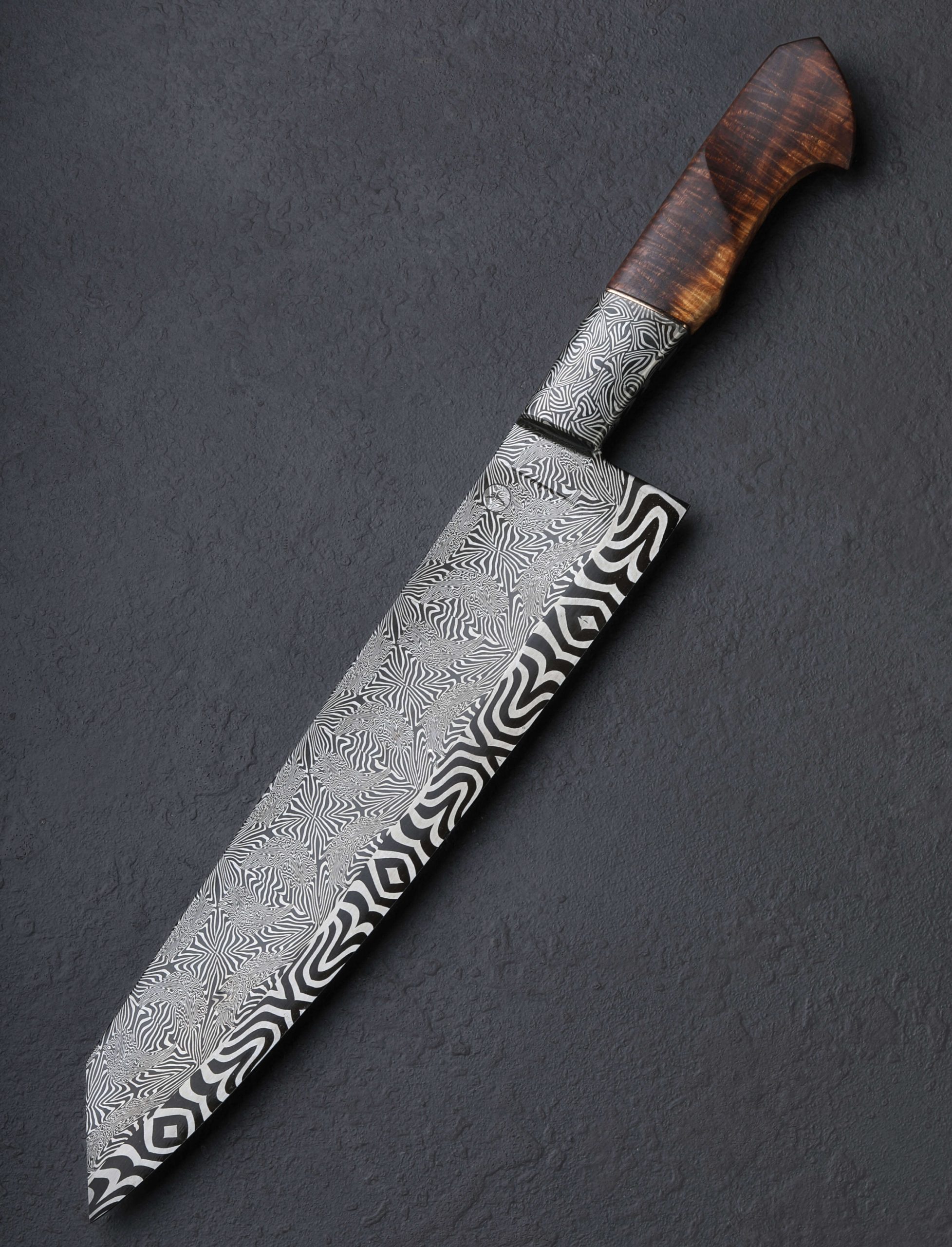 Large in size, and larger than life in spirit, this 262mm / 10.3″ pre-owned, unused, like-new chef knife from bladesmith Salem Straub includes no fewer than three distinct mosaic damascus steel patterns of Salem’s design and making. Maltese Mayhem graces the blade from spine downward through the concave portion of the compound ‘S-grind’ bevels, and then a bold, low-layer mosaic tiling forms the thin, hard edge. Behind the blade’s 54mm-tall heel is a hand-forged, integral bolster sculpted from the knife’s third damascus pattern, Tahitian Zebras. Weighted and steady in the hand, balancing just as blade meets handle, the knife feels powerful while versatile, up to the largest tasks, and precise enough for delicate slices and detail work with the extremely fine, needle-like tip. As is often enjoyed by Salem’s compound geometry blades that receive his carefully calibrated heat treatment, this knife is flexible throughout its length: not too much, and not too little. Complementing the stunning handle bolsters are an heirloom-fit cymbal bronze spacer and beautiful carved piece of Australian Ringed Gidgee to complete a stunning grip. The handle’s ergonomic, Western form is completed at the rear with a flush, polished, stainless steel retention bolt cap.