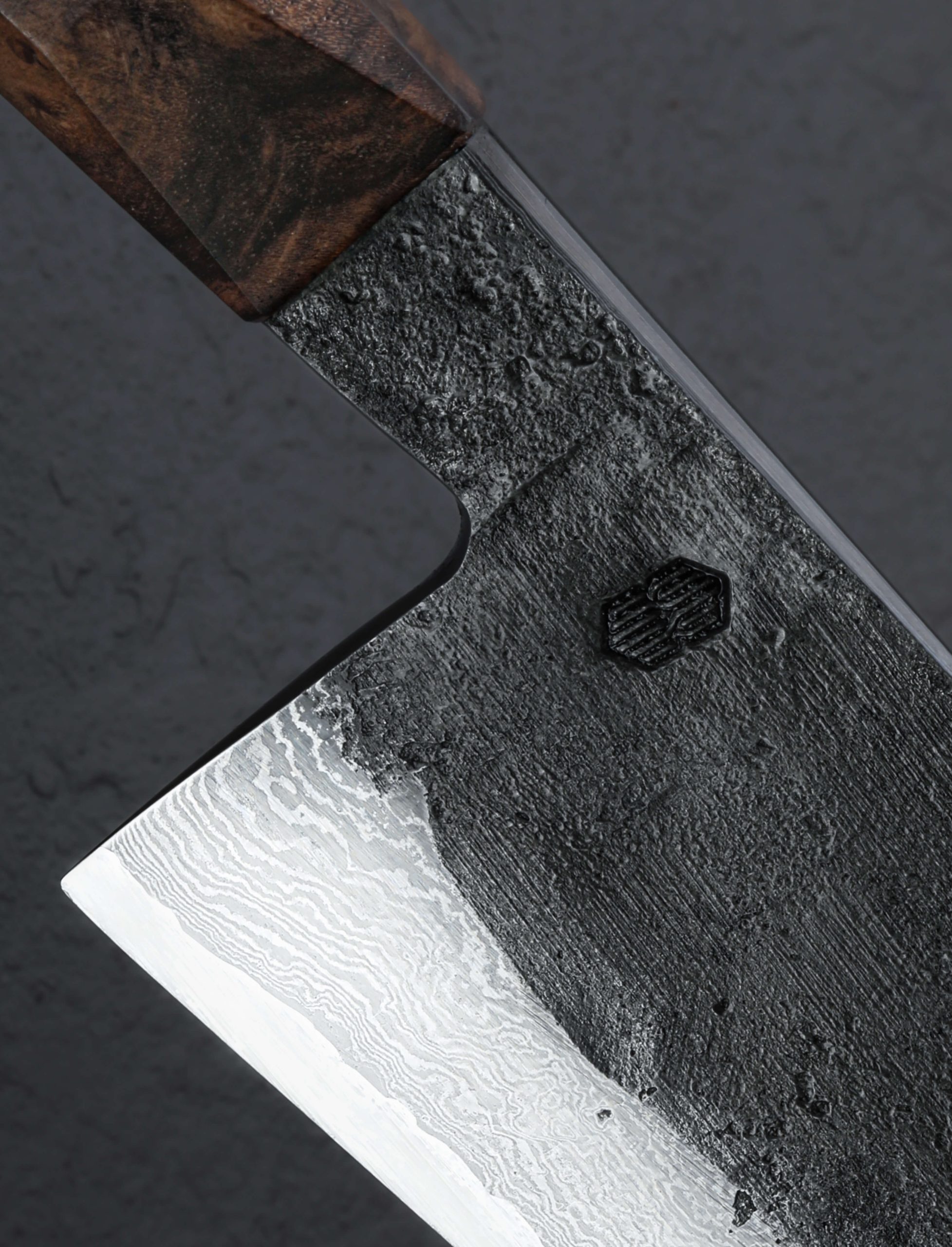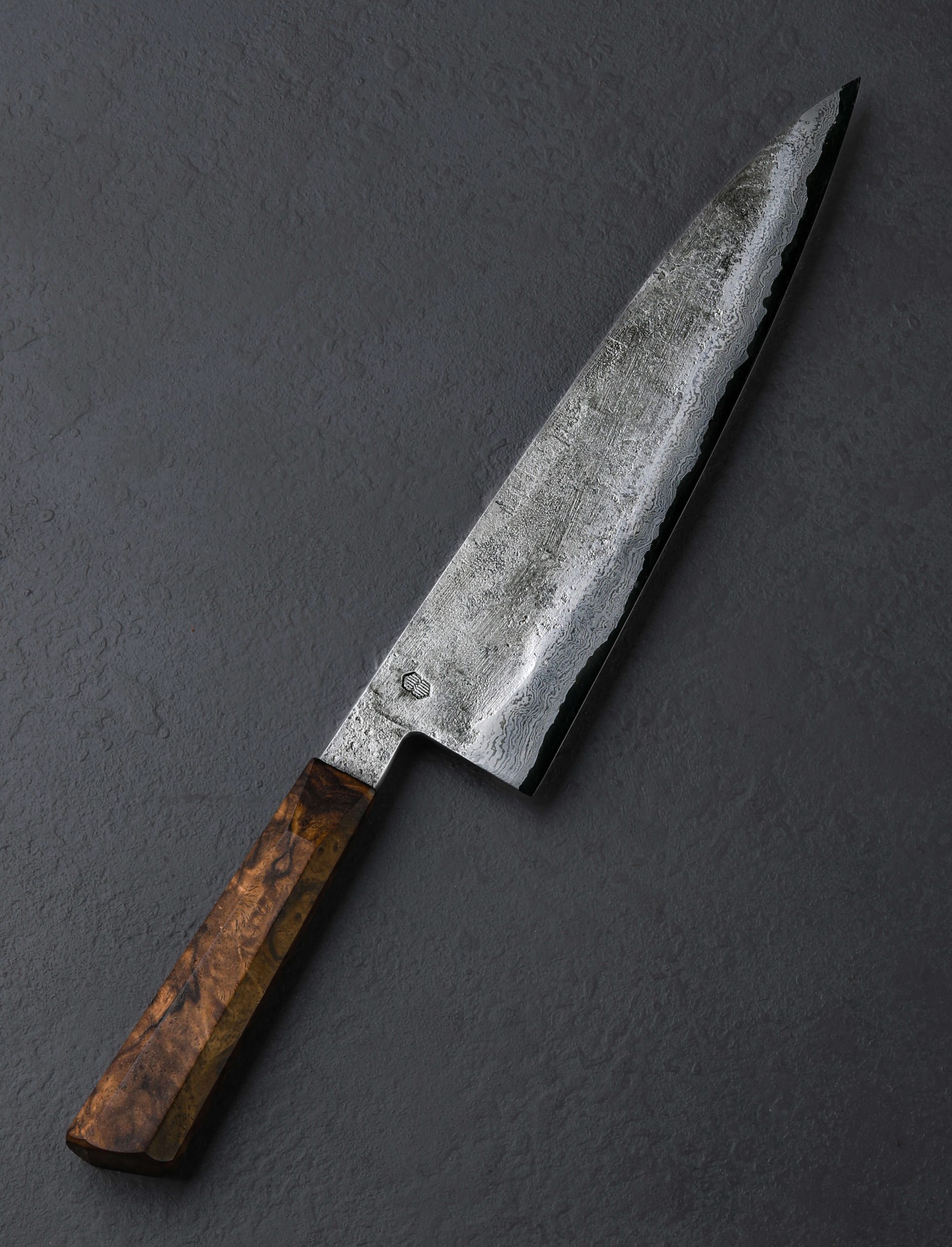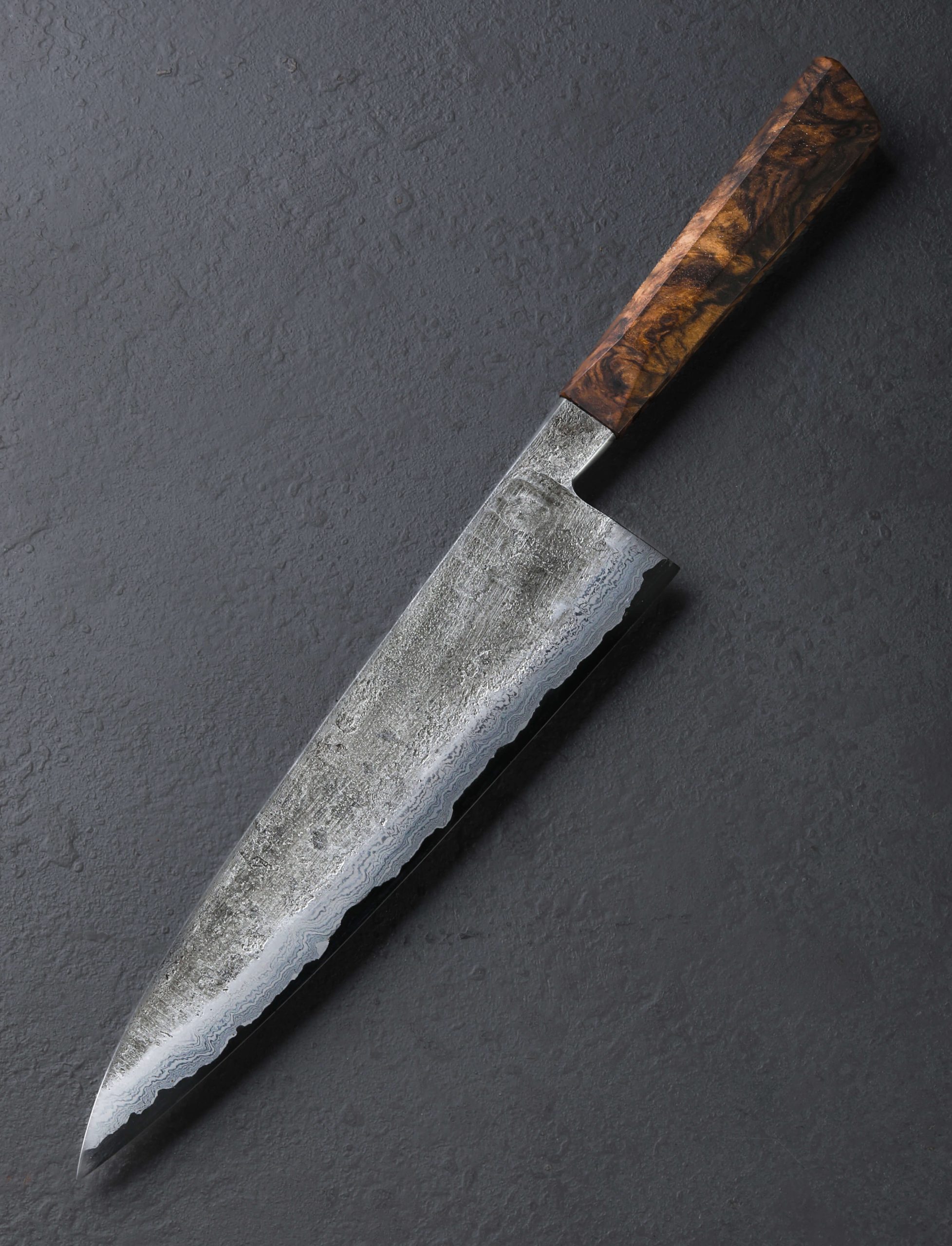 Bladesmith Timo Verschuren of the Netherlands has delivered a gyuto that combines a rustic, hand-hewn aesthetic with thoughtful finishes tip to heel, all in a versatile, all-business form designed as the chef’s go-to daily prep tool. Forged by hand in-house, Timo begins by crafting a simple suminagashi pattern of reclaimed wrought iron and o2 high-carbon steel of around 60 layers per side. This damascus then jackets a core of solid o2 which forms the thin, hard, hair-popping sharp cutting edge. Forge-finished flats which bare the hammer marks of the blade’s handcrafted origins give way to the visible patterning of the outer material, and finally, to the highly polished final portion of the primary bevels. Those bevels, low and convex throughout, are shaped with care and precision to deliver a hardworking and versatile edge to the chef’s cutting board. Mass is maintained with excellent balance to provide both the toughness and finesse needed of an all-around culinary tool, the blade’s rounded spine adding to this mission with a full-distal taper that culminates at a razor-thin tip. From big chopping tasks to delicate slices and detail work, this 228mm / 9″ gyuto is the tool for the job. Balancing around an inch in front of the 55mm-tall heel, the knife is natural and steady in the hand, gripped by a beautiful handle of sculpted Turkish Walnut.