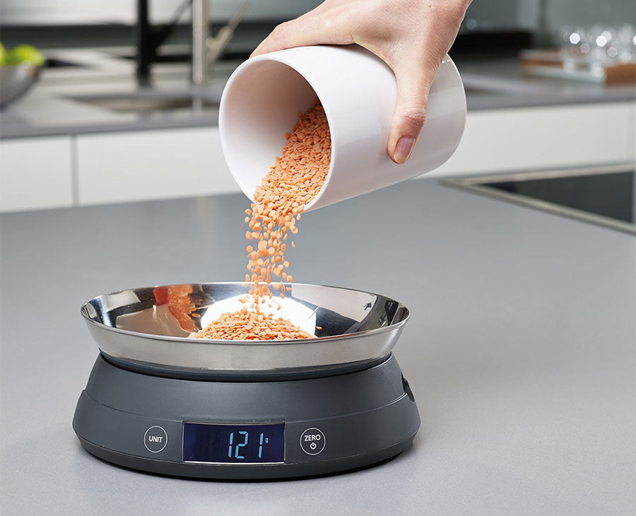 These clever digital scales can be used either by placing the items directly onto the scales using your own bowls, or, if you flip the top over, it becomes a measuring bowl itself.