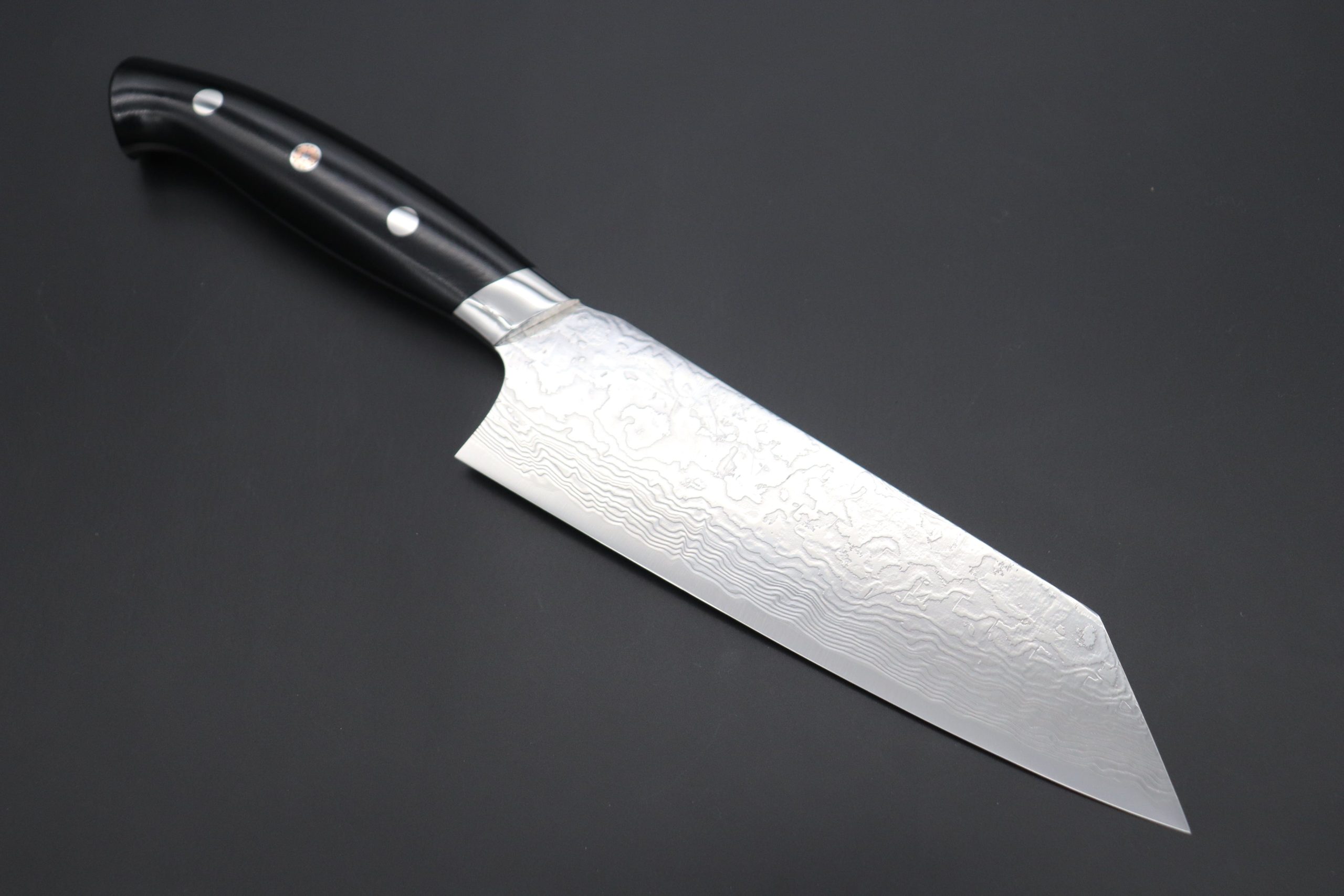 The polished, slanted stainless steel bolster is a distinctive design element that not only gives an impression of ‘forward movement’ and ‘agility’, but also improves blade balance and the durability of the handle. The perfectly contoured Black Linen Micarta® handle scales, which has a simple solid black color. Black Linen Micarta® is a very practical handle material for kitchen knife because it is very durable, resistant to both water and shrinkage and provides good traction even when it is wet. Consequently, this knife handle provides a very secure and comfortable grip.