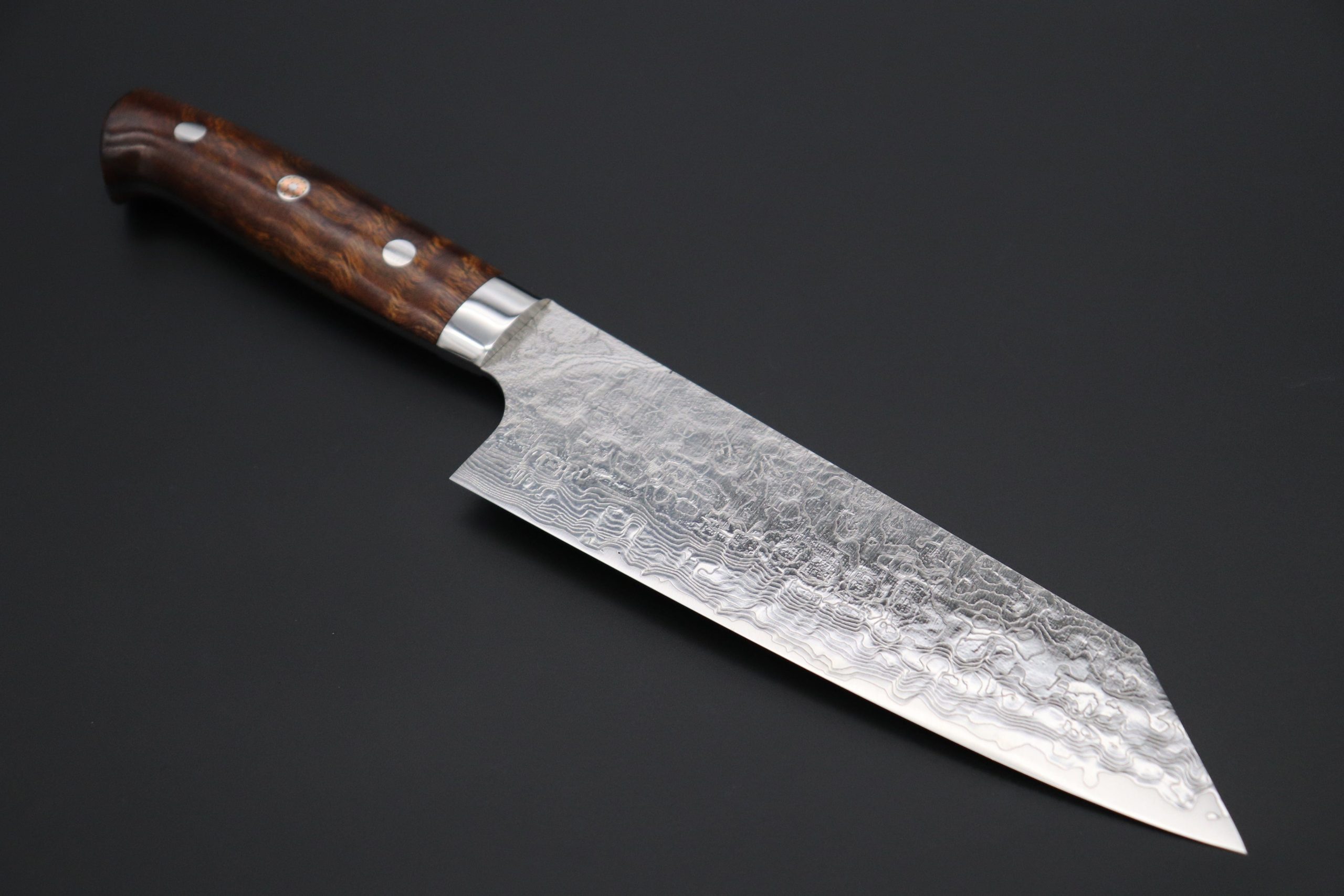 After testing and evaluating a very reputable Powdered Metallurgy High Speed Tool Steel, called “R-2” (Manufactured by Kobelco), he decided to produce an exciting new range of this traditionally hammer-forged Damascus kitchen knife using this modern ‘super steel’.