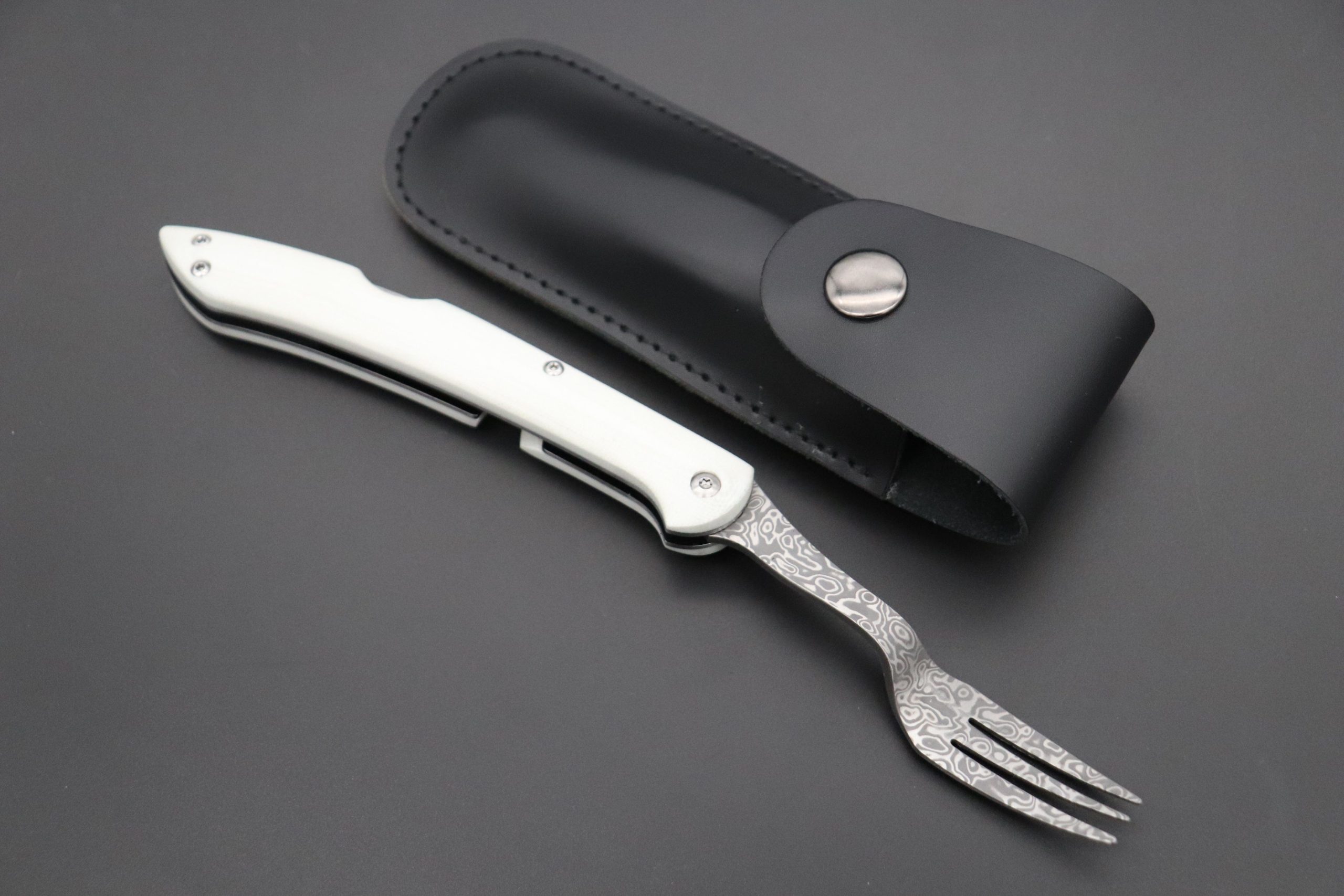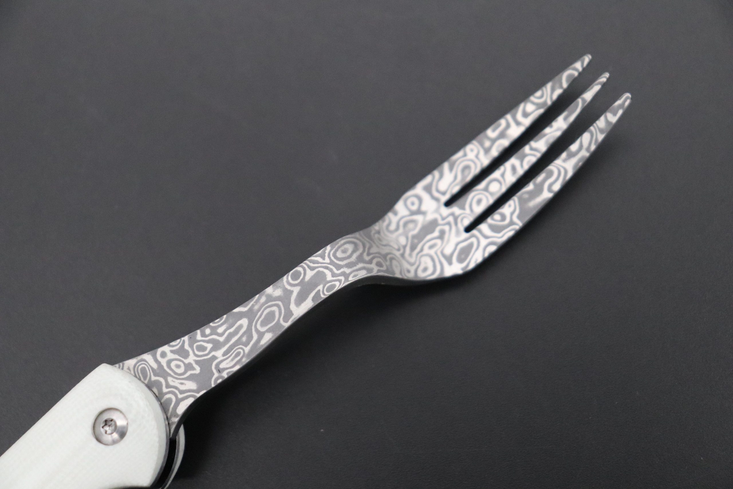 Takeshi Saji R-2 Damascus Folding Fork (White G-10 Handle, TS-130W)