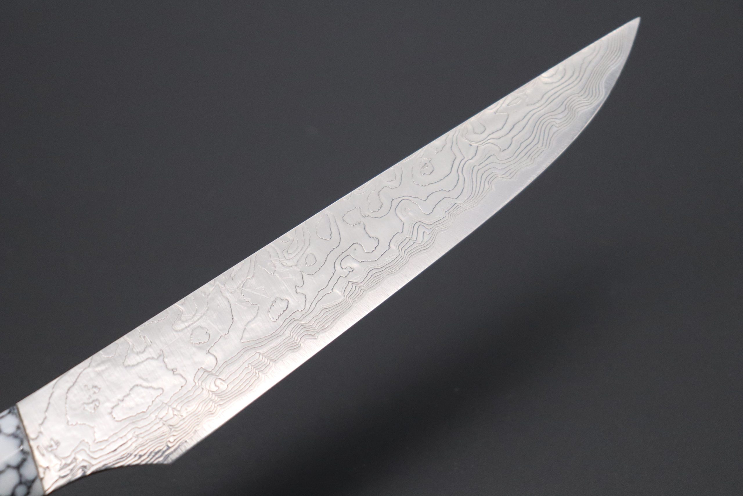 Mirror Polished R-2 Damascus blade, which features unique ‘random Damascus’ pattern, which Master Saji calls “Diamond Damascus”. It is handcrafted using a complex series of forging processes and undergoes a specially formulated acid etching and polishing process. When combined, these techniques produce a unique Damascus blade, which has an uneven surface texture that sparkles beautifully, like a cluster of cut diamonds.