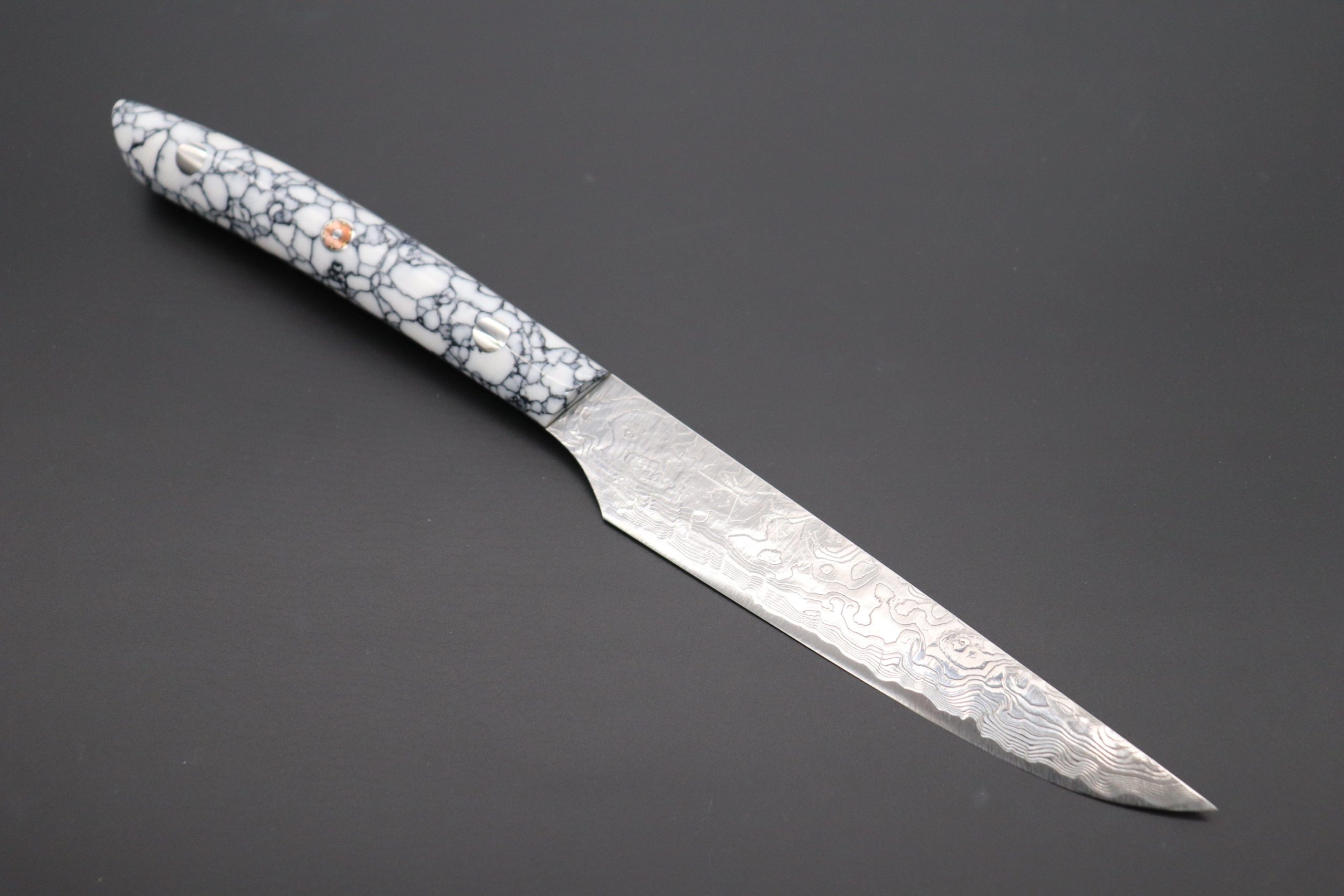 The White Turquoise Gem-Composite Stone Handle has a beautiful appearance and to ensure that it can be gripped comfortably, it has been carefully contoured and polished by hand. A decorative Mosaic Pin secures the handles scales. This Steak Knife is produced for only 1Pc this time