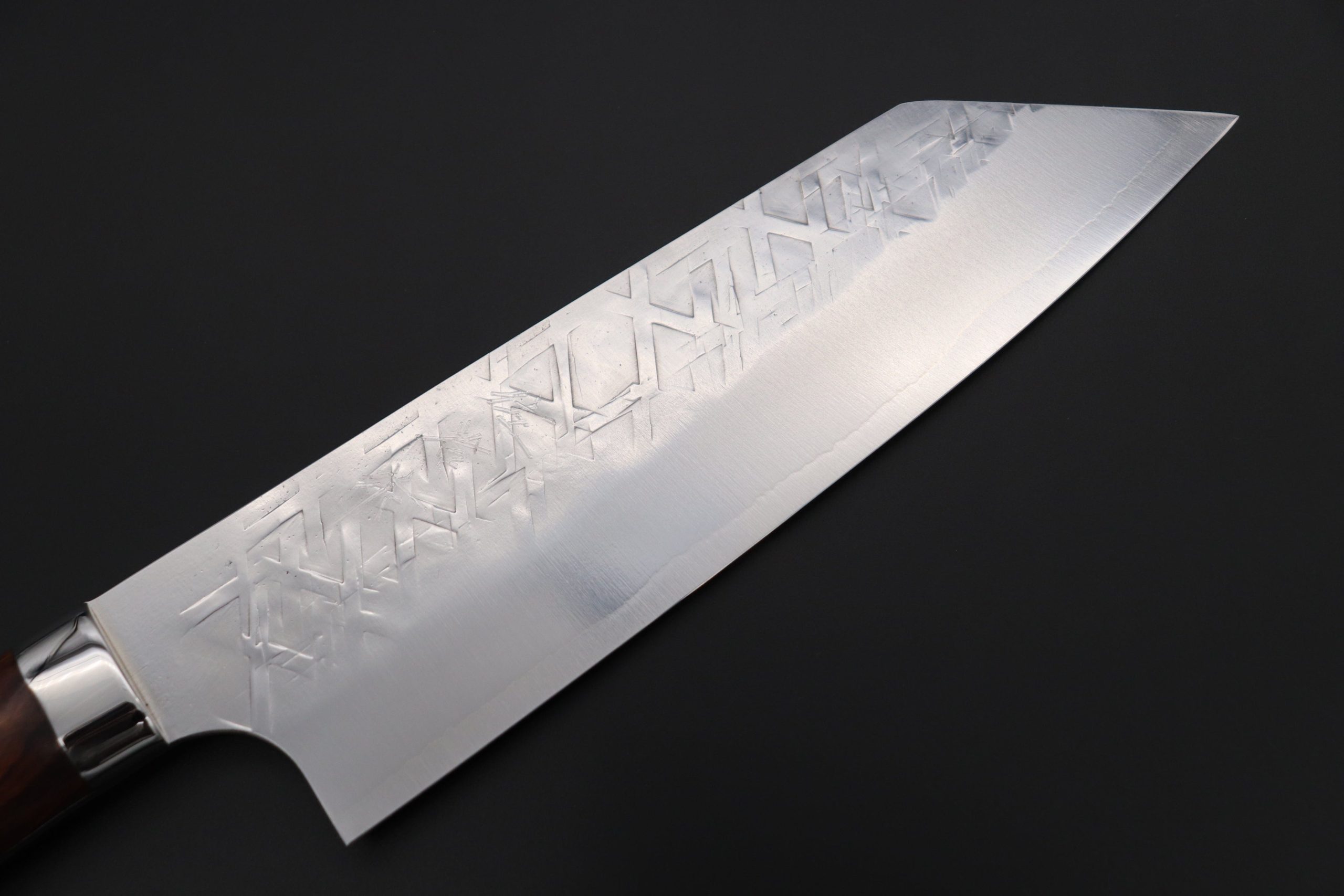 The attractive shiny SRS-13 blade core of these knives contrasts strongly against the textured, soft stainless steel outer cladding layers. The hand-contoured Desert Ironwood Handle provides a secure grip and extra durability. Unlike the bland machine-produced handles of regular Western-style knives, when we grip the handles of Takeshi Saji’s knives, we can feel the warmth of the craftsman’s vision for his entire handle making process – They are truly something special to own, hold and use. The custom handcrafted handles perfectly match his handcrafted, Traditional hammer forged blades, which have much more ‘soul”. Master Saji’s knives are also fitted with a polished stainless steel bolster for improved handle durability and blade balance. So, taken as a complete package, these knives are not only visually striking, they are also highly practical and easy to care for.