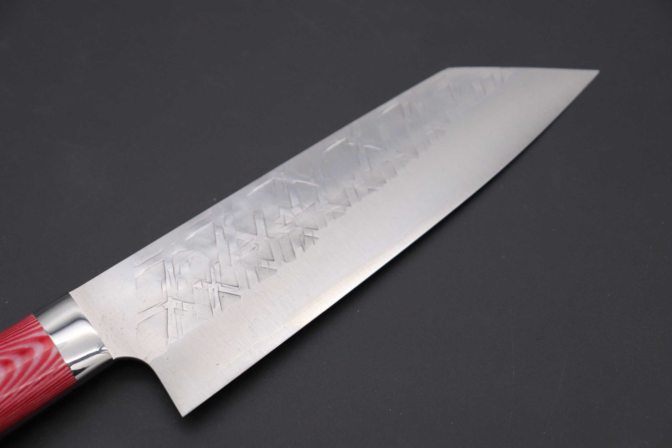 The attractive shiny SRS-13 blade core of these knives contrasts strongly against the textured, soft stainless steel outer cladding layers. The hand-contoured Red&White Linen Micarta Handle provides a secure grip and extra durability. Unlike the bland machine-produced handles of regular Western-style knives, when we grip the handles of Takeshi Saji’s knives, we can feel the warmth of the craftsman’s vision for his entire handle making process – They are truly something special to own, hold and use. The custom handcrafted handles perfectly match his handcrafted, Traditional hammer forged blades, which have much more ‘soul”. Master Saji’s knives are also fitted with a polished stainless steel bolster for improved handle durability and blade balance. So, taken as a complete package, these knives are not only visually striking, they are also highly practical and easy to care for.