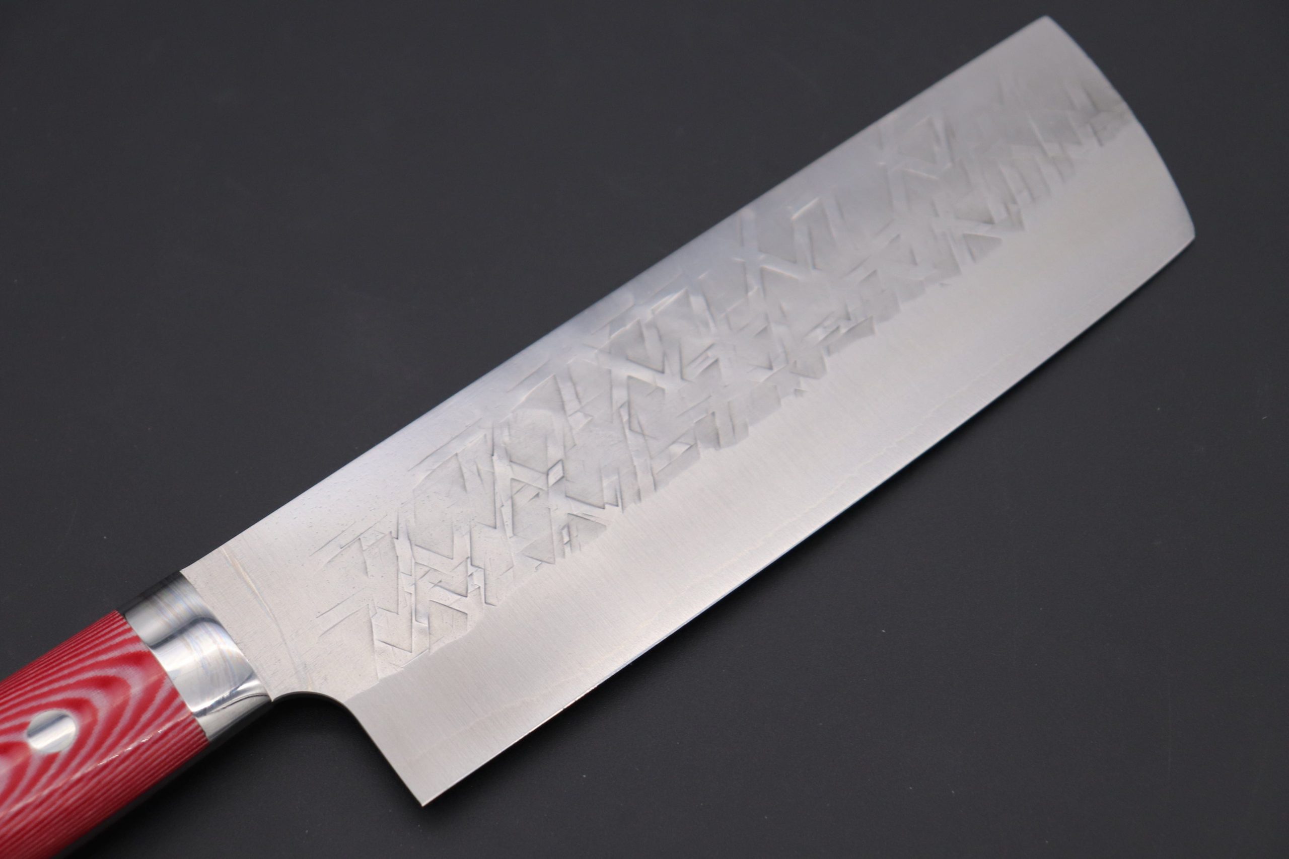 The attractive shiny SRS-13 blade core of these knives contrasts strongly against the textured, soft stainless steel outer cladding layers. The hand-contoured Red&White Linen Micarta Handle provides a secure grip and extra durability. Unlike the bland machine-produced handles of regular Western-style knives, when we grip the handles of Takeshi Saji’s knives, we can feel the warmth of the craftsman’s vision for his entire handle making process – They are truly something special to own, hold and use. The custom handcrafted handles perfectly match his handcrafted, Traditional hammer forged blades, which have much more ‘soul”. Master Saji’s knives are also fitted with a polished stainless steel bolster for improved handle durability and blade balance. So, taken as a complete package, these knives are not only visually striking, they are also highly practical and easy to care for.