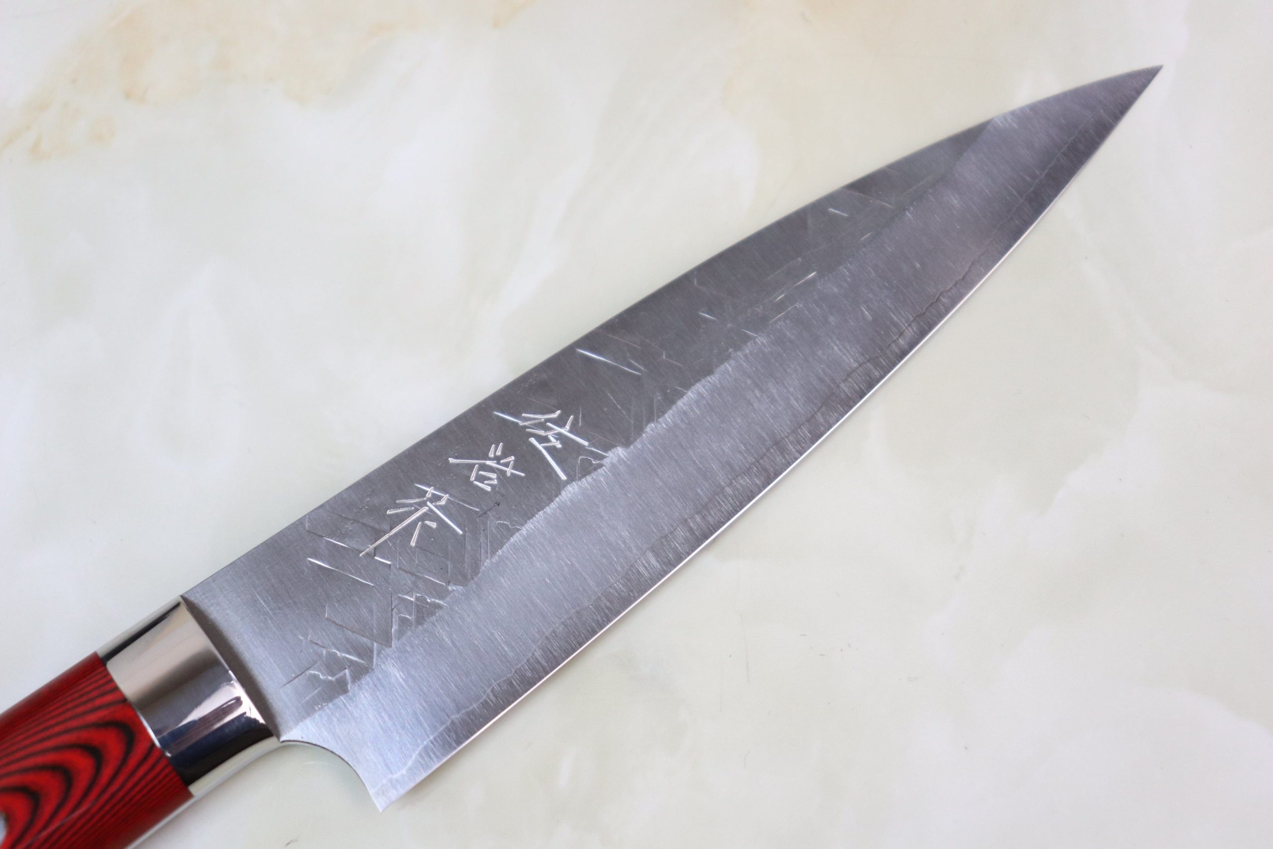 The attractive shiny SRS-13 blade core of these knives contrasts strongly against the textured, soft stainless steel outer cladding layers. The hand-contoured Red&Black Linen Micarta Handle provides a secure grip and extra durability. Unlike the bland machine-produced handles of regular Western-style knives, when we grip the handles of Takeshi Saji’s knives, we can feel the warmth of the craftsman’s vision for his entire handle making process – They are truly something special to own, hold and use. The custom handcrafted handles perfectly match his handcrafted, Traditional hammer forged blades, which have much more ‘soul”. Master Saji’s knives are also fitted with a polished stainless steel bolster for improved handle durability and blade balance. So, taken as a complete package, these knives are not only visually striking, they are also highly practical and easy to care for.