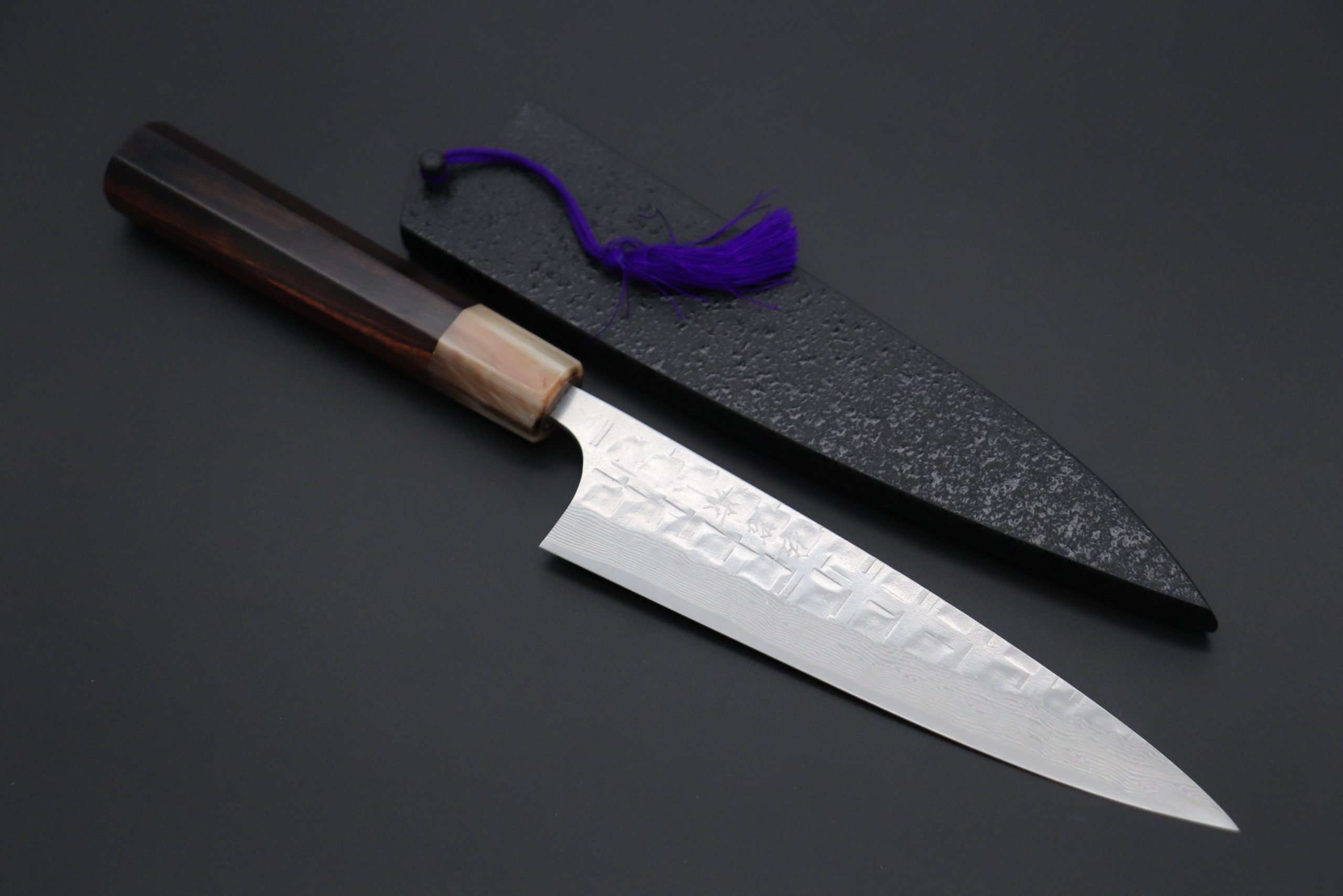 This Custom Limited Edition Takeshi Saji VG-10 Damascus Wa Petty Knife features a natural, stylish octagonal Desert Ironwood handle with a marble-colored water buffalo horn ferrule. For safekeeping, the knife includes a matching black lacquered wooden saya (sheath) with a black pakkawood saya pin.