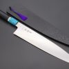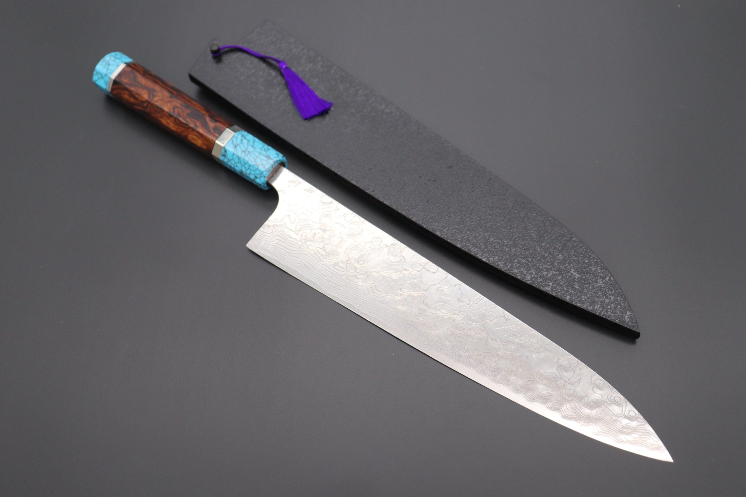 This Custom Limited Edition Takeshi Saji R-2 Damascus Wa Gyuto Knife with Contemporary, Stylish Wa Handle. The Innovative Octagonal Desert Ironwood handle with a Turquoise Composite Stone Ferrule & Butt with Nickel Silver Spacers. For safekeeping, this knife comes with a matching Black Lacquered wood Saya (Sheath) with a black pakkawood Saya pin.