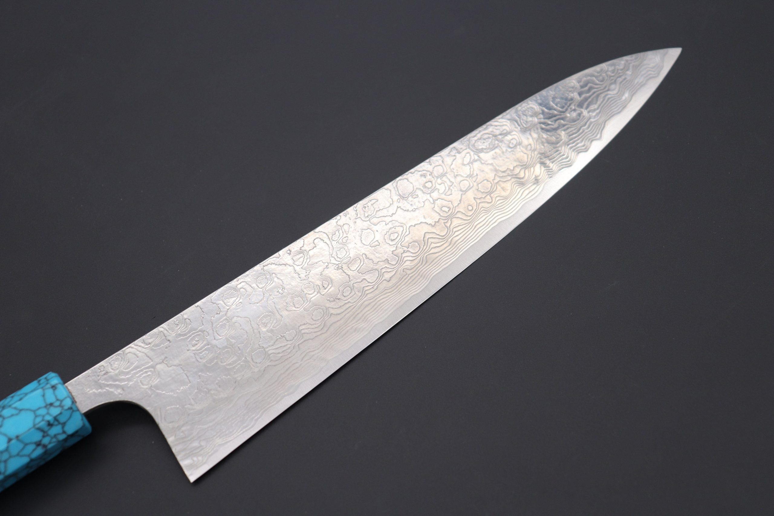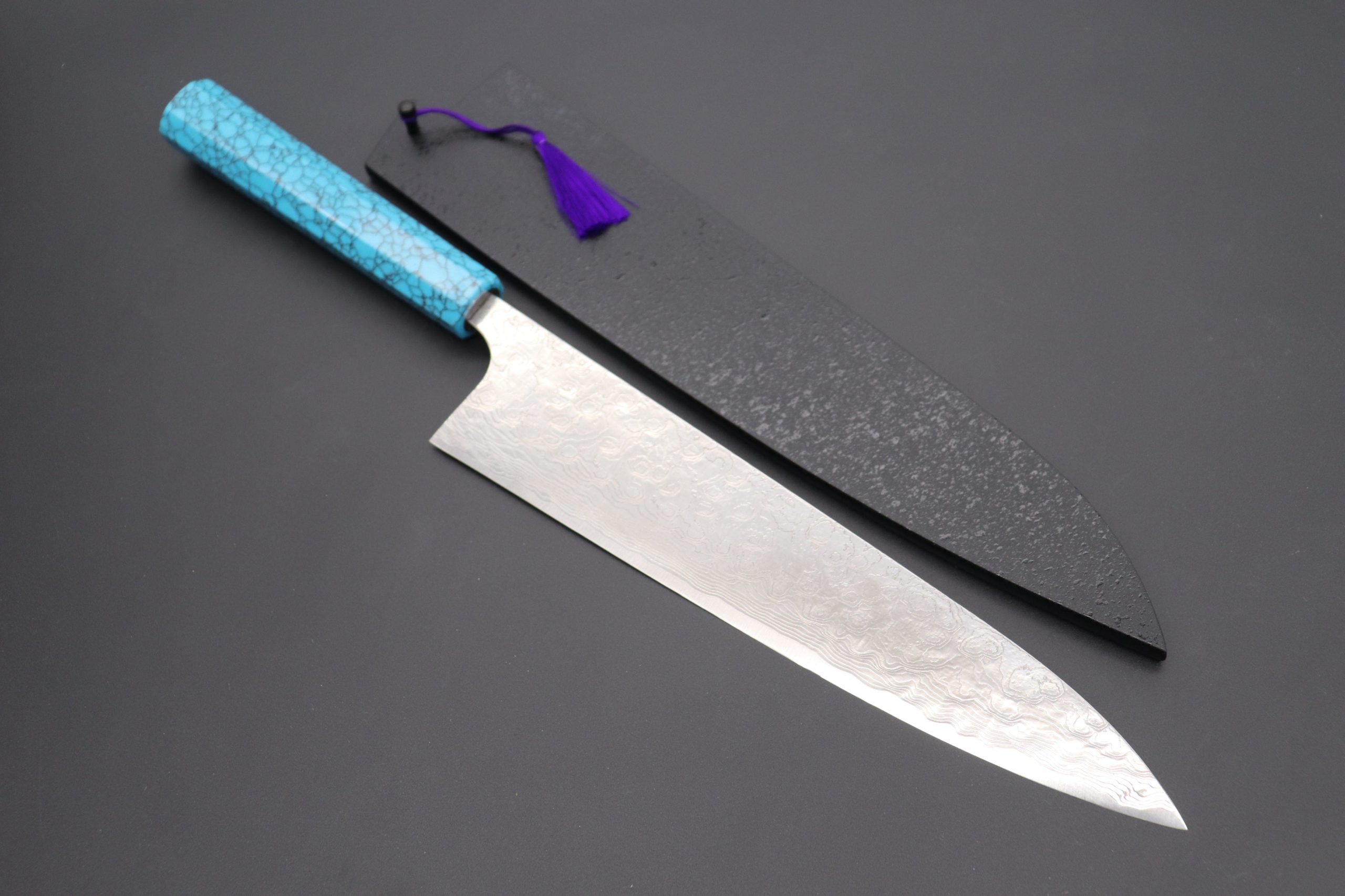 This Custom Limited Edition Takeshi Saji R-2 Damascus Wa Gyuto Knife with Contemporary, Stylish Wa Handle. The Innovative Octagonal Turquoise Gem-Composite Stone Handle. For safekeeping, this knife comes with a matching Black Lacquered wood Saya (Sheath) with a black pakkawood Saya pin.