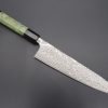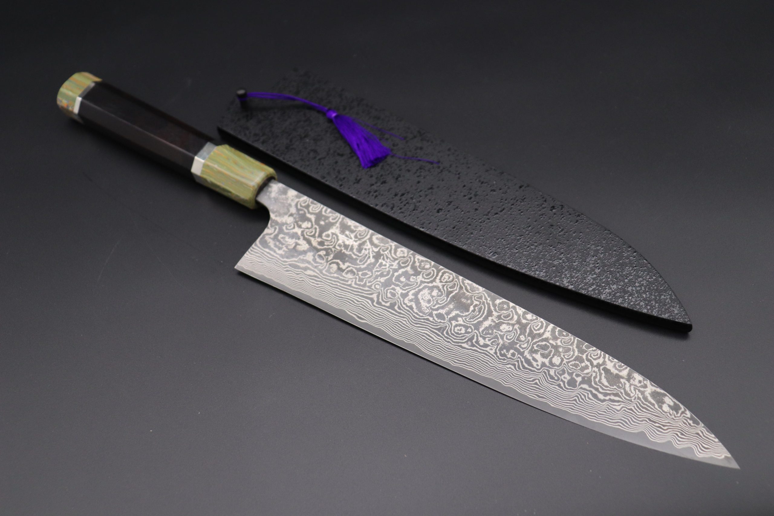 This Custom Limited Edition Takeshi Saji R-2 Damascus Wa-Gyuto Knife with Contemporary, Stylish Wa Handle and a matching Black Lacquered wood Saya (Sheath) with a black pakkawood Saya pin. The Innovative a Innovative Octagonal Ebony wood handle with a Fancy Green Color Composite Stone Ferrule & Butt with Nickel Silver Spacers.