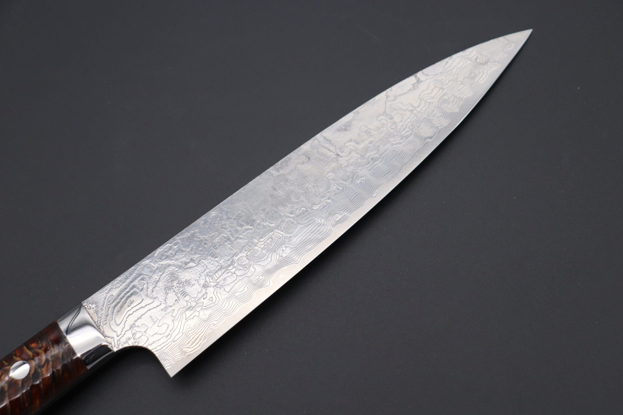 Mirror Polished R-2 Damascus blade, which features unique ‘random Damascus’ pattern, which Master Saji calls “Diamond Damascus”. It is handcrafted using a complex series of forging processes and undergoes a specially formulated acid etching and polishing process. When combined, these techniques produce a unique Damascus blade, which has an uneven surface texture that sparkles beautifully, like a cluster of cut diamonds.
