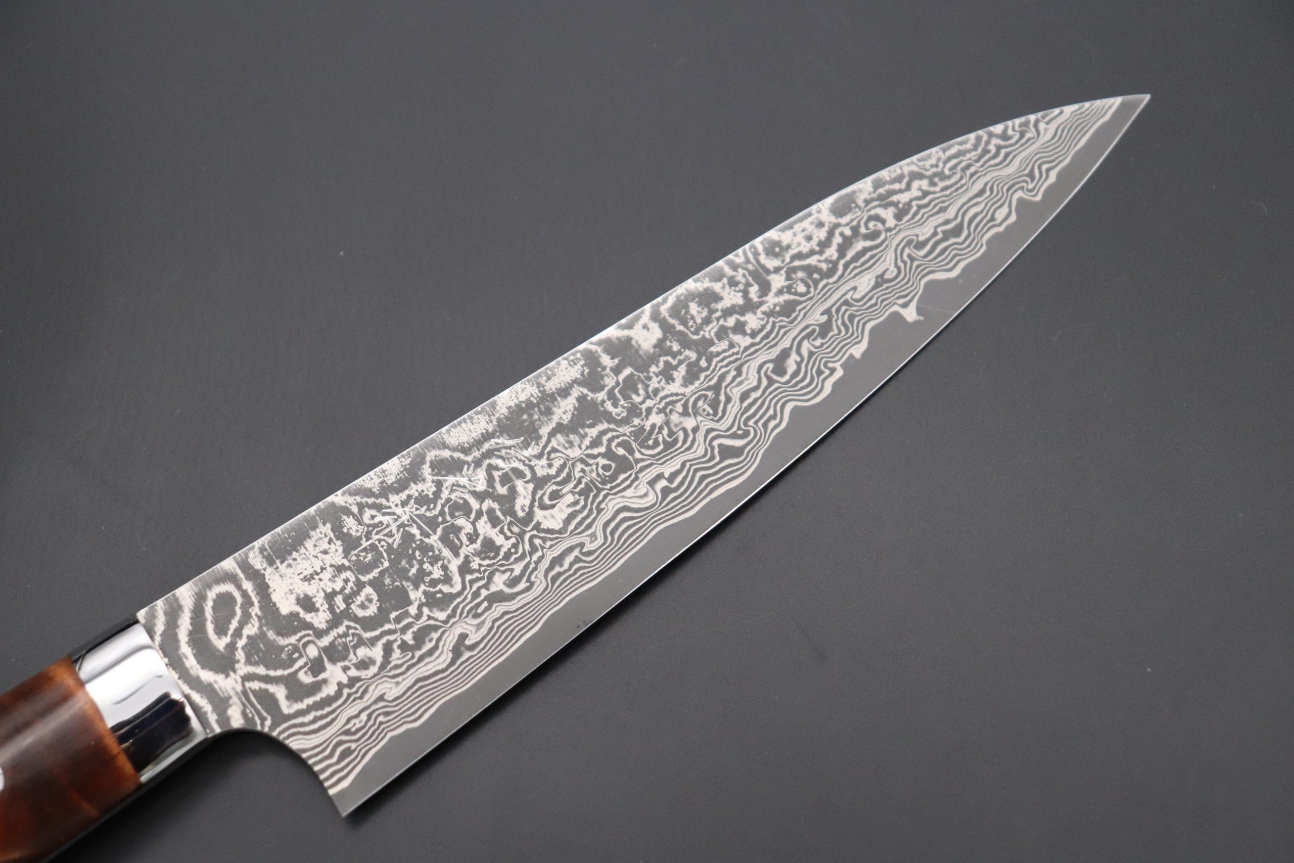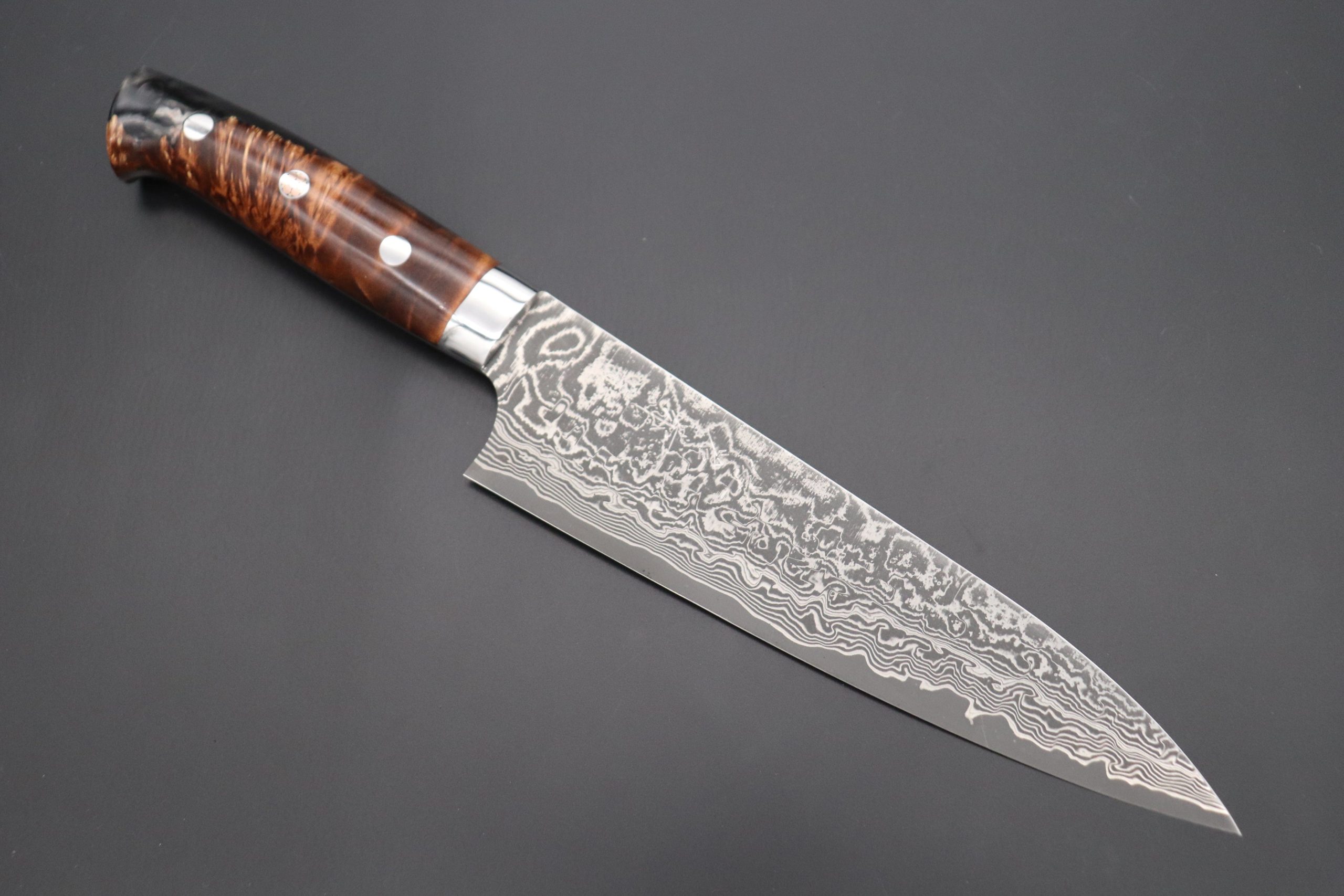 After testing and evaluating a very reputable Powdered Metallurgy High Speed Tool Steel, called “R-2” (Manufactured by Kobelco), he decided to produce an exciting new range of this traditionally hammer-forged Damascus kitchen knife using this modern ‘super steel’.