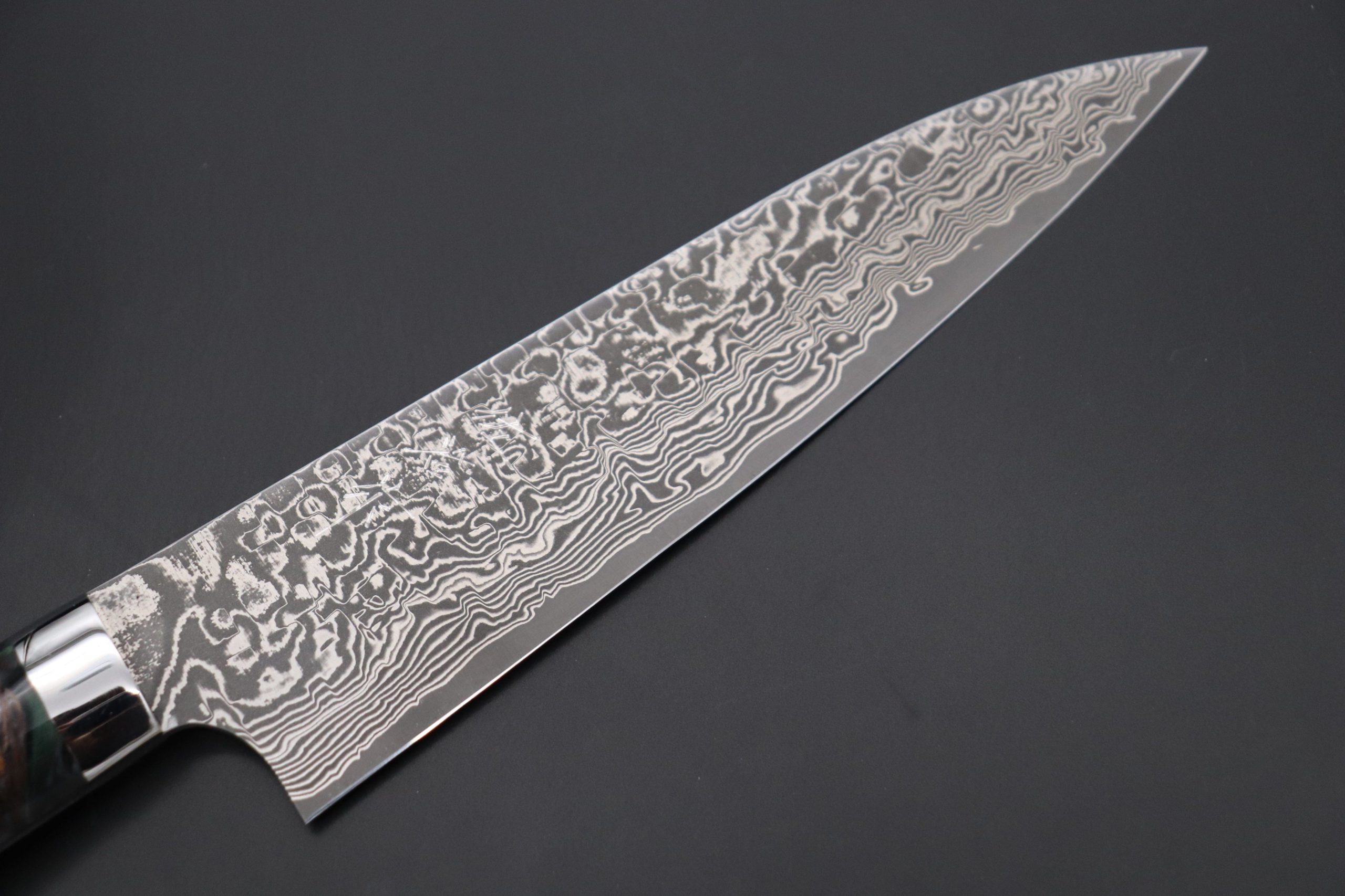A dark R-2 Damascus blade, which features a crisp and vigorous Damascus pattern, the energetic style of the Damascus blade. It is handcrafted using a complex series of forging processes and undergoes a specially formulated acid etching process.