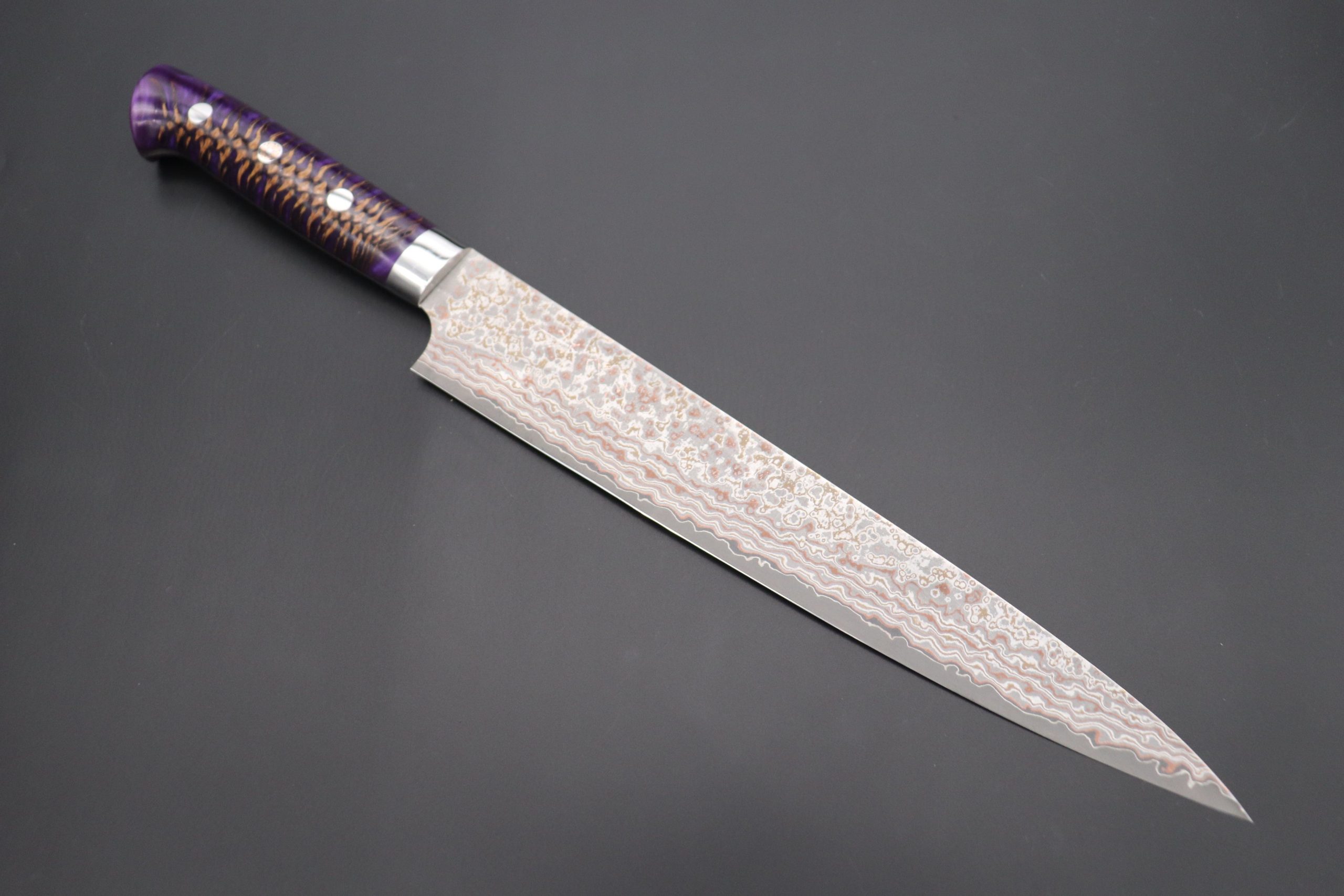 Knife Model: Takeshi Saji SUMMIT ― Limited Edition Custom Series SMT-754 VG-10W Multi-Colored Golden-Rainbow Damascus Sujihiki 240mm