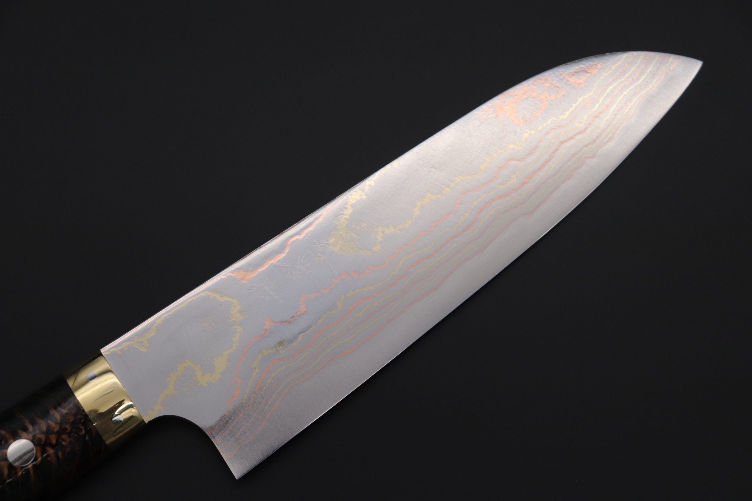 Blue #2 high-carbon steel that is clad with multiple layers of rust-resistant stainless steel, brass and copper.