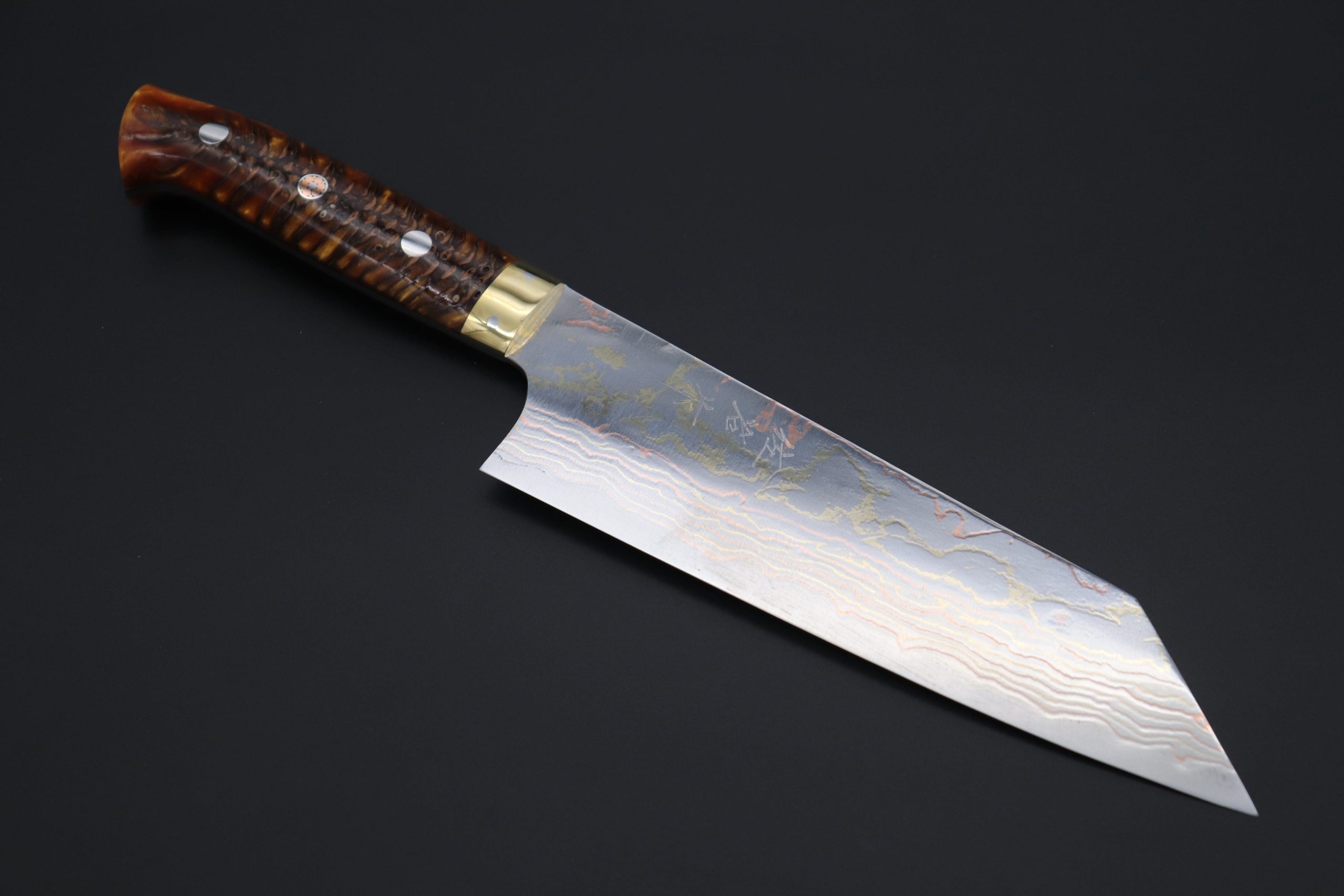 Blue #2 high-carbon steel that is clad with multiple layers of rust-resistant stainless steel, brass and copper.