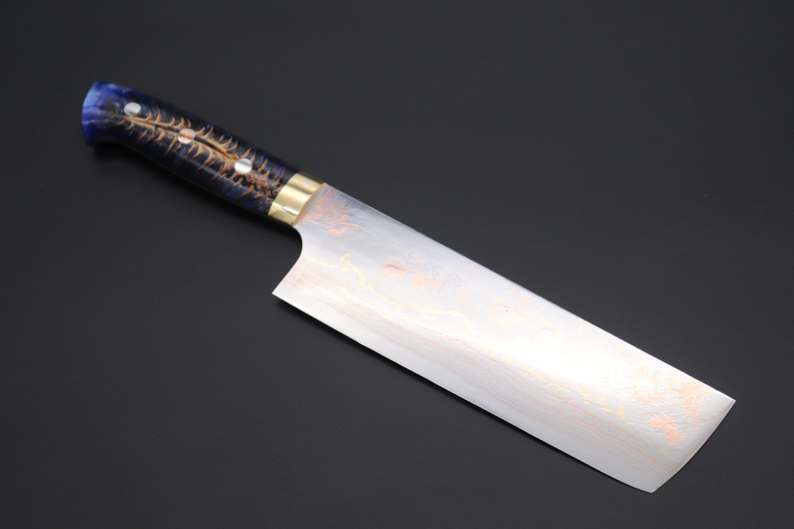 Blue #2 high-carbon steel that is clad with multiple layers of rust-resistant stainless steel, brass and copper.