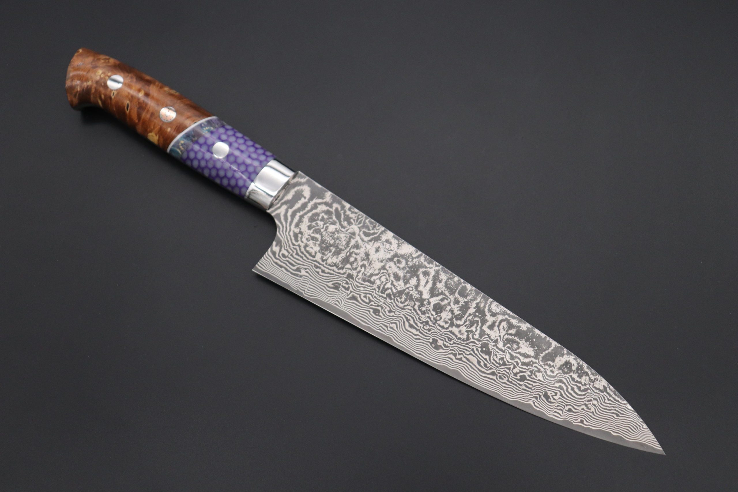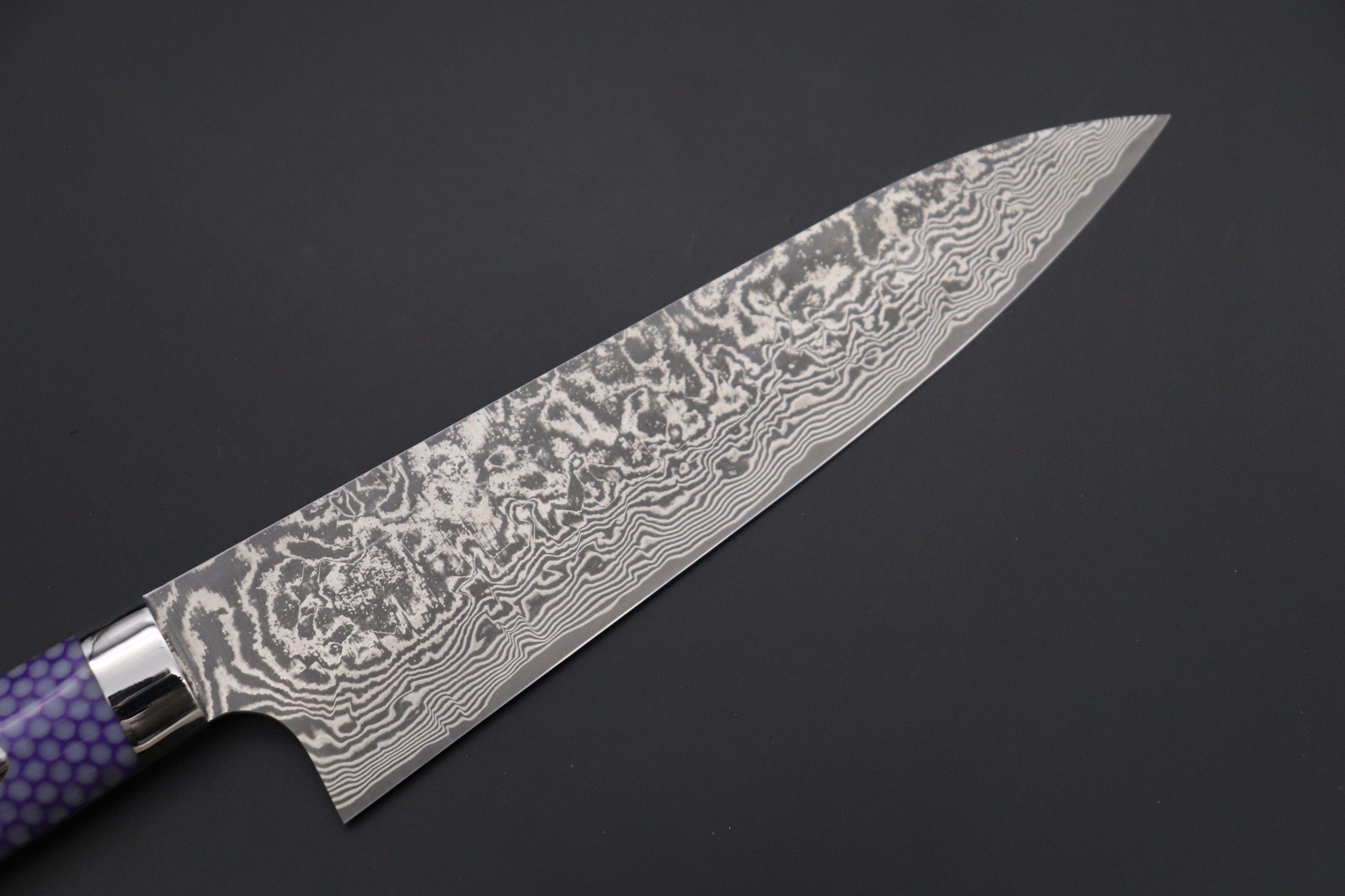 After testing and evaluating a very reputable Powdered Metallurgy High Speed Tool Steel, called “R-2” (Manufactured by Kobelco), he decided to produce an exciting new range of this traditionally hammer-forged Damascus kitchen knife using this modern ‘super steel’.
